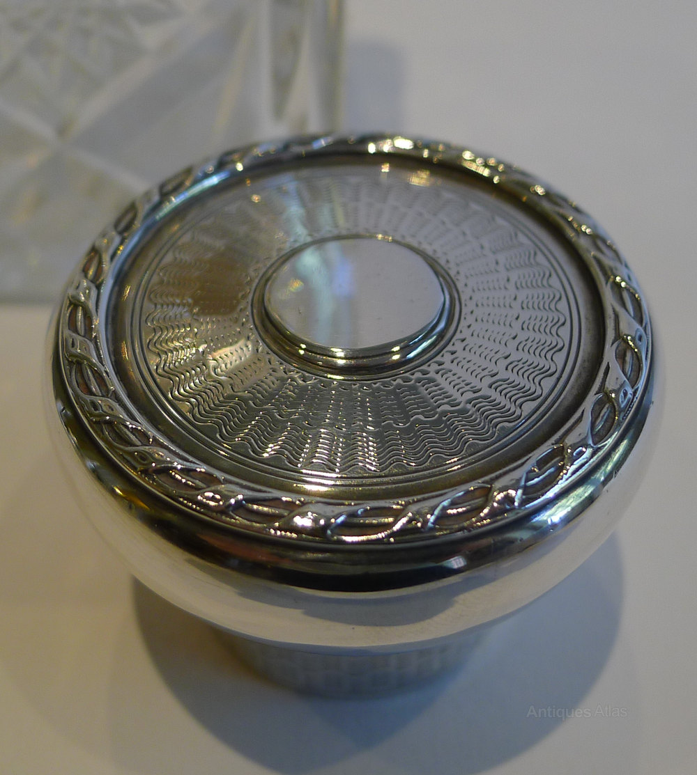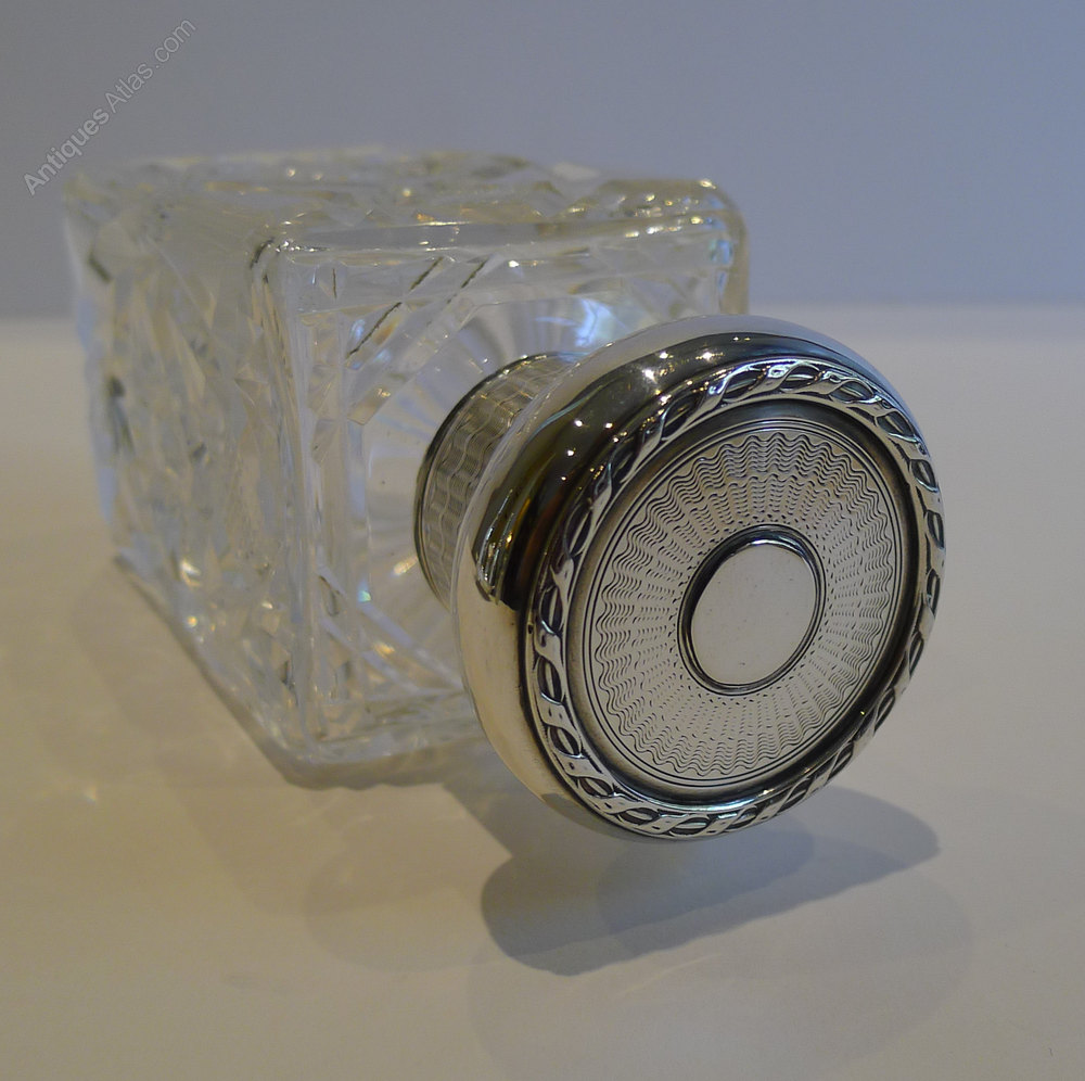 The bottle is crowned with a highly decorative sterling silver top, beautifully engine-turned with a ribbon and reed raised border frame the top. Once removed, the cut crystal stopper is revealed to keep the precious contents from evaporating.