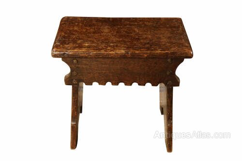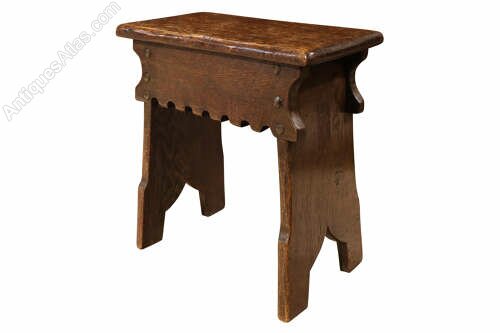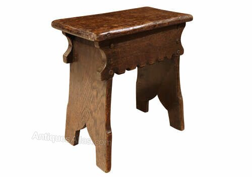 The shaped frieze apron is simply cut with a row of shallow scallops, and the stool is raised on solid slab supports with shaped feet, all firmly jointed and structurally sound. The visible pegs and nail heads throughout highlight its vernacular construction and practical origins.