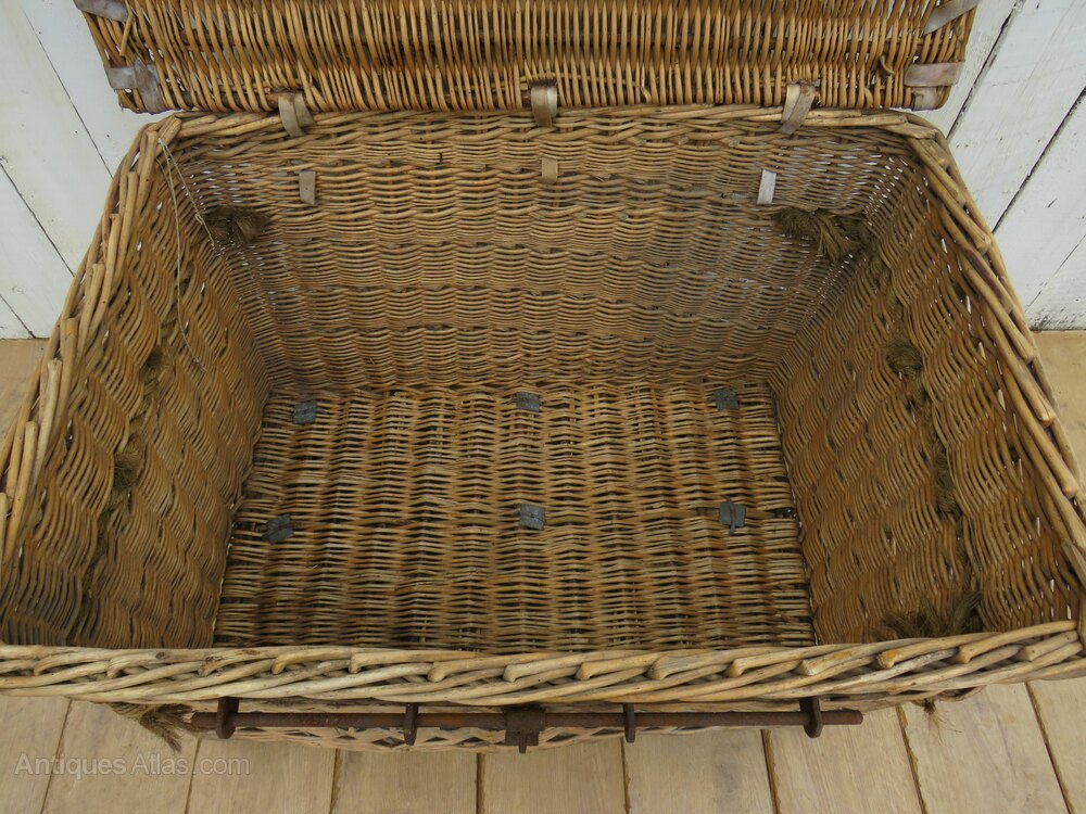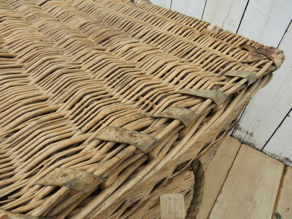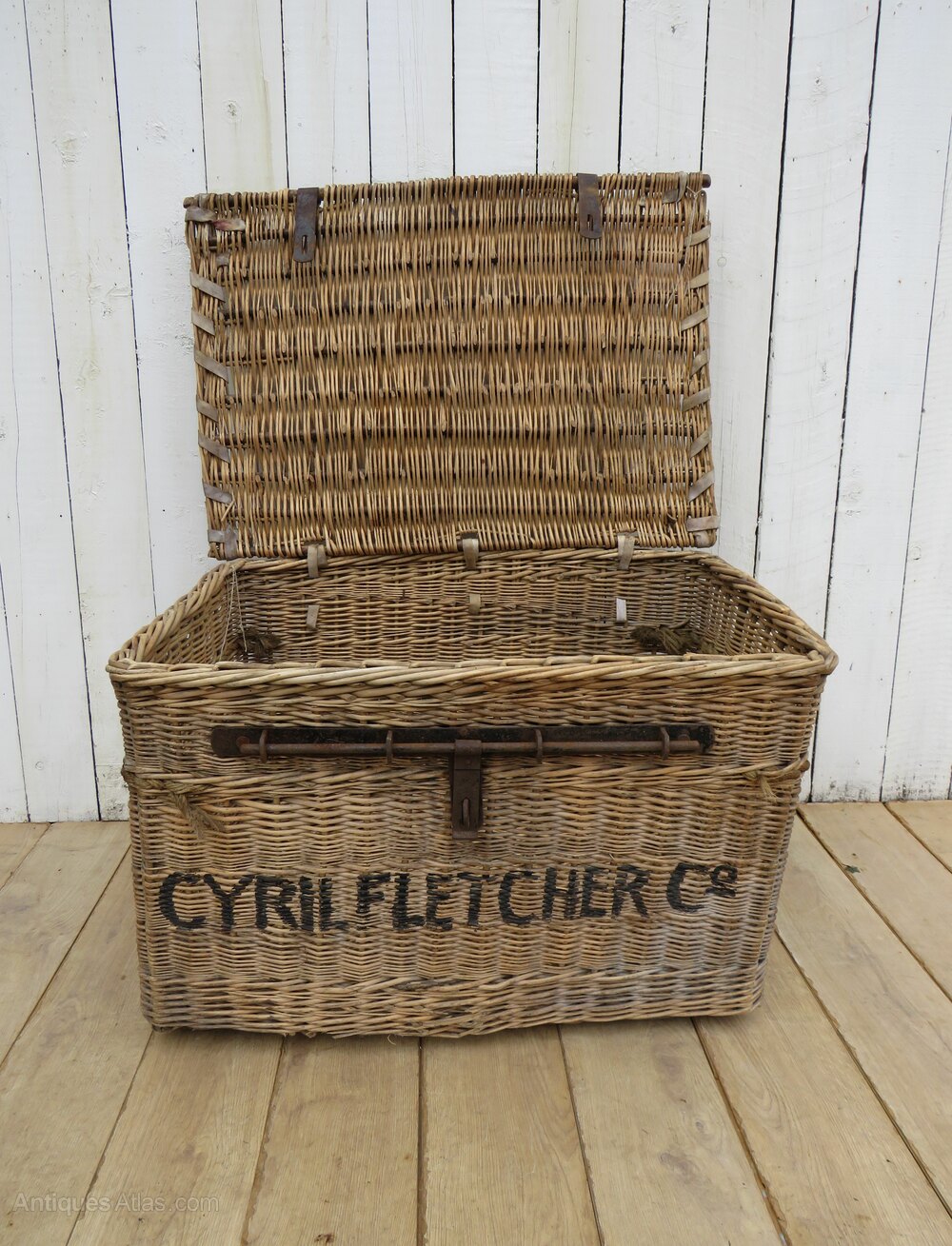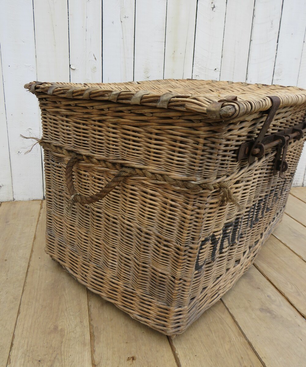 Shapely 1930-40s English industrial woven wicker storage laundry mill basket with working locking mechanism. More images available.
