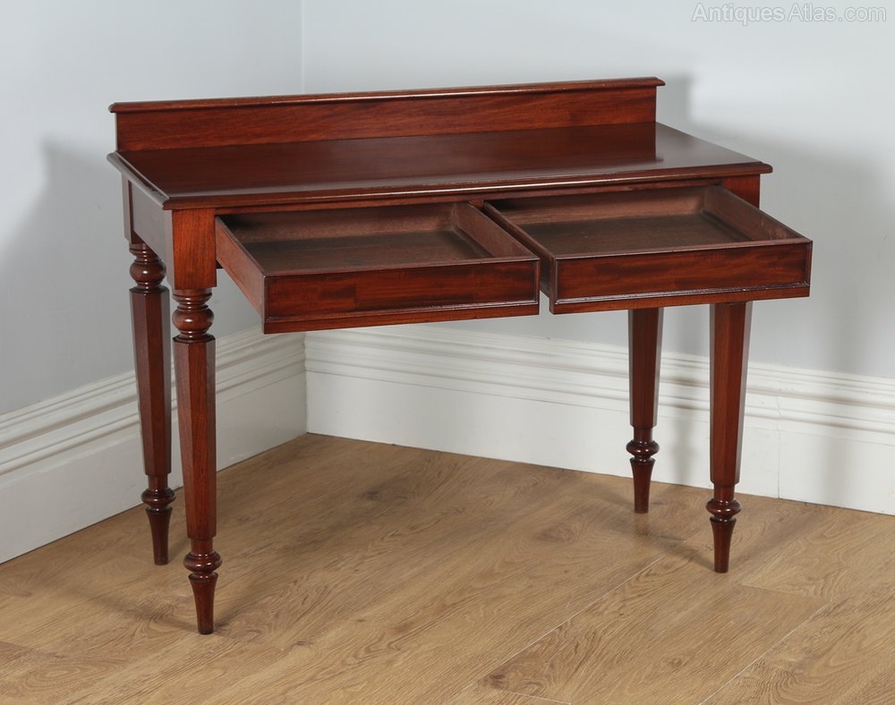 Condition This table is in good original condition. Nominal old use marks to the leading edges and legs but nothing significant considering the age of the item (see photos). There are no stains or cup marks to the tabletop. The drawers are in good working order and closes flush to the frame. As the table boasts the original polish, it has a fantastic colour and patination. This table is well constructed, solid in joint and is ready to use.