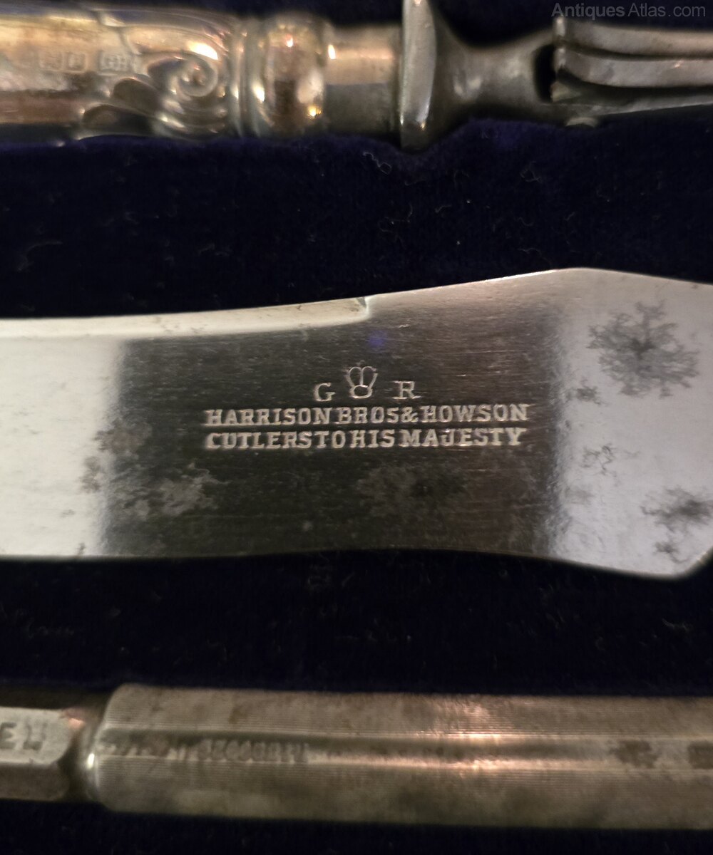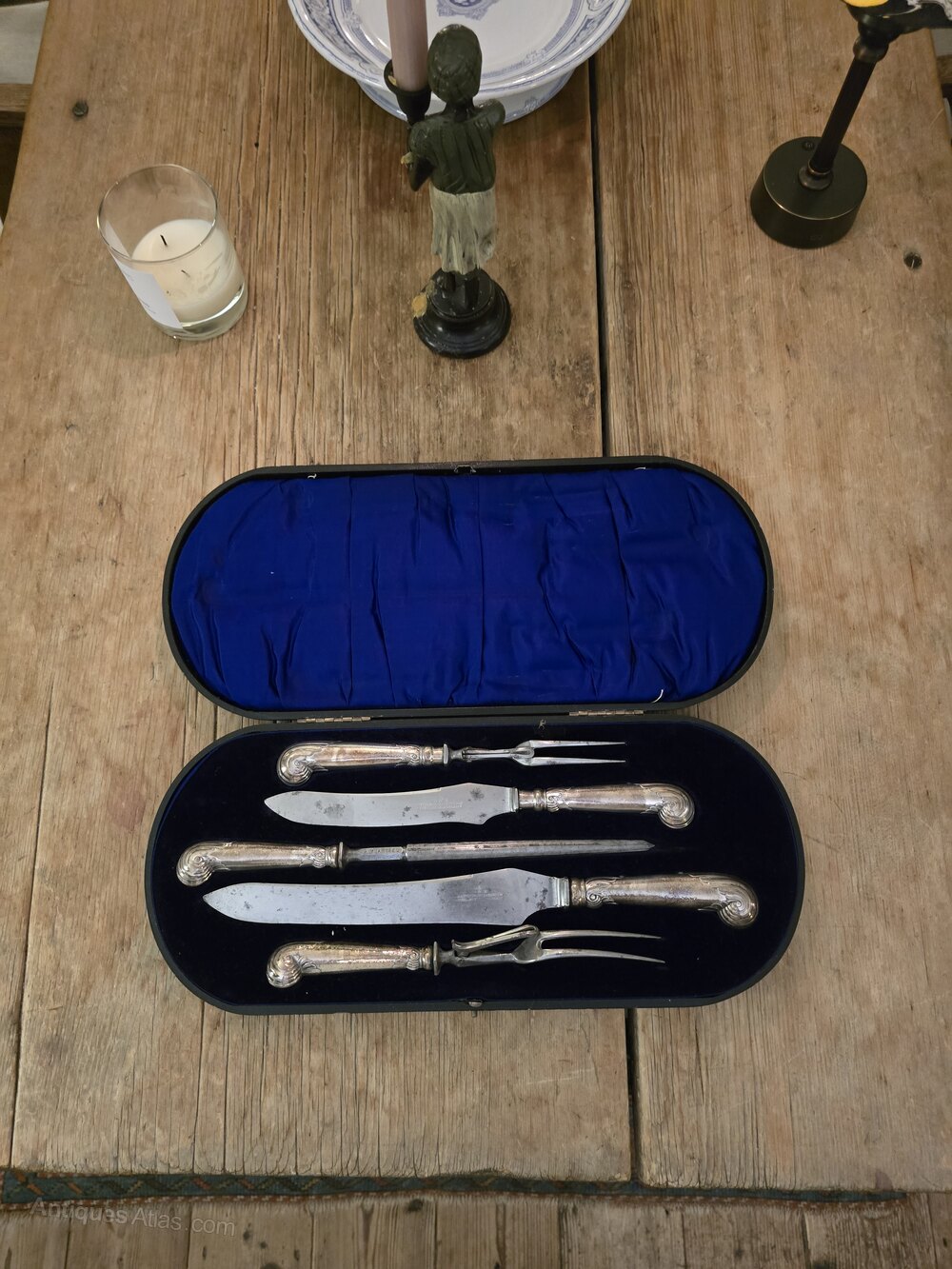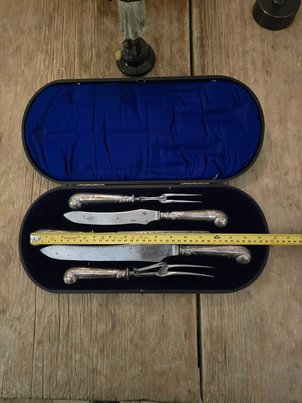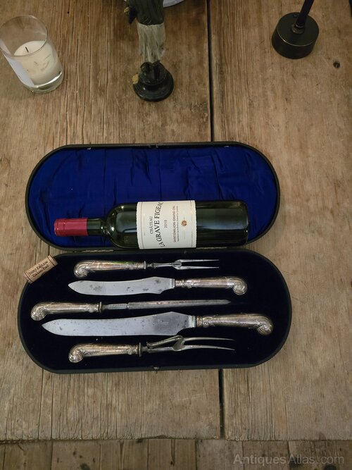 Enormous Carving Set, with Silver Pistol Handles. Wonderful untouched original condition and retaining original velvet lined case.