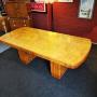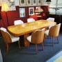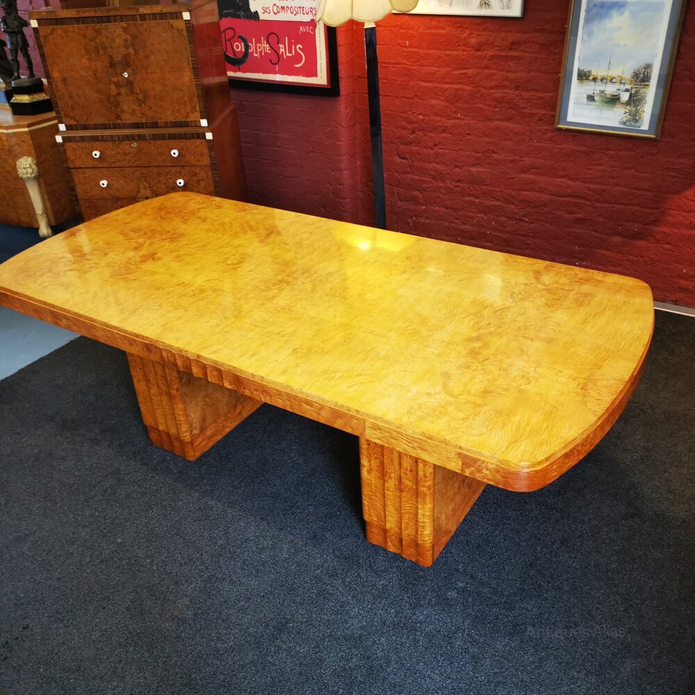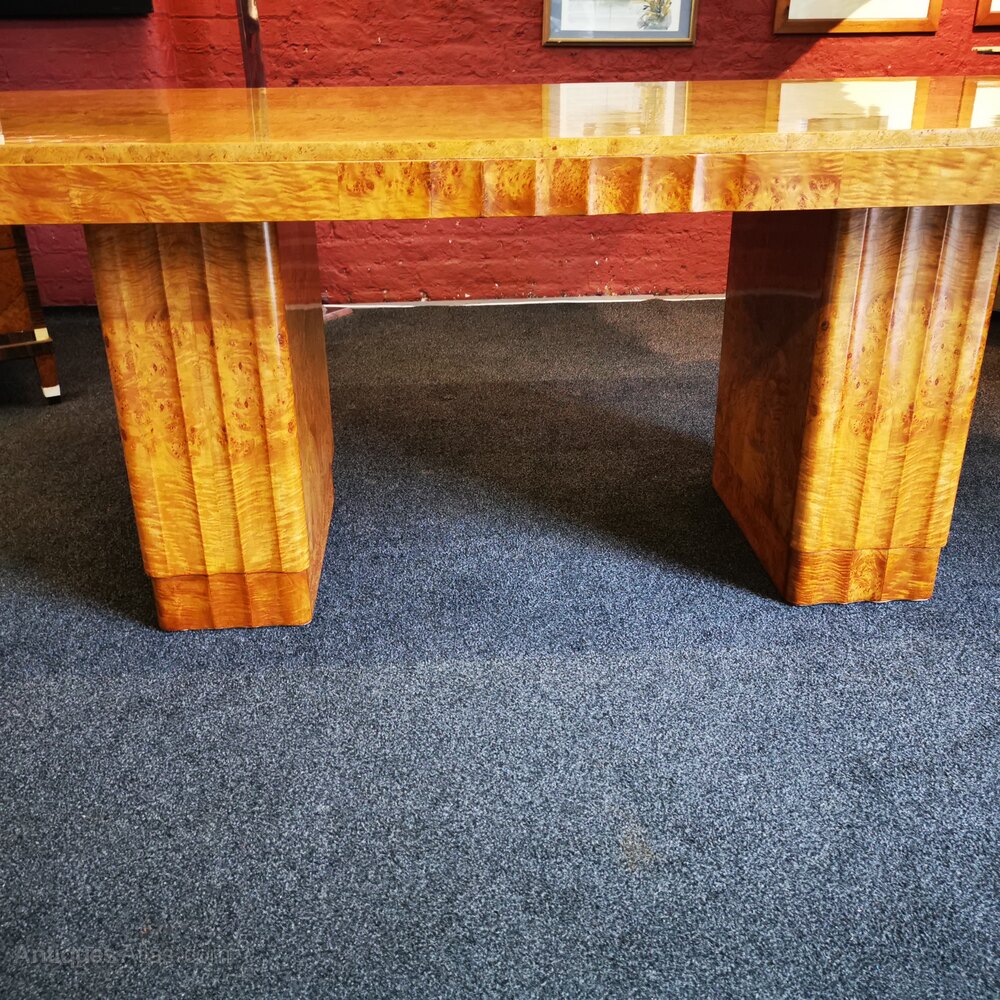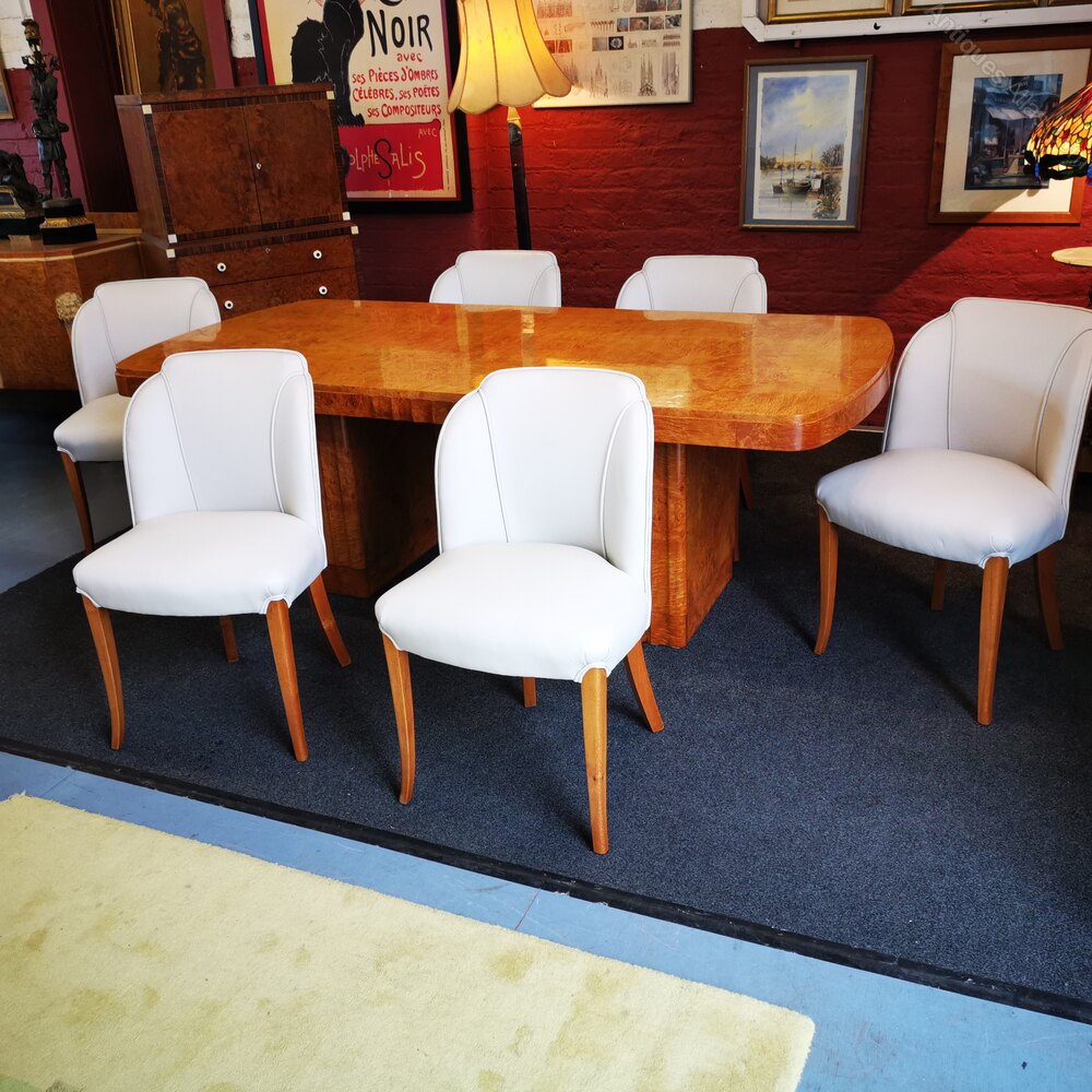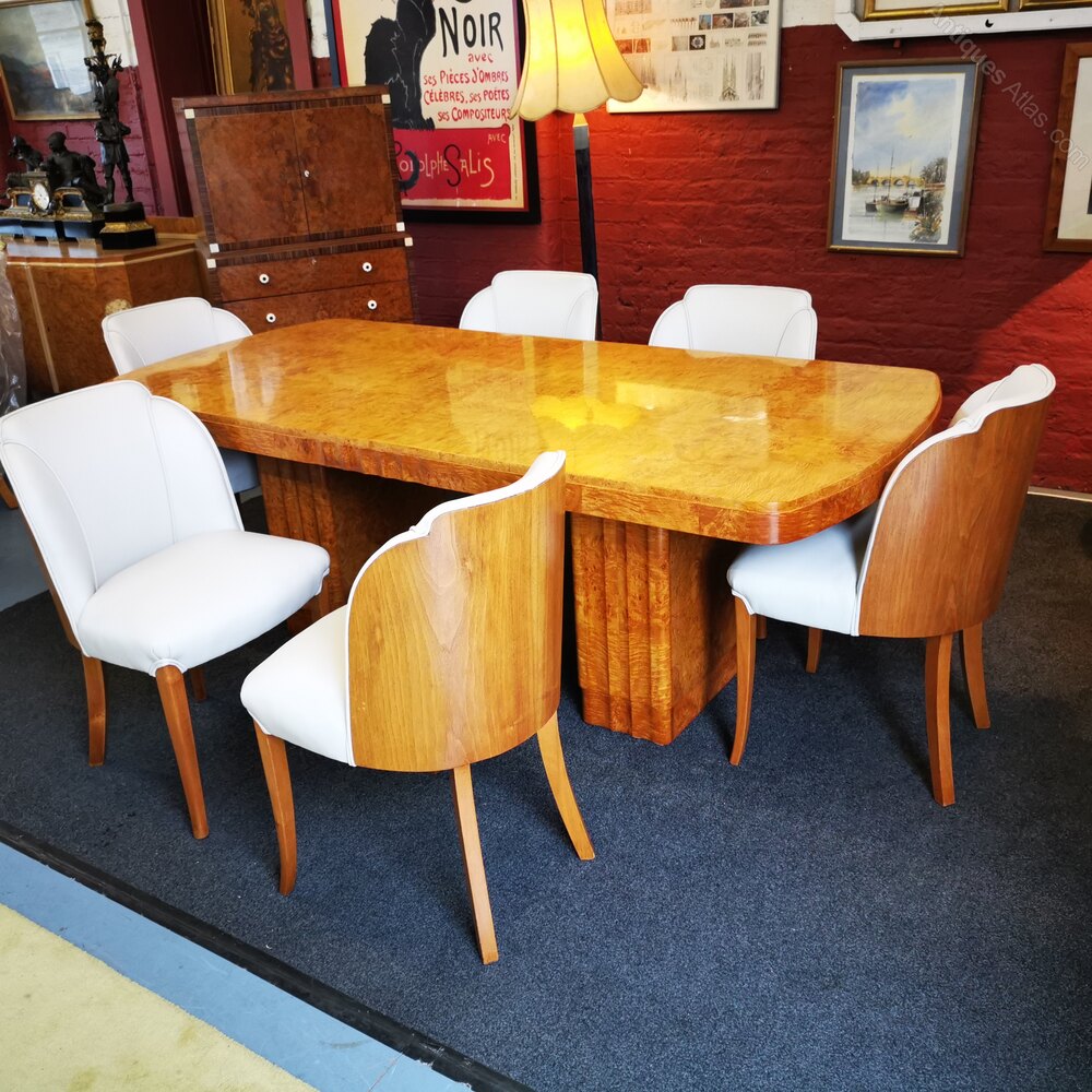 A stunning Burr Walnut Art Deco suite c 1935 Epstein Hille Adam's. The table has been recently restored and is in excellent condition. The six matching walnut cloud back armchairs were reupholstered in quality leather hides. Standing on a curved twin pedestal base, the table is 84 inches wide,40 inches deep and 31 inches high. Chairs 35 inches high, 21 inches wide, 20 inches deep.
