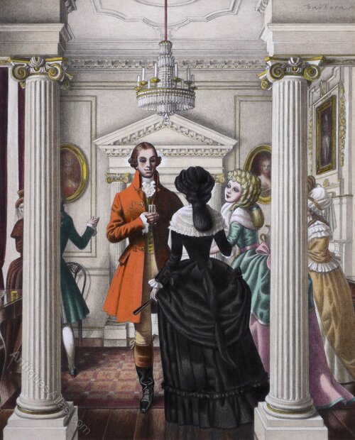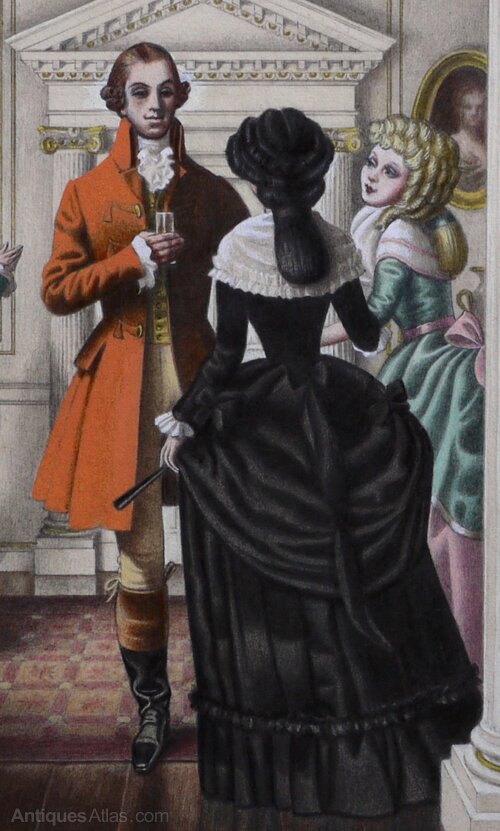 ‘In Reception’ illustrates the grand hall of a fine building while the mistress of the house ‘dressed in black’ introduces a young girl to a rather sinister and untrustworthy looking gentleman.