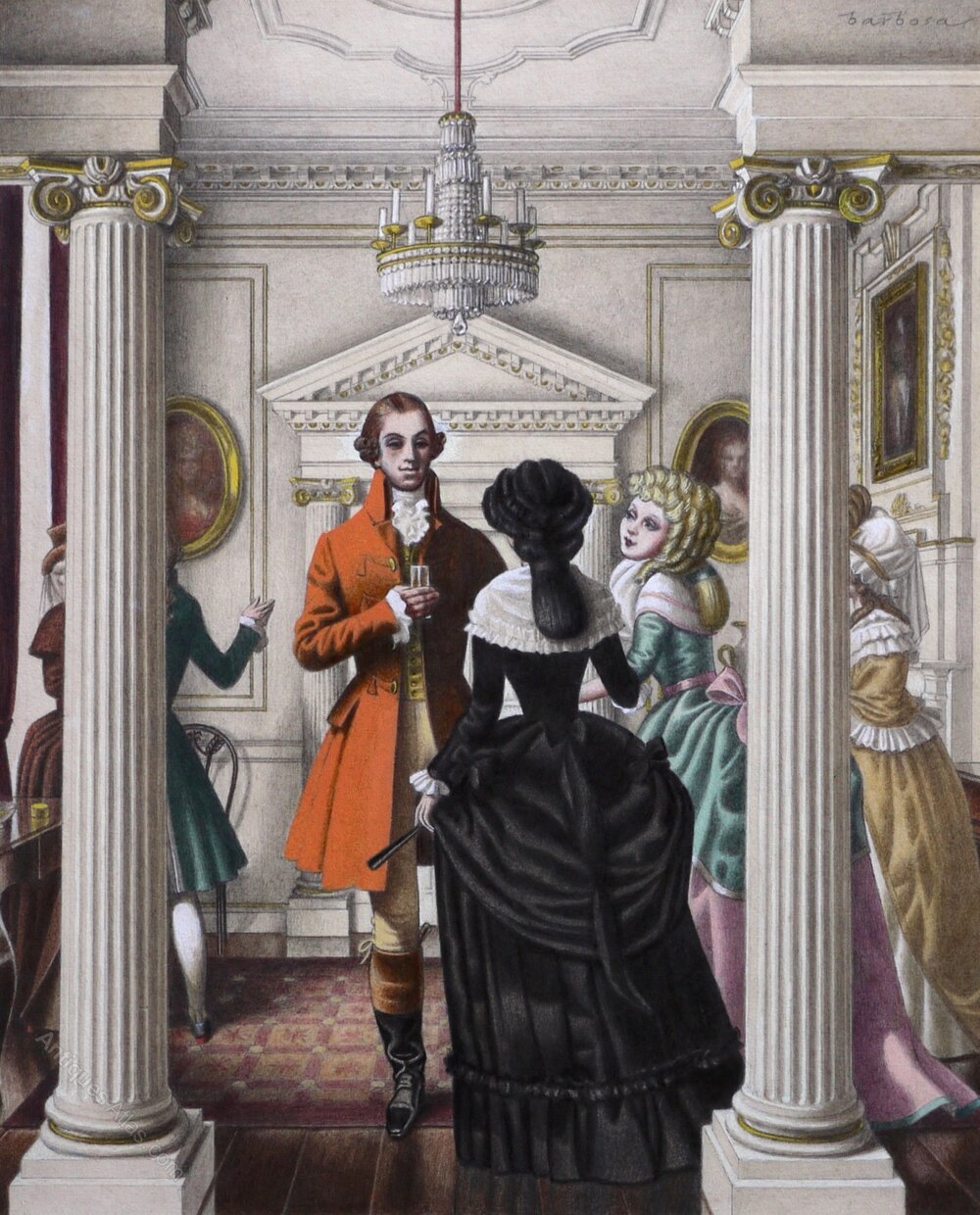 Artur Barbosa was born in Liverpool, the son of the Portuguese vice-consul and a half-French mother. He studied at Liverpool School of Art and the Central School of Art in London. Whilst still a student he produced illustrations for Everybody’s Weekly and The Radio Times. He also designed for the stage and produced drawings for fashion magazines and leading advertising agencies. Barbosa was at school with the actor Rex Harrison, the friendship endured into adulthood when Harrison commissioned Barbosa to design the interiors of his villa in Portofino, this in turn led to a commission to refurbish Elizabeth Taylor’s yacht, the Kalizma Cecil Beaton and Laurence Olivier were also among his friends.