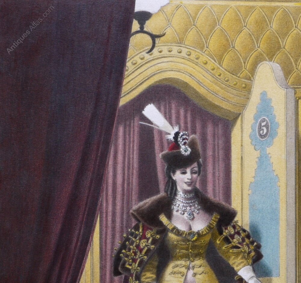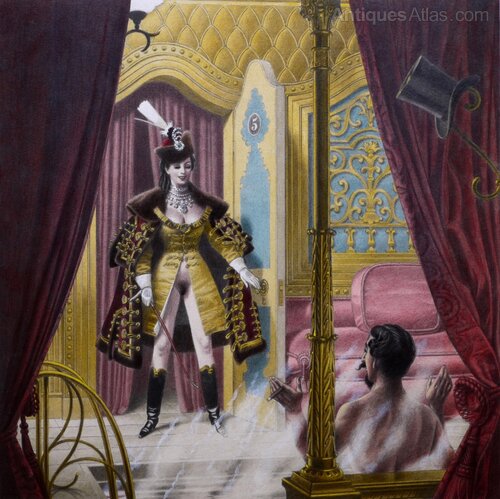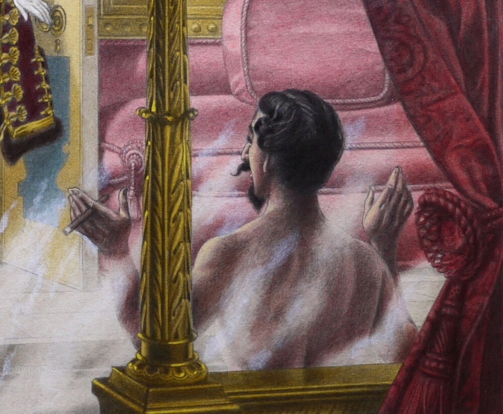 This illustration can be confidently traced to text in the Blatchford version of ‘The Memoirs of Cora Pearl’ where Pearl enters a room and is unexpectedly surprised to see a naked man with a short moustache standing in a bathtub. Chapter nine, page 167.