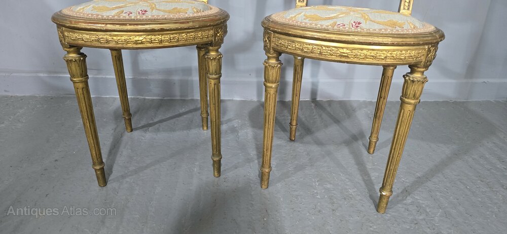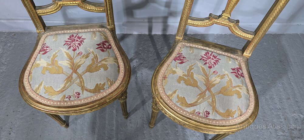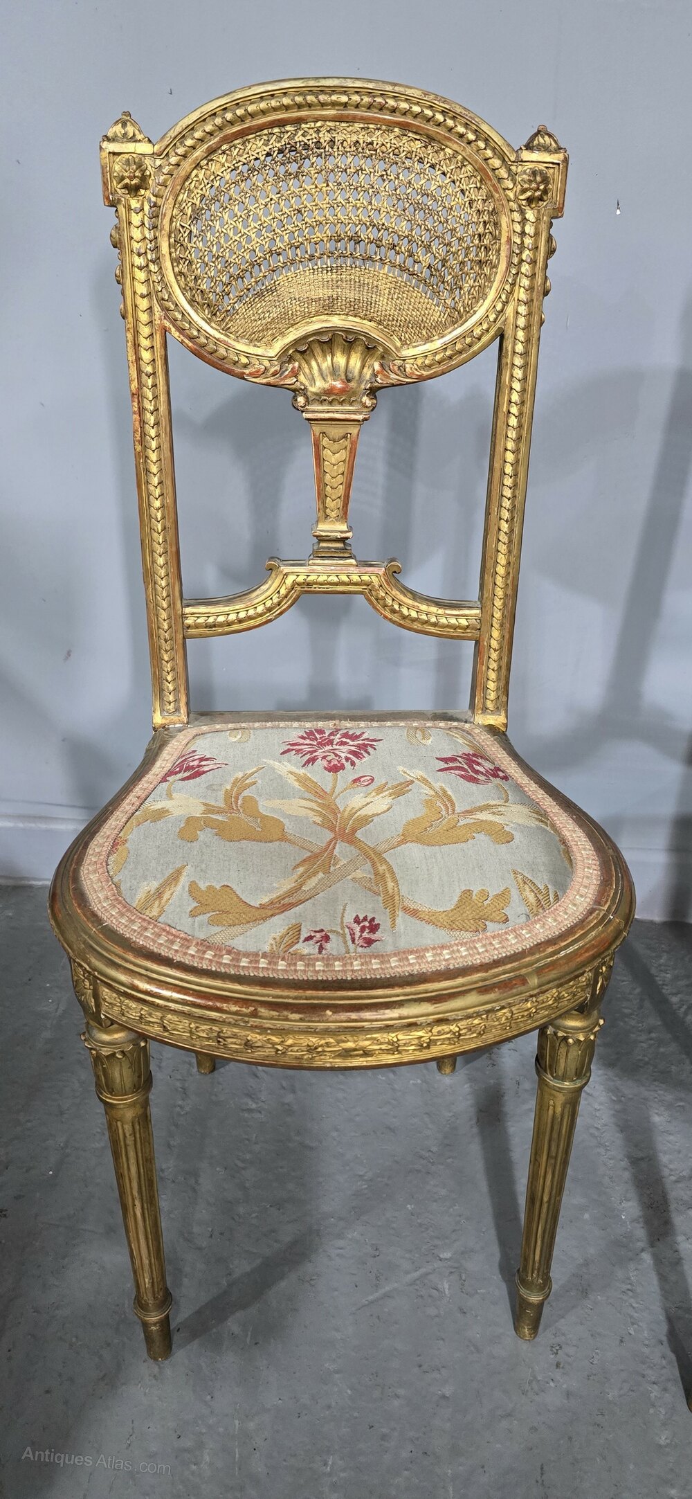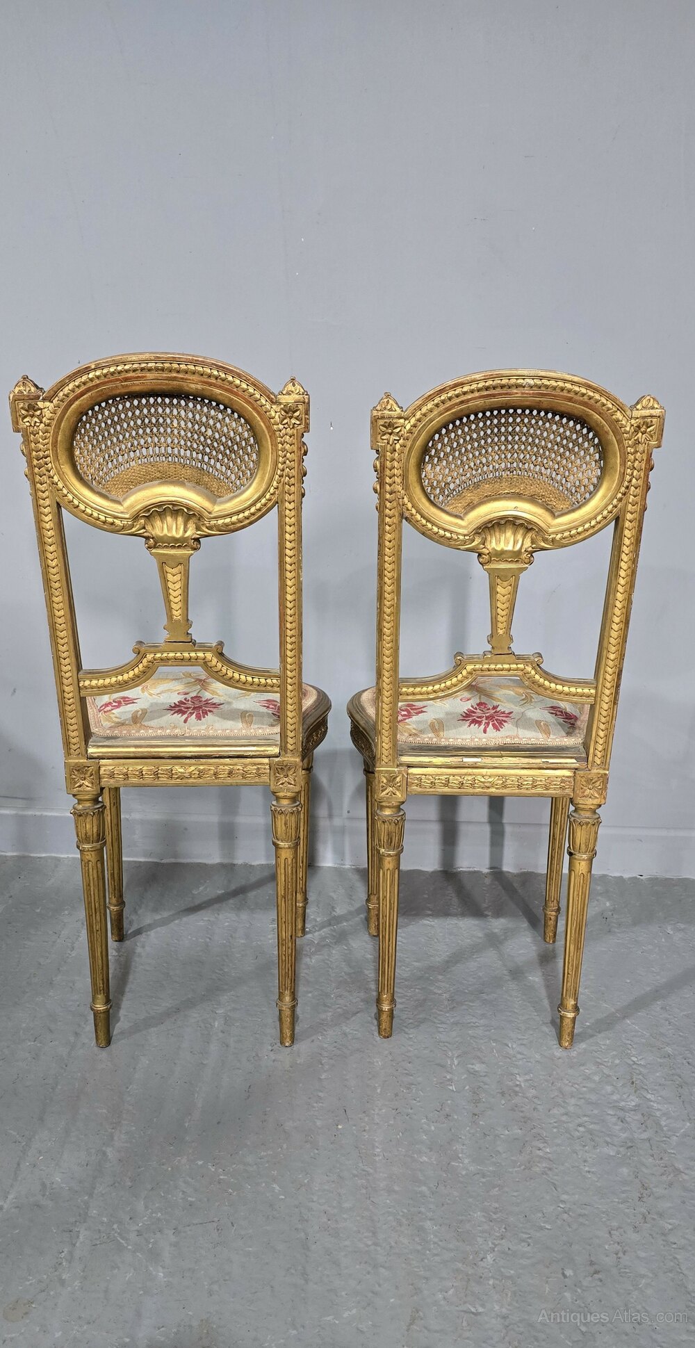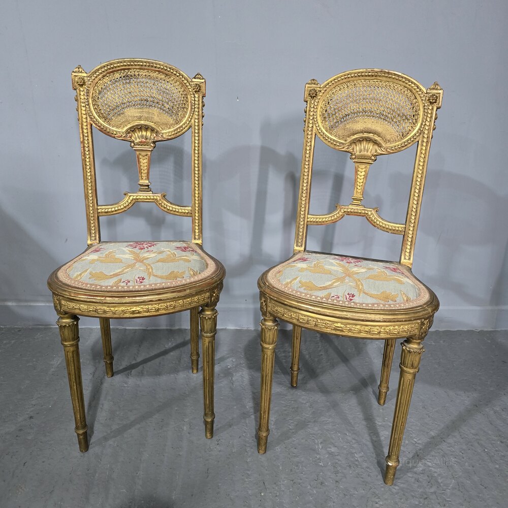 A very nice pair of French gilt boudoir chairs, with intricate bergere panels to the tops, in overall very good condition.