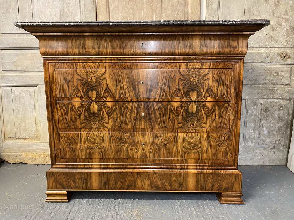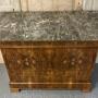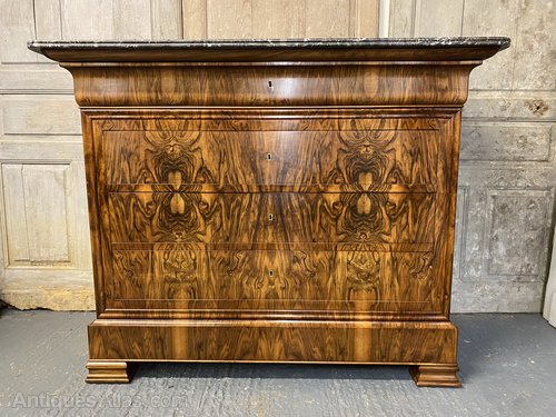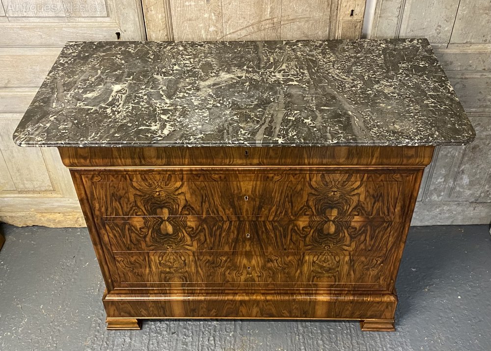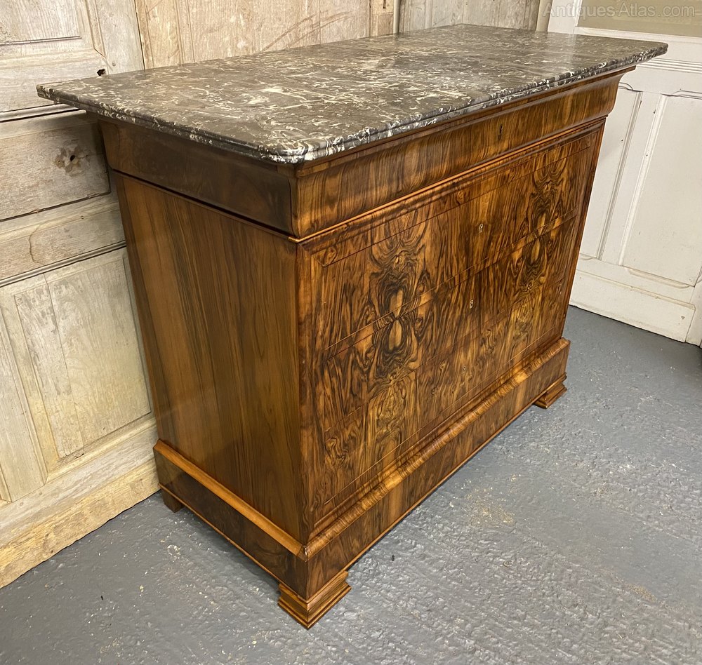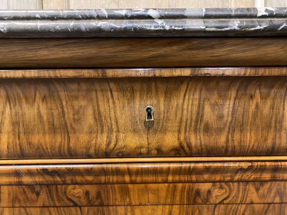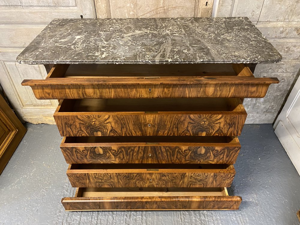A stunning French Marble top Commode Chest of Drawers, made from Walnut and excellent tight burr walnut to the front. The grey veined marble top is in excellent condition. The drawers all run smoothly and it has the rare extra secret drawer in the base.