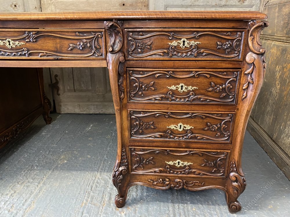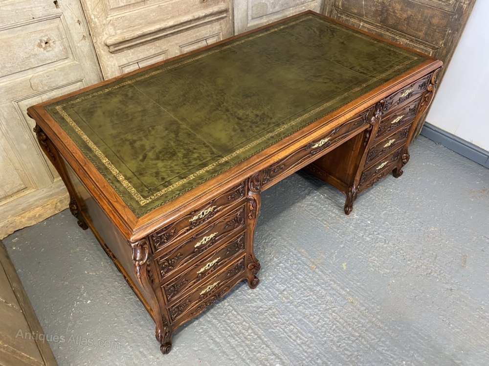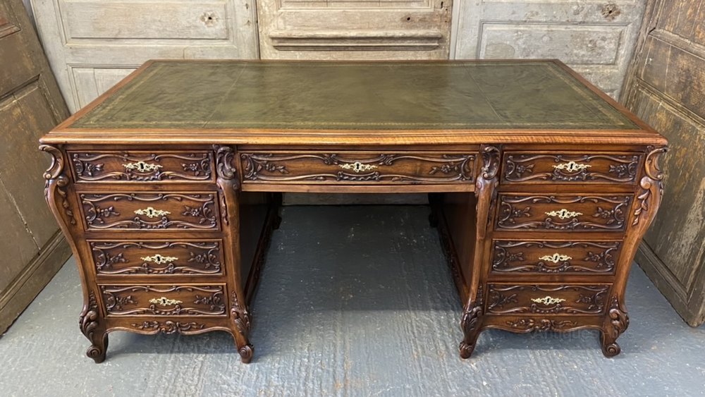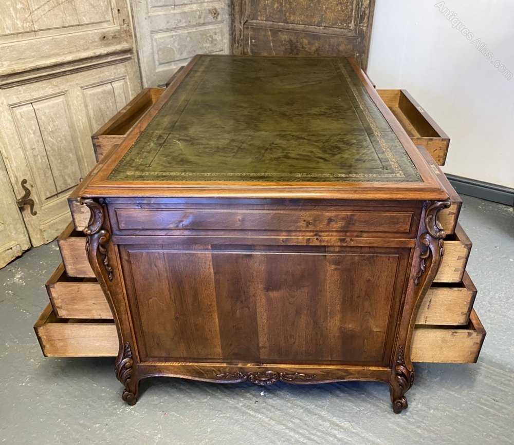 A truly exceptional quality Pedestal Desk. Originating from France in the 19th Century and in the French Rococo style. Made from Walnut and internally solid Oak. It is partners so the same on both sides, it comes apart for easy access into the home. Three keys present.