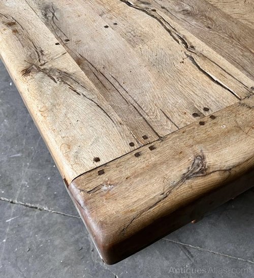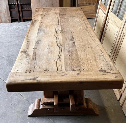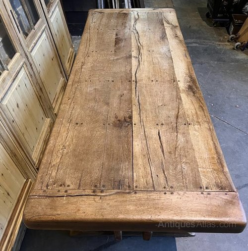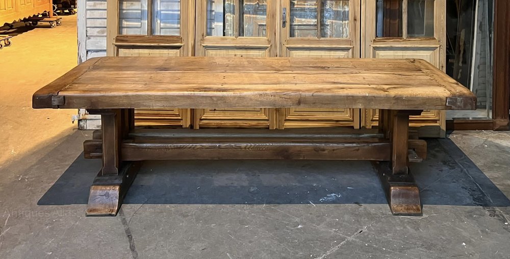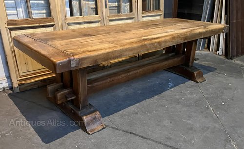 A truly wonderful Large Oak Farmhouse Refectory Dining Table. This table possibly has more Oak in it than any II have sold or seen before ! The top is an incredible 10cm thick and weighs a tonne. It has a double bar support along the bottom which I have never seen and each leg is barely liftable by one man !!!