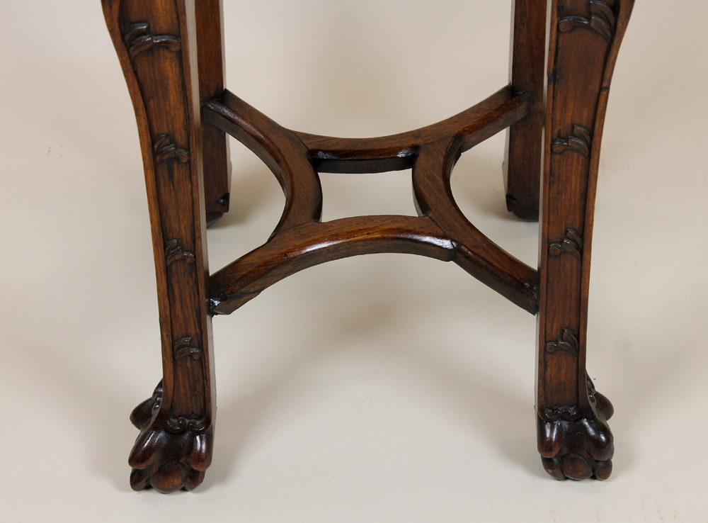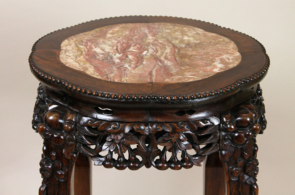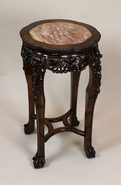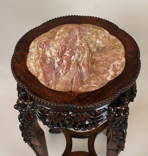 Superb quality late 19th.c. oriental carved rosewood marble top urn stand. Unusual shaped top with rose marble insert, beautifully carved and pierced detail to the frieze which continues down the legs and good claw feet. Excellent colour and condition.