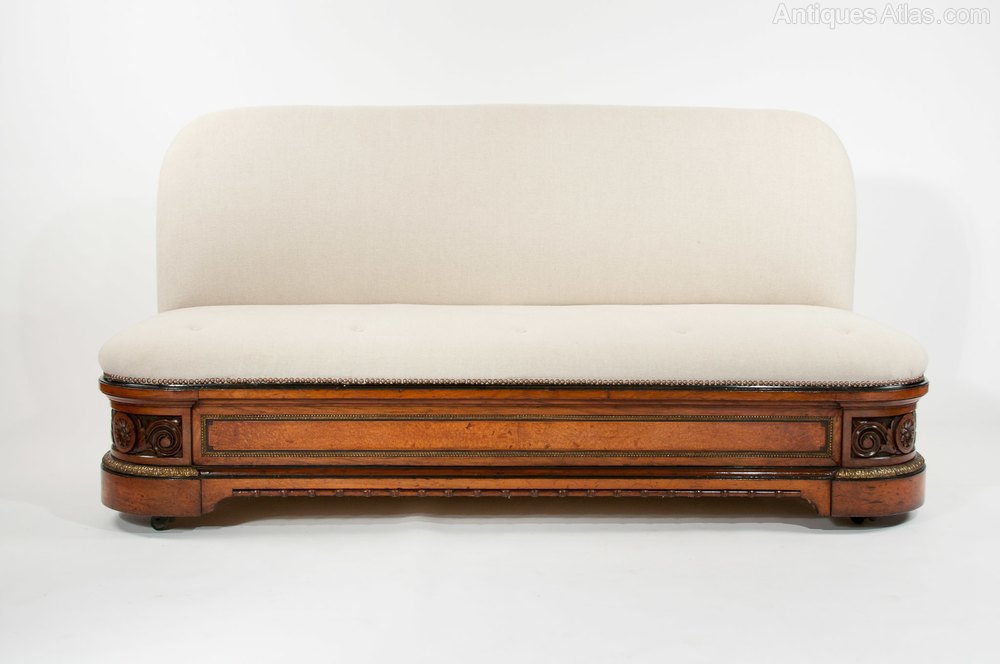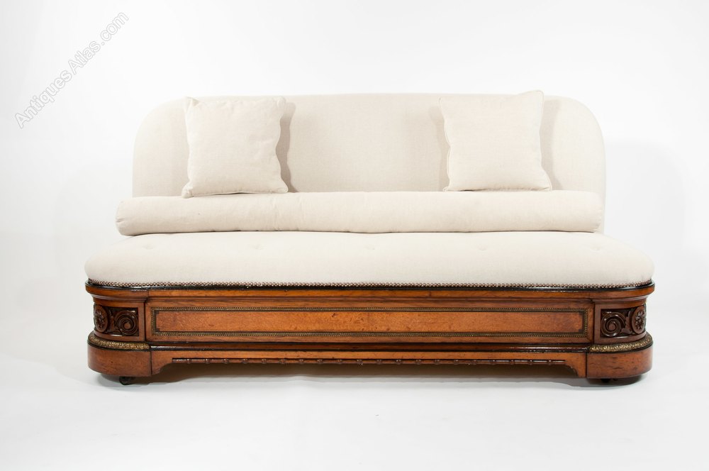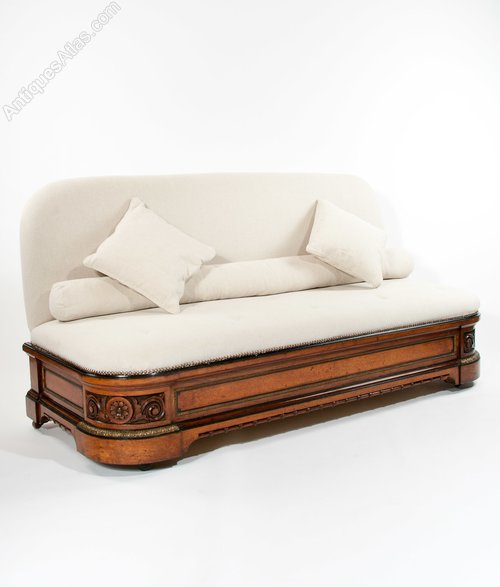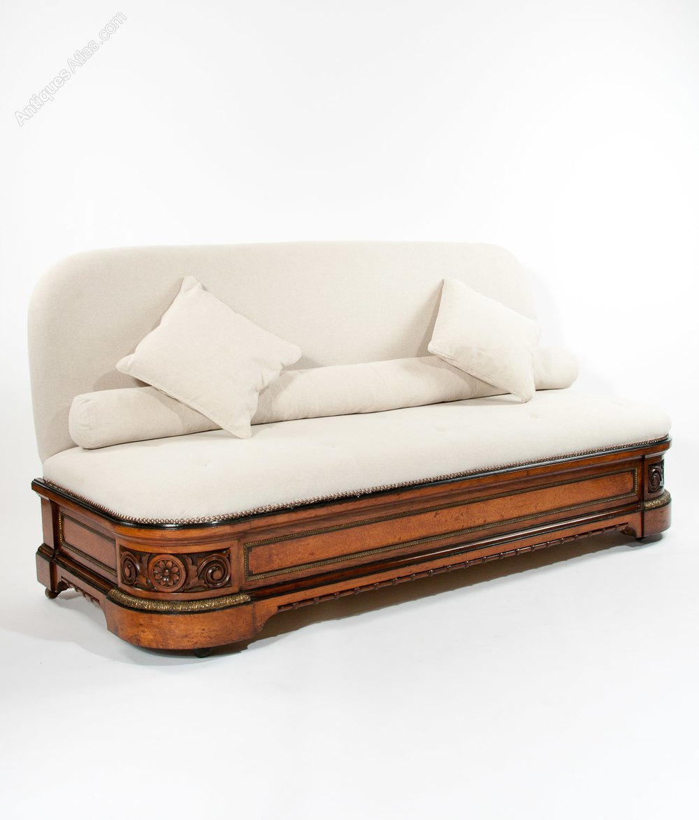 An exceptional quality mid 19th Century walnut and inlaid couch covered with a Laura Ashley linen fabric with shallow buttoning, two cushions and long bolster. This extremely rare and exceptional quality couch / sofa has a beautifully carved walnut base with amboyna inlaid panels with decorative ormolu mouldings. Standing on casters and in excellent this couch in been restored using traditional methods retaining a lovely warm colour and patina to the base. A very rare a fine quality item of 19th century antique furniture that is sure to make a statement in any room or setting whether it be contemporary or traditional.