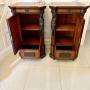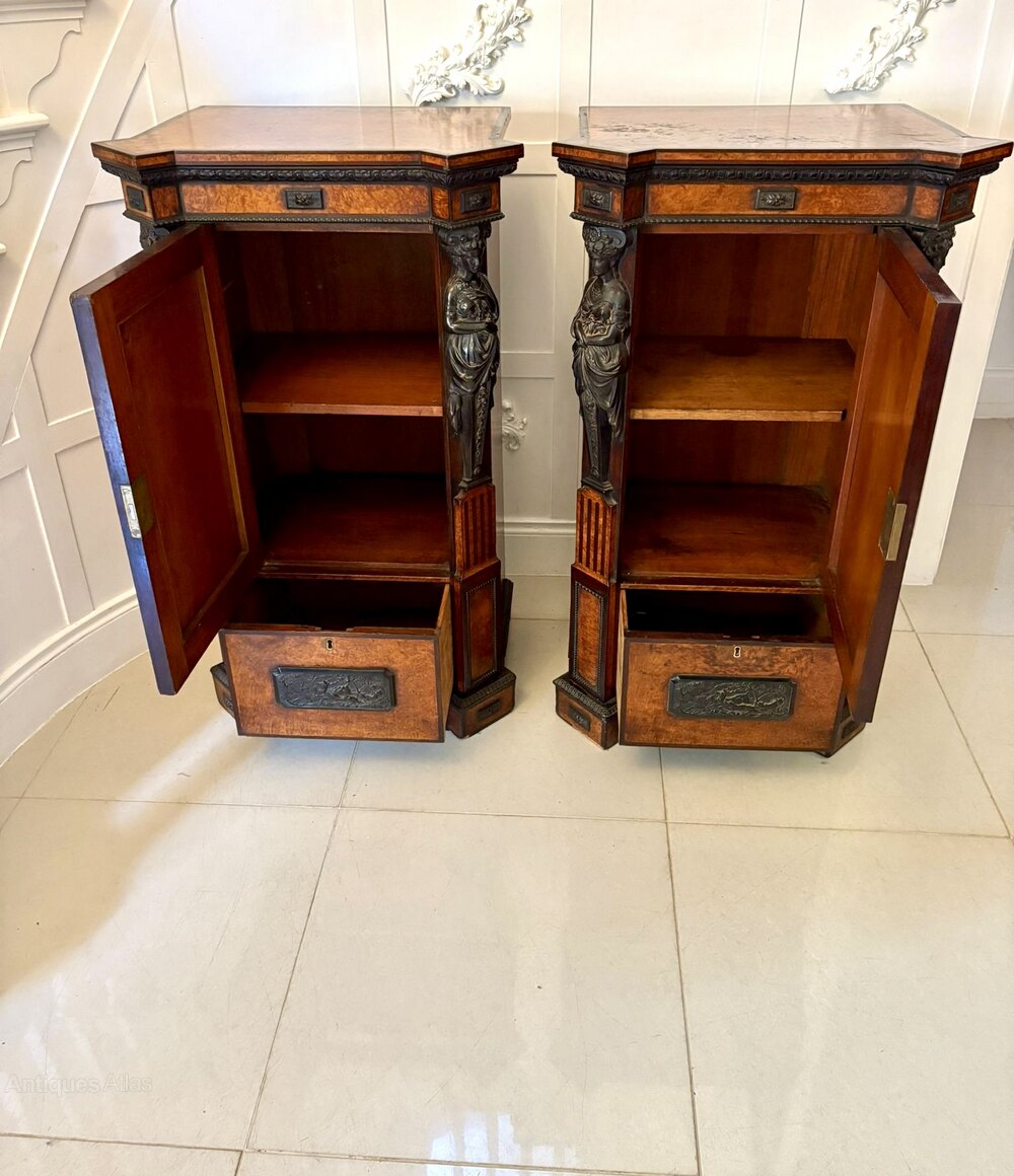 Exhibition quality pair of antique Victorian amboyna and carved ebony pedestals having an amboyna top with a crossbanded edge above a frieze drawer and single door opening to reveal a shelf interior above a small drawer all in amboyna with each pedestal having exhibition quality carved ebony figures to the front corners with spectacular carved mounted panels to the cupboard door surrounded by mouldings with fabulous carved mounted panels to the drawer above and below standing on a shaped plinth base.