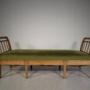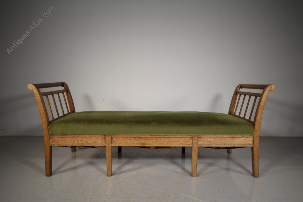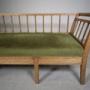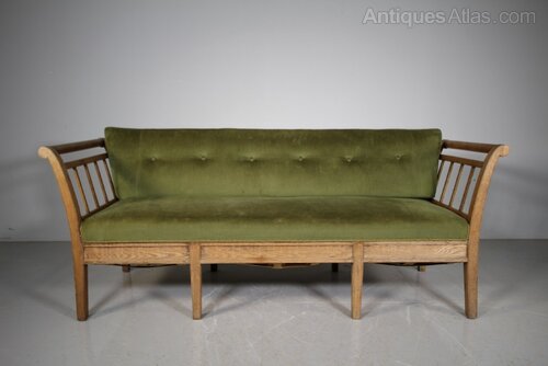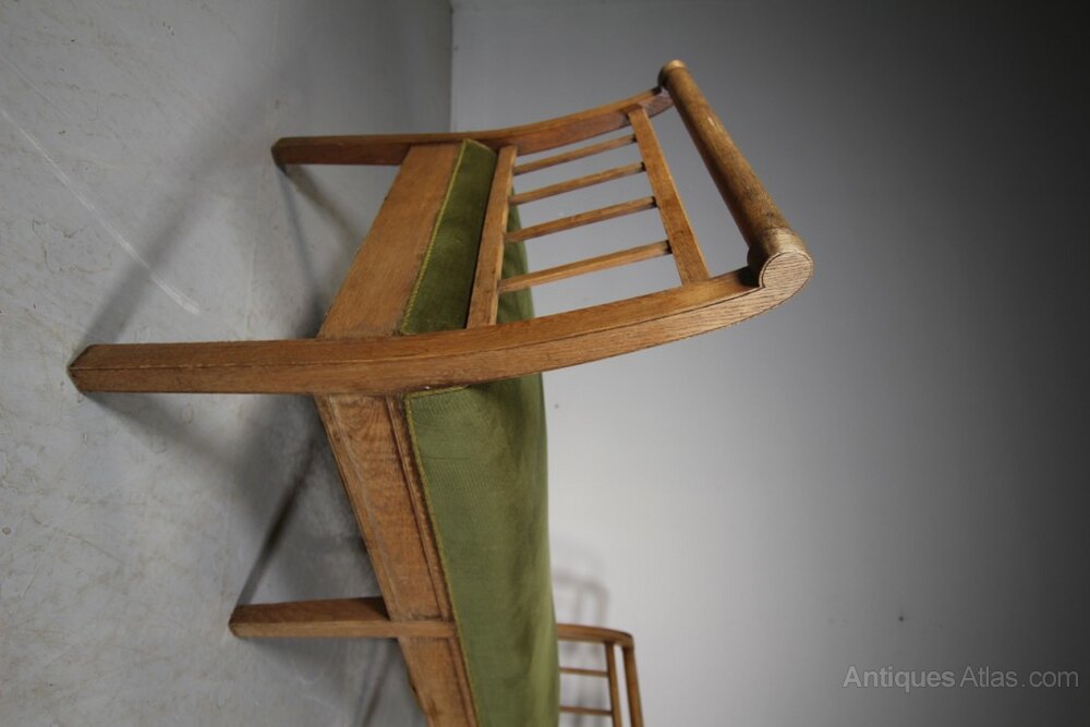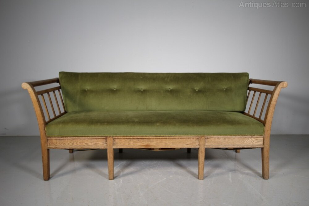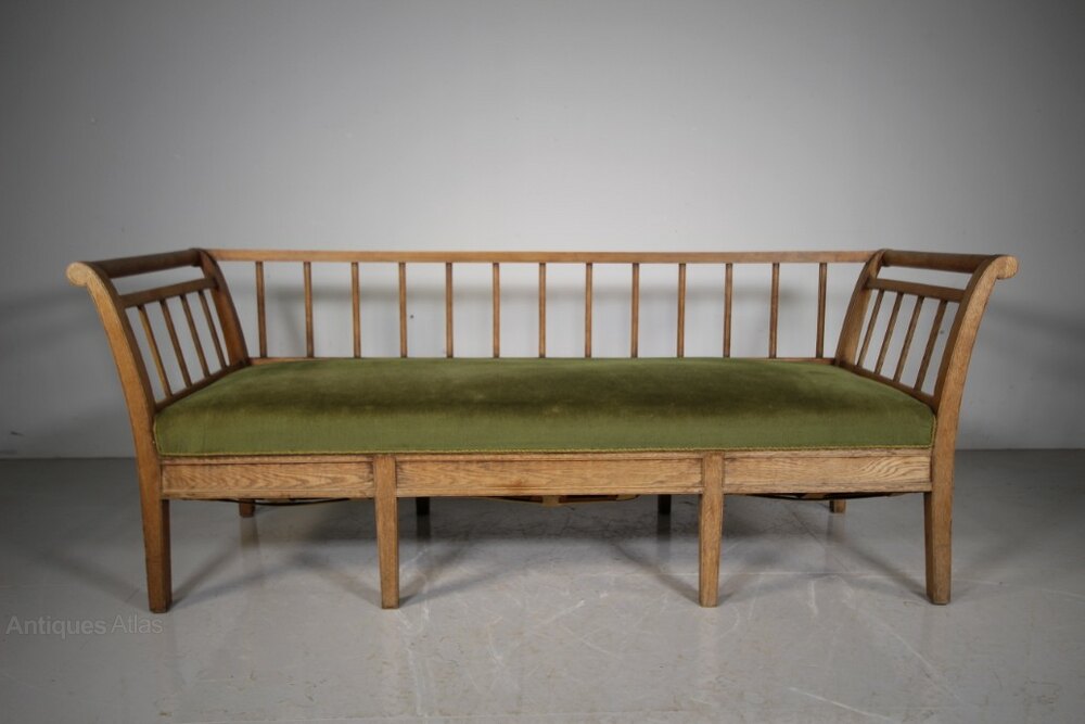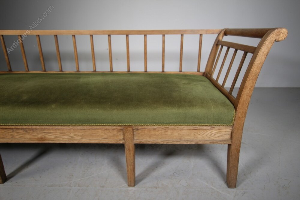 This is a super quality, solid English Edwardian antique oak sofa or window seat that is originally made to be used as both a sofa and an optional window seat. An unusual yet fabulous design, in excellent strong condition. The antique sofa has a fixed, sprung traditionally upholstered seat with a separate large and comfortable sprung back cushion. The green fabric is old but clean, so could be kept. A lovely shape and standing on eight square, tapering legs. Would fit well into an interior with Heals antique furniture. Dates to 1920.