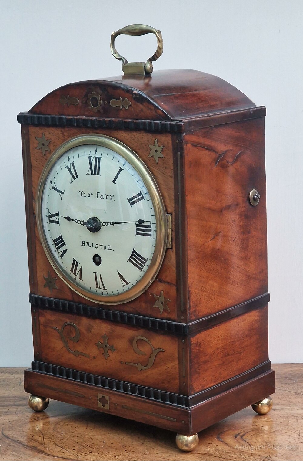 A small English Regency period fusee timepiece bracket clock. A mahogany case with choice flame veneers and brass inlay. A glazed back door. A smaller 5" convex painted dial signed 'Thos Farr, Bristol' with nicely detailed blued steel hands. Ebonised mouldings to the case and standing on bun feet. An 8-day duration timepiece fusee mechanism with the original pendulum transportation lock. Circa 1820.