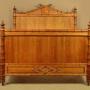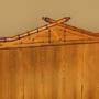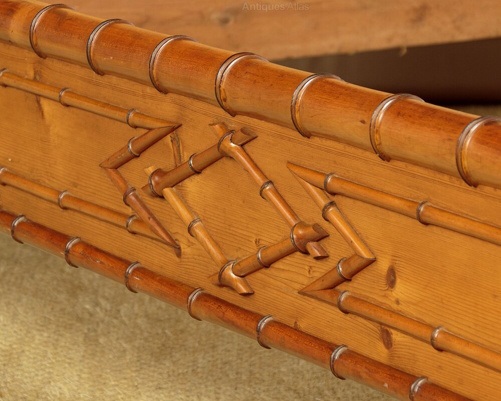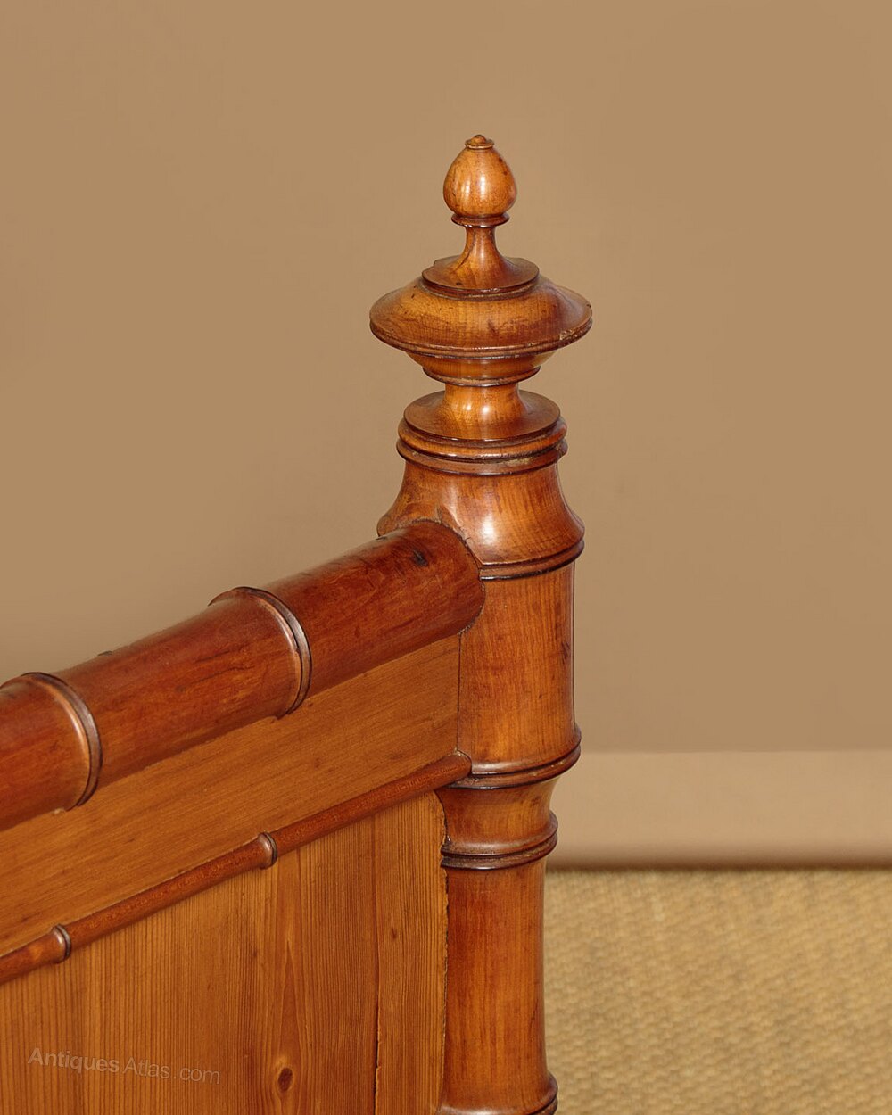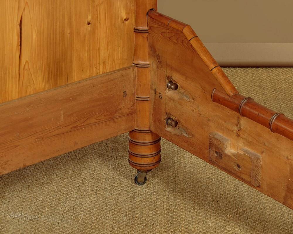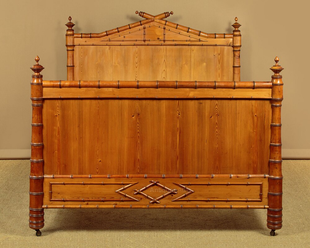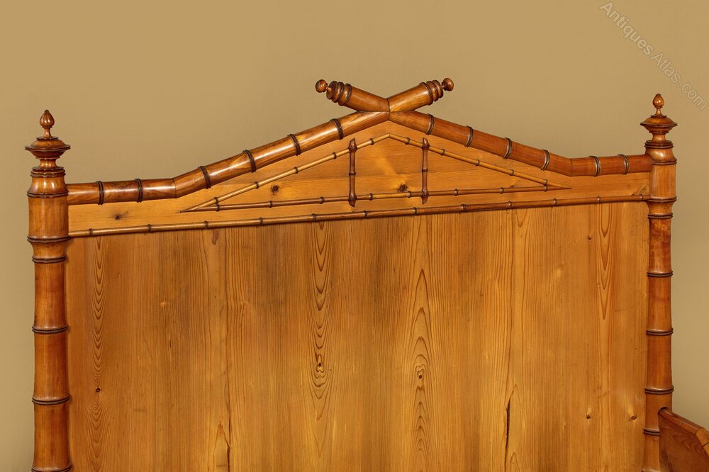 Late 19th.c. French faux bamboo bed c.1890. In pine with applied beechwood decoration turned to imitate bamboo, reflecting the fashion for Japanese art and design. A large single bed to take a 51½" (130cm) x 75½" (192cm) mattress. Crossed pediment to the headboard, turned finials to both the head and foot, extensive bamboo style mouldings also continued on the side rails. Raised on the original castors. A few chips from the edges of the finials, otherwise excellent condition, cleaned and waxed in our workshops. Dismantles for delivery.