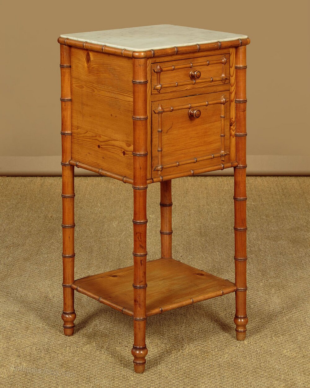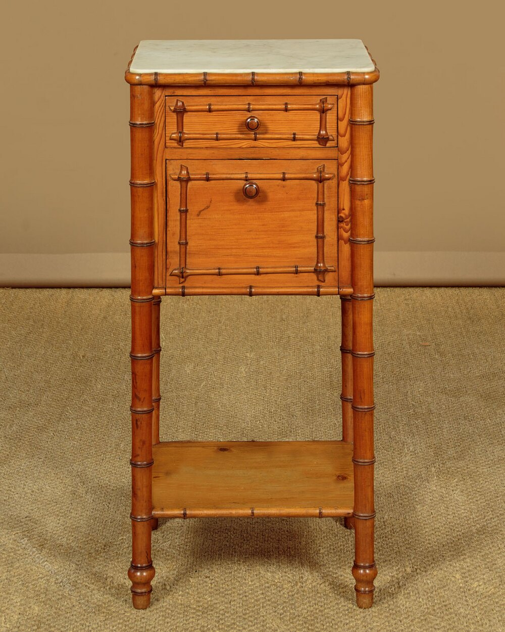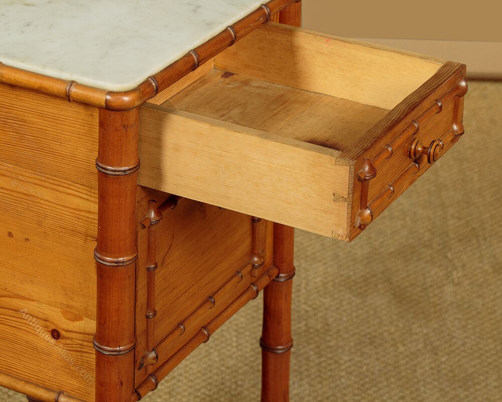 Single late 19th.c. French faux bamboo bedside cabinet c.1890. In pine with beechwood mouldings turned to resemble bamboo. Original white marble top within a bamboo moulded edge, over a drawer and a small fall front cabinet both with bamboo style decoration to the front. Raised on bamboo style turned legs joined with a low stretcher shelf with bamboo moulded edge. Excellent colour and condition, cleaned and waxed in our workshops.