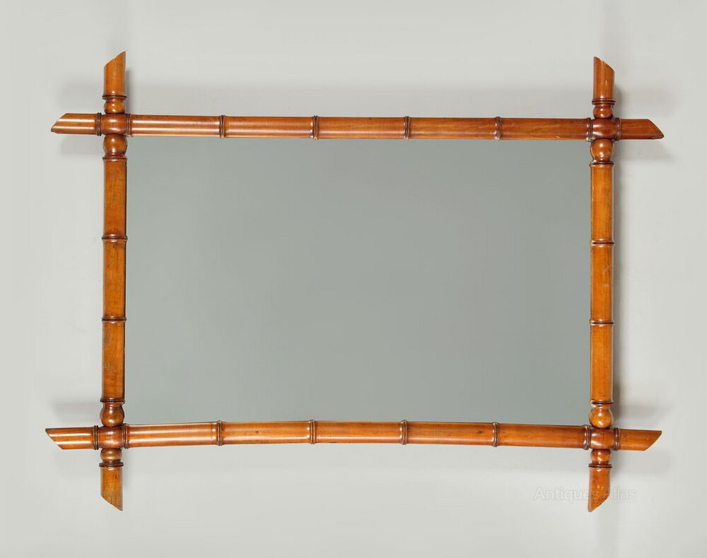 Late 19th.c. faux bamboo wall mirror c.1890. 19" x 31" mirror plate within a pine frame turned and carved to resemble bamboo and crossed at the corners. Could be hung either portrait or landscape aspect. Some minor wear to the tips of the frame. Generally excellent colour and condition, fitted with a new mirror plate. Cleaned and waxed in our workshops.