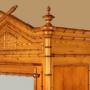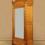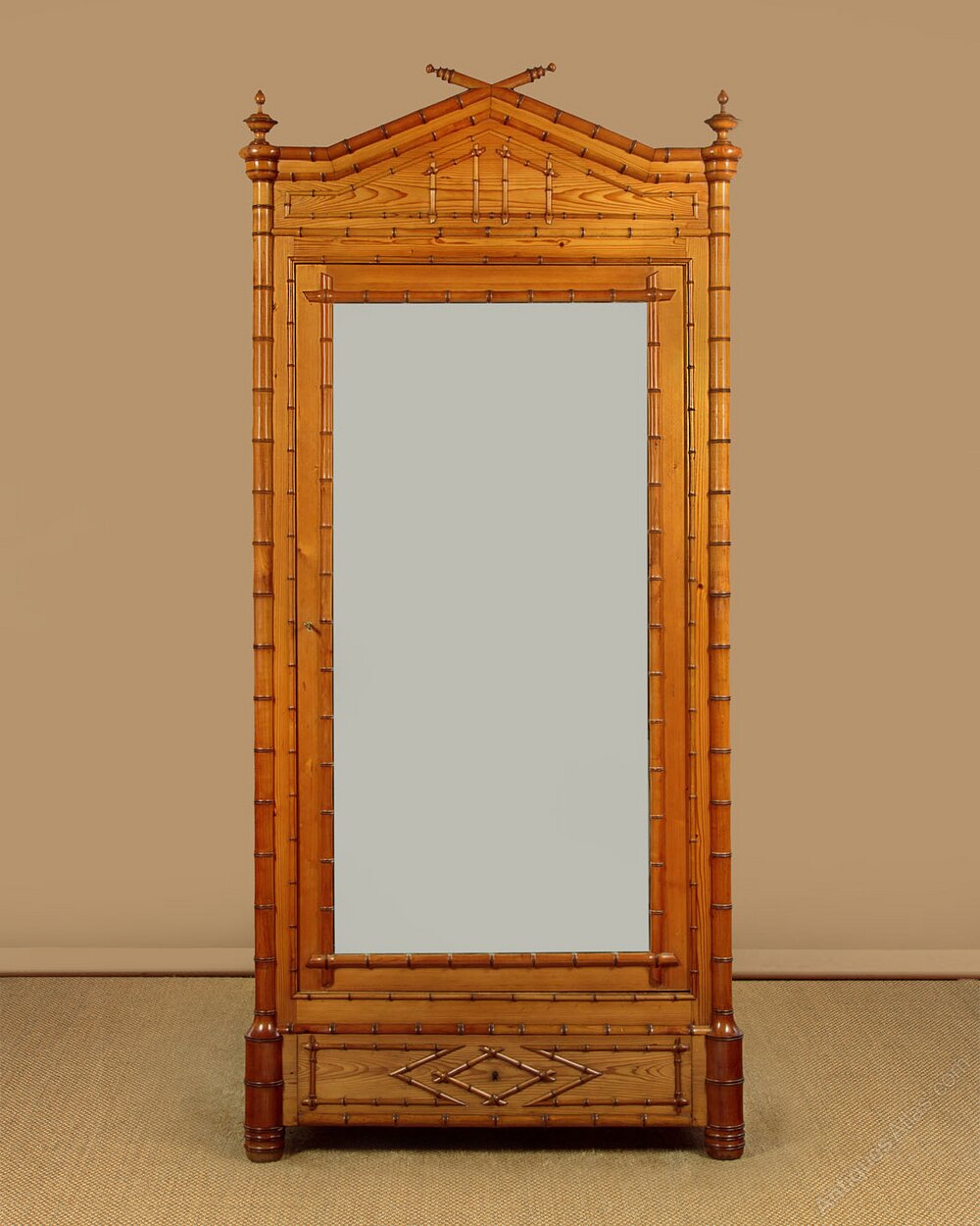Late 19th.c. French faux bamboo wardrobe c.1890. Single door wardrobe with a full length dressing mirror to the door. Fitted inside with three adjustable shelves (internal depth 14"), and with a single drawer in the base. In pine with extensive applied beechwood decoration, turned and carved to resemble bamboo. Crossed pediment flanked with crisply turned finials over a decorative frieze. Bamboo style column pilasters to the front corners continuing to the feet. Bamboo style mouldings around the mirror and the door, continued on the wardrobe sides, the drawer front and even on the internal shelf fronts. Excellent colour and condition, cleaned and waxed in our workshops. Key supplied.