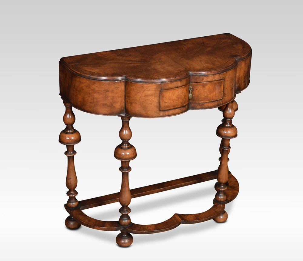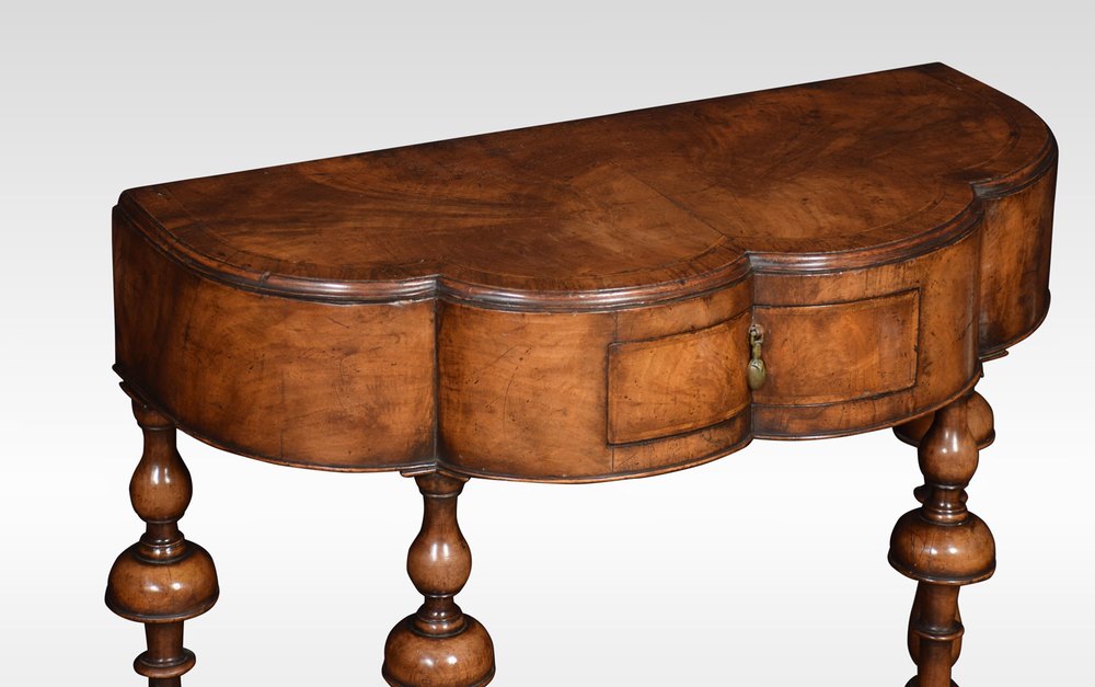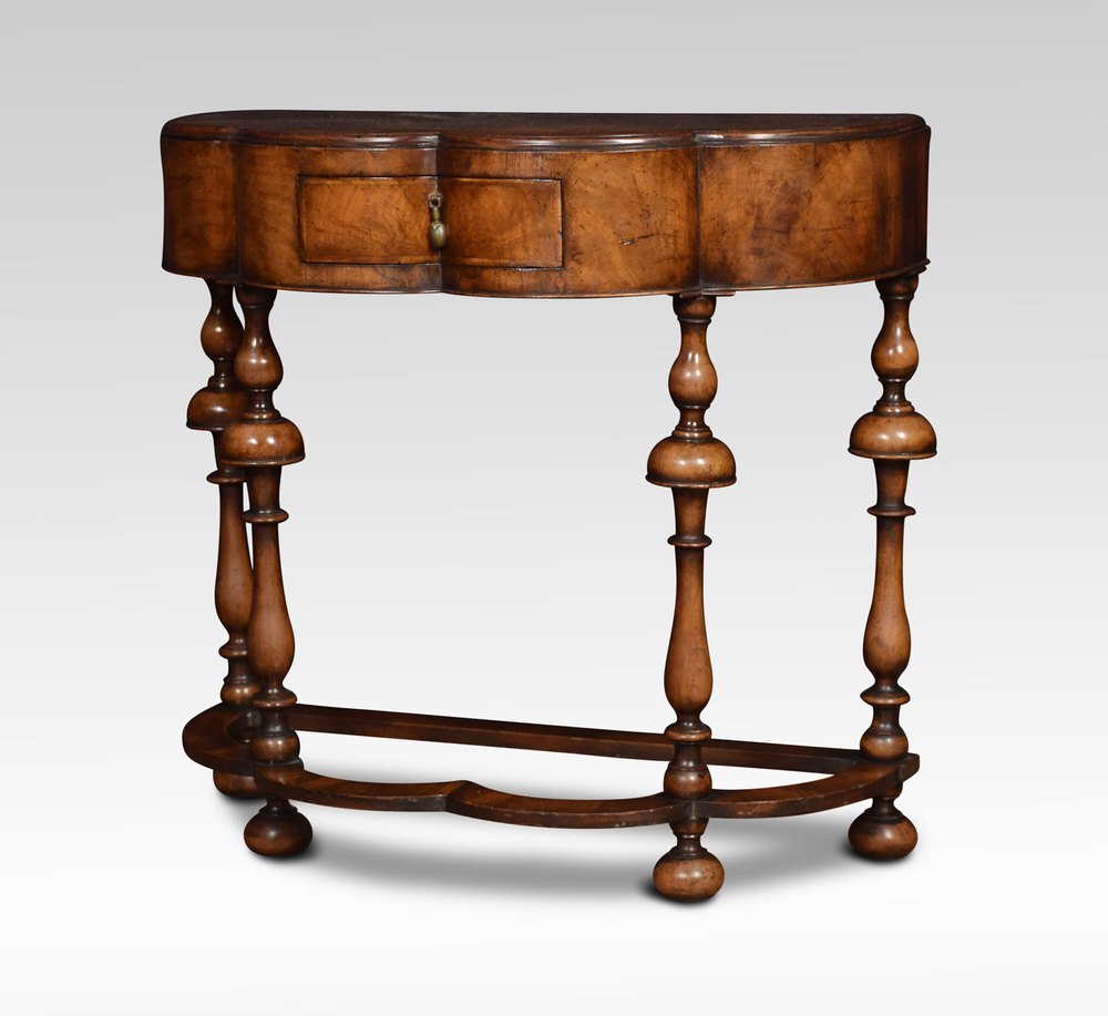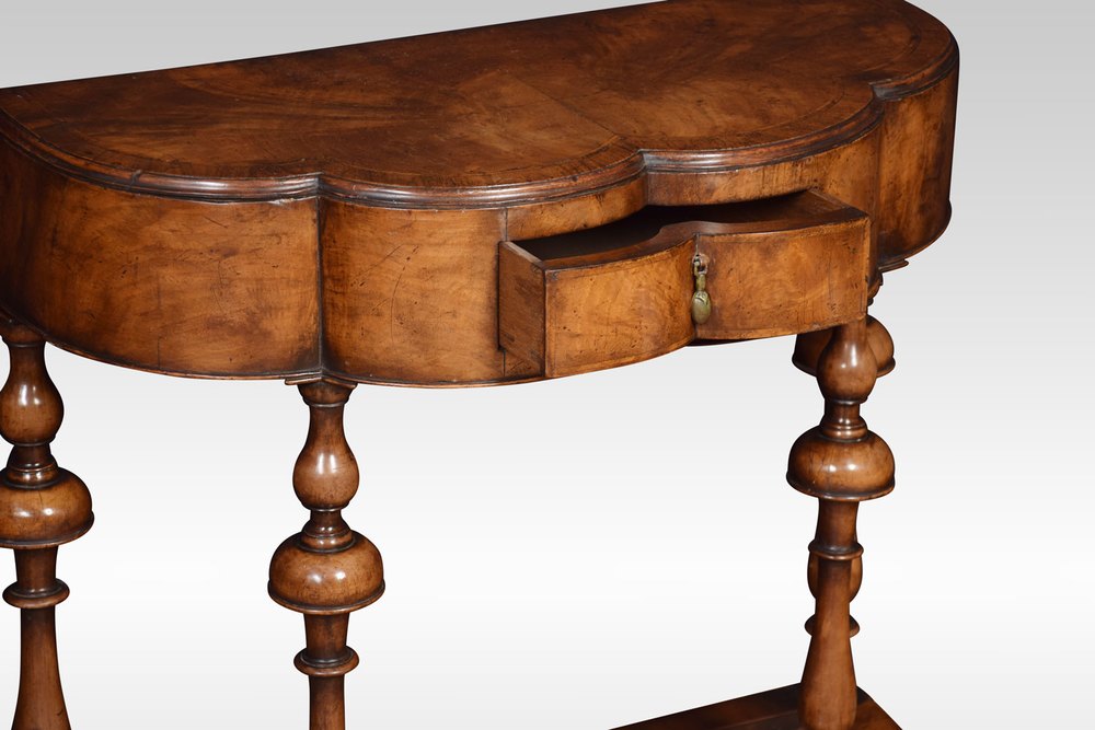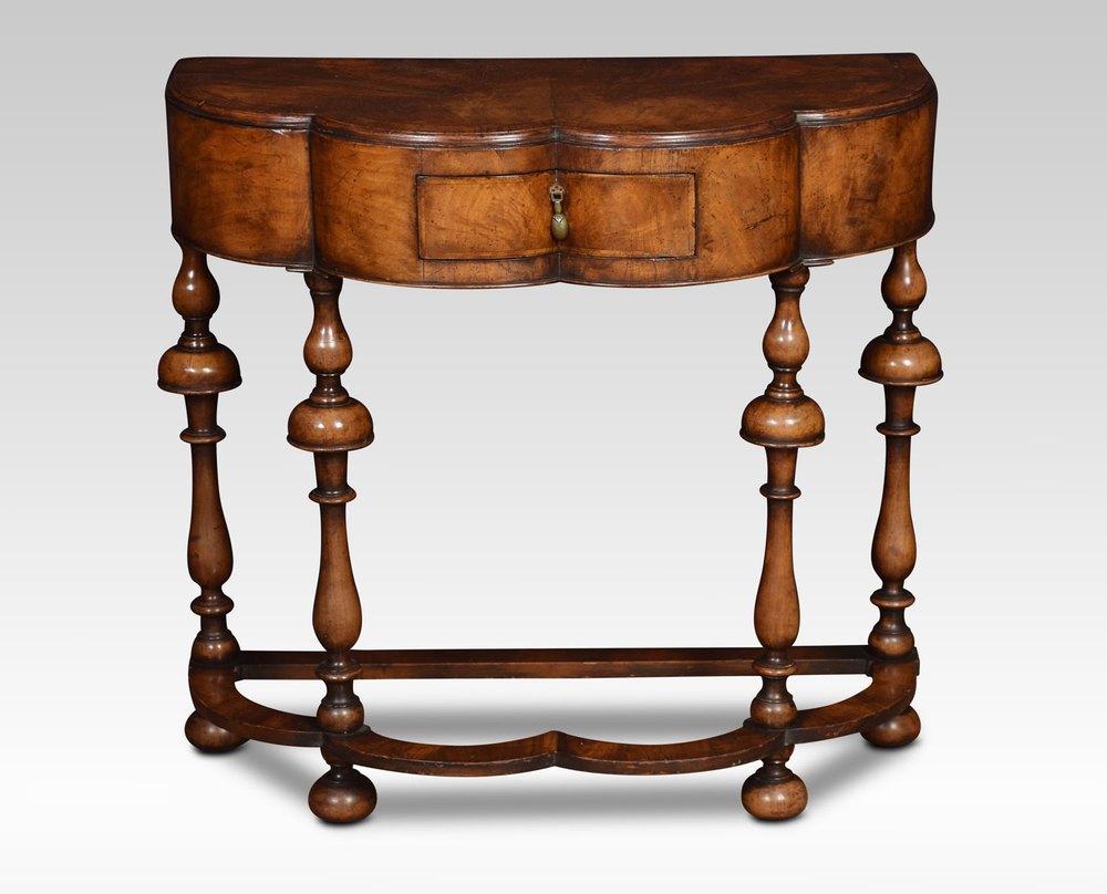 Walnut side table/hall table the shaped top above single frieze drawer. Raised up on turned supports united by stretchers.