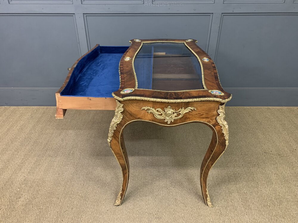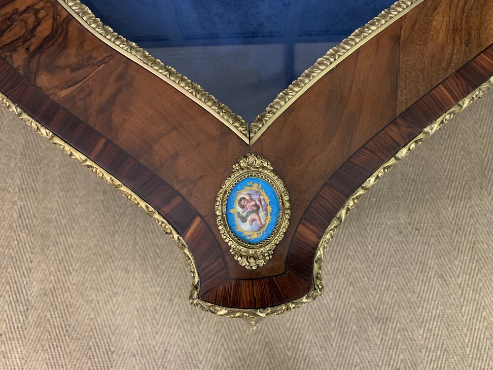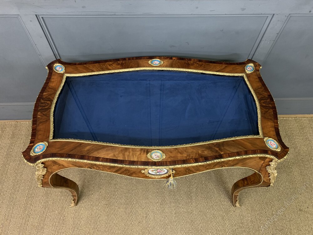 A superb 19th century figured walnut bijouterie table of the highest quality. Of serpentine form and of generous proportions. With attractive figured walnut veneers and adorned with crisply cast ormolu mounts throughout. The glazed top is cross banded in tulipwood and embellished with a series of 6 small sevres porcelain plaques. Larger porcelain plaques are to be found to the front and back of the table. There is a single drawer (lockable, key supplied) which opens to access the display space lined in blue velvet. Standing on elegant cabriole legs. Offered for sale in excellent condition, with a good colour and patina. A very fine example.
