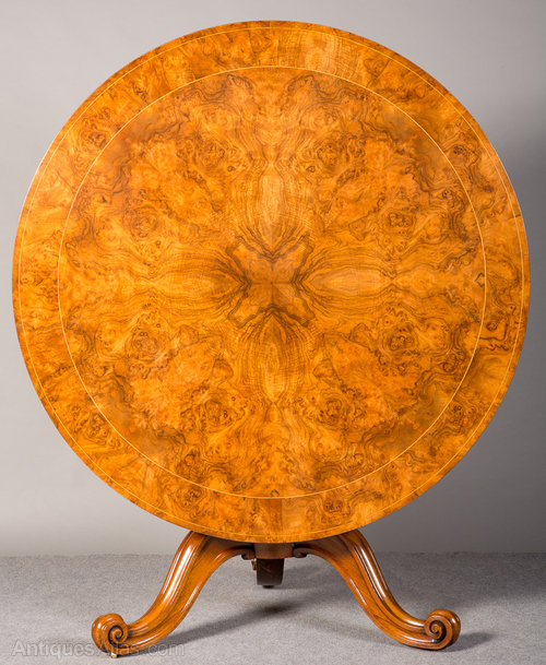 Superb Victorian burr walnut loo/centre/dining table. The beautiful quartered veneered top with inset cross banding between boxwood line inlay. The turned and carved column supported by 3 cabriole legs and original brass castors. This table is in pristine condition and benefits from a tilt action which allows easy moving. Sizes- Diameter..48''..121cm. Height..29.25''..74.5cm.