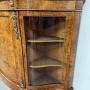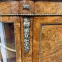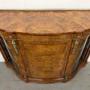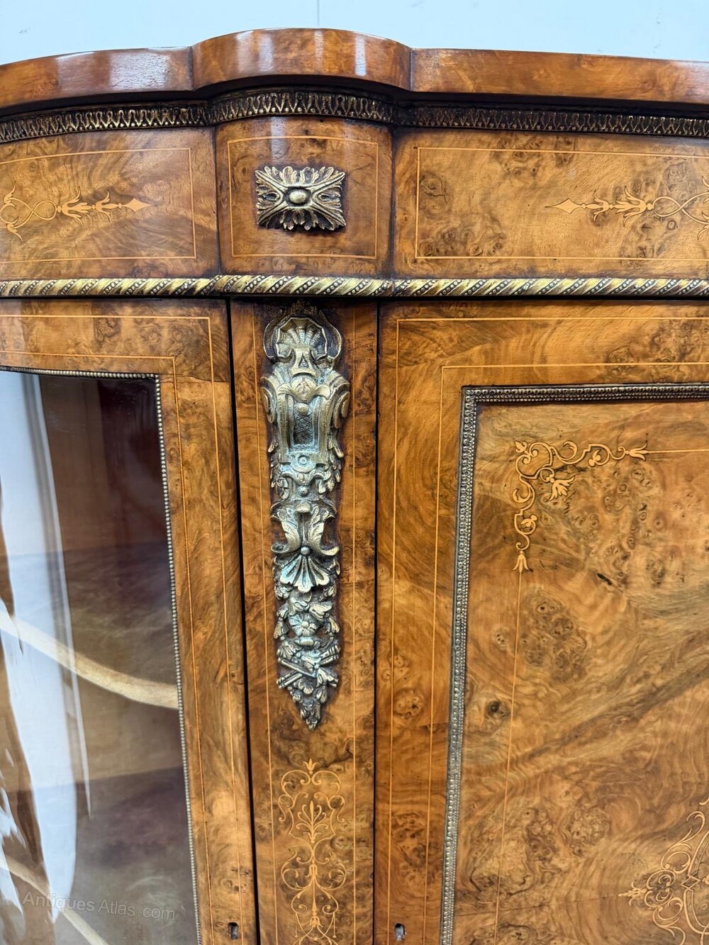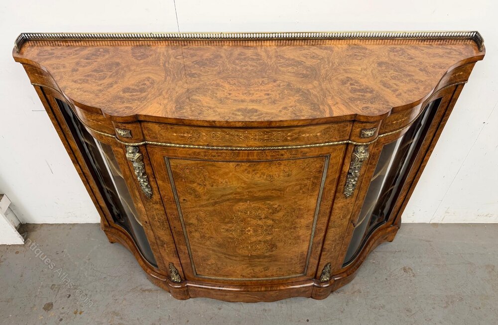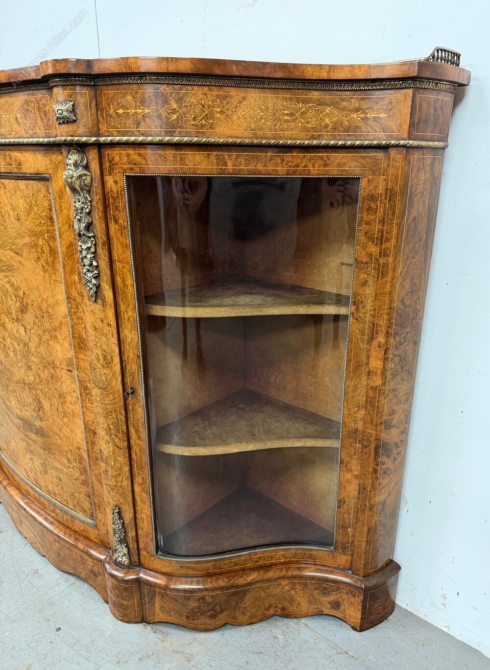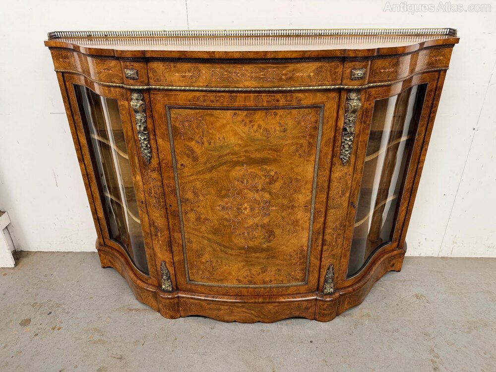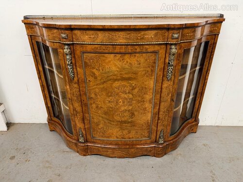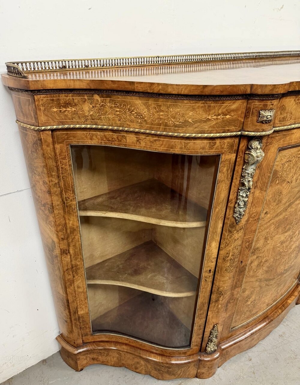 Fine quality Victorian burr walnut and ormolu mounted credenza. The bow fronted centre flanked by serpentine glazed doors with applied inlaid rounded stiles with ormolu mounts. The central door having several lines of subtle inlaid banding and a central inlaid boxwood panel. The frieze having further boxwood inlay and the top with book matched burr walnut and quality cast brass gallery. The whole with subtle boxwood inlay, gilded embellishments and all raised on a conforming shaped plinth base. Original faded velvet lining. Fully cleaned and waxed. With working locks and keys. Dimensions:- Width 60”/ 152cm Depth 18”/ 46cm Height 42.5”/ 108cm. Delivery to most of U.K £75.00