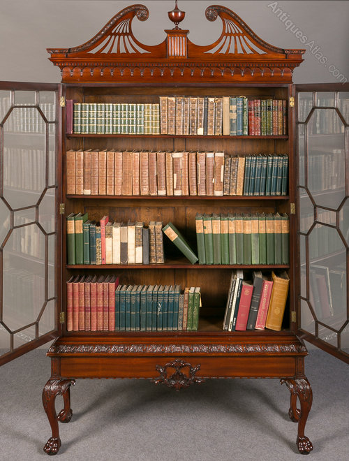 A superb mahogany Chippendale style bookcase. The dentil cornice having a swan neck pediment with carved and pierced decoration and a central urn shaped turned finial. The 2 full length doors with 15 pane astragal glazing bars and applied carved detail to the sides. The stepped base with carved edge and plain frieze. The whole standing on shaped legs with carved acanthus knees, "C" scrolls and lions paw feet. This bookcase has 2 adjustable shelves and transports in 3 pieces. In A1 condition with a deep rich colour.