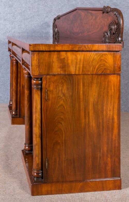 A stunning early 19th century figured mahogany 4 door sideboard. The rectangular plum pudding mahogany top with an attractive low upstand and well carved ends. Below are two short and one long bow fronted frieze drawers with blue paper linings. The base section of inverted breakfront form and having 4 panelled doors with supporting turned columns. The righthand door opens to reveal 4 slide drawers, the centre doors open to a shelved interior and the lefthand door encloses a cellarette with a shelf above. The whole constructed with the finest figured mahogany and raised on a plinth base. This sideboard can be transported in 3 pieces. Delivery to most of U.K. mainland £100. Dimensions:- Height…36''/ 91.5cm. Plus upstand of 11.5''/ 29cm. Width...68''/ 173cm. Depth...23.5''/ 59.5cm.