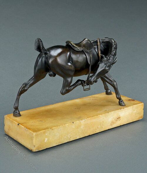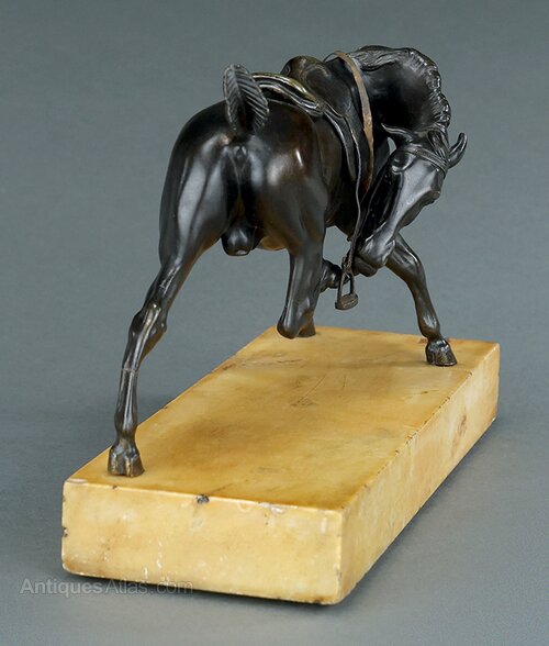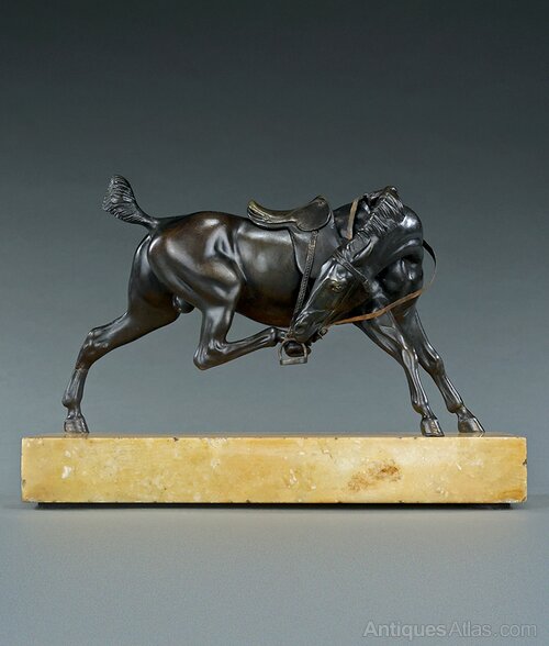 Good quality early 19th century French patinated equestrian bronze model of a saddled riderless, possibly panicked, horse in the aftermath of battle in the style of images by Carle Vernet (1758-1836). Naturalistically modelled with a short trimmed tail common with cavalry horses during the Napoleonic wars and lacking a stirrup on the rear side. Impressive and highly decorative bronze beautifully cast with a real sense of movement and power. France, circa 1830.