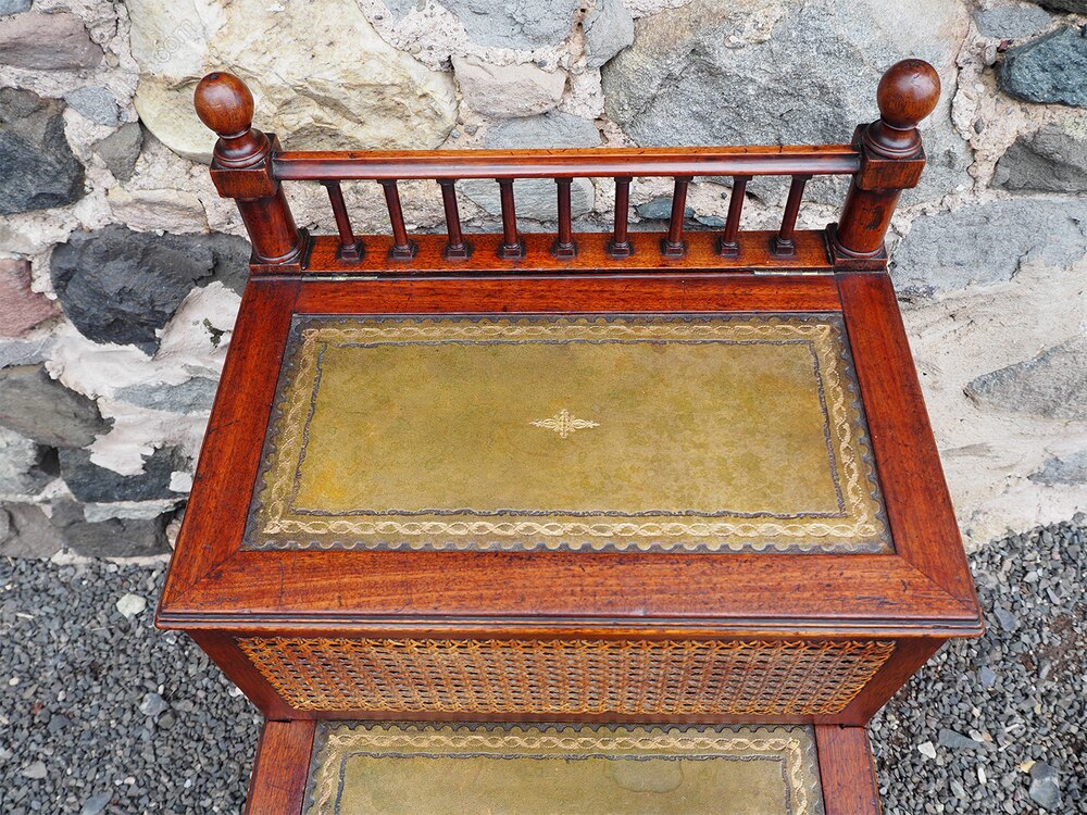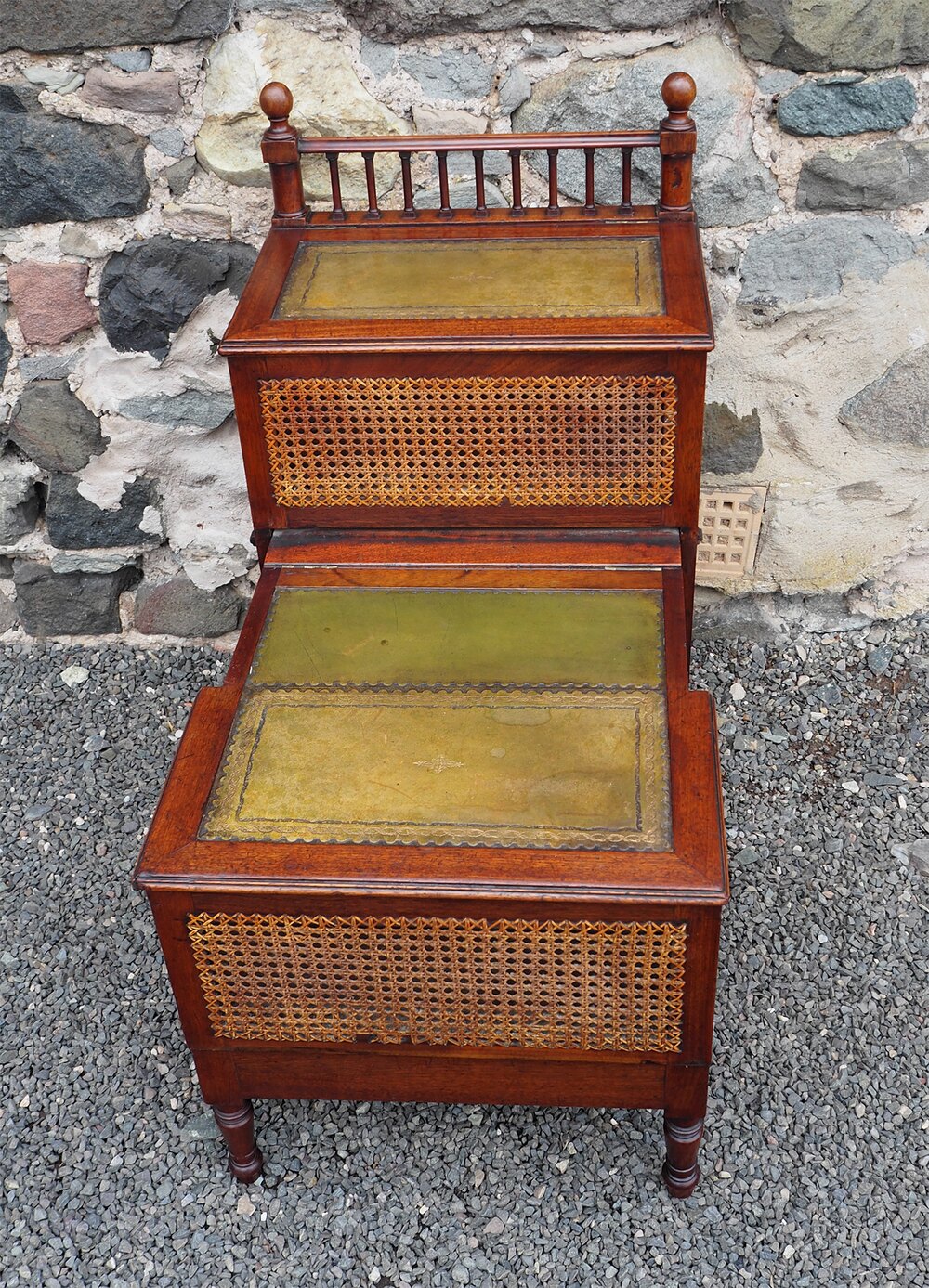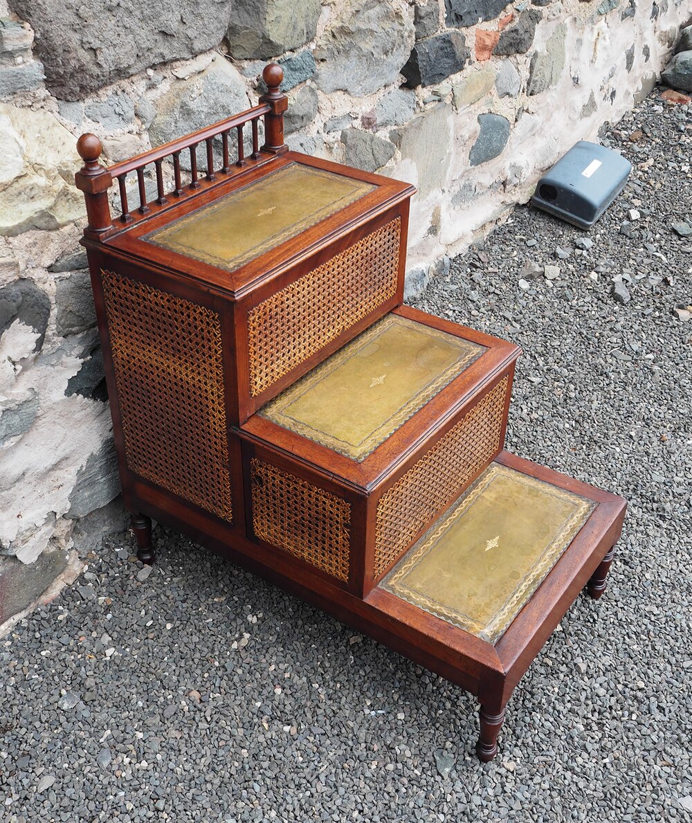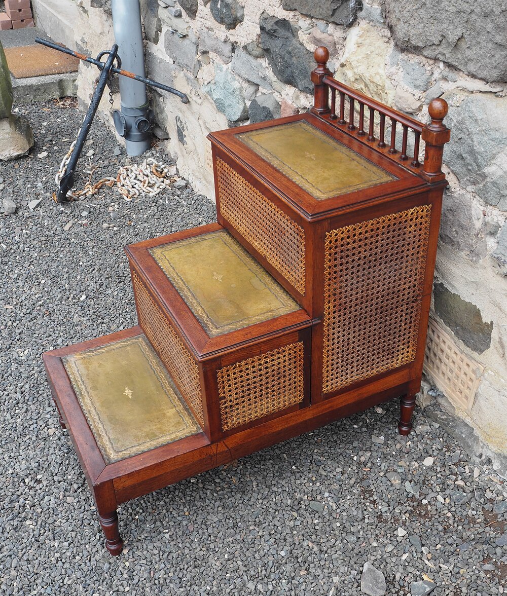 Fine quality set of early 19th century Georgian mahogany bed or library steps in very good original condition. The steps have all their original canework panels. Small turned legs and a really pleasing turned gallery to the top. All the steps have very nice proper green leather and gold toothed panels. Both top and middle steps have hinged lids for storage with the internal parts all being mahogany lined. The piece is a gorgeous original colour with great patina and a waxed finish. Just that bit better than normal.