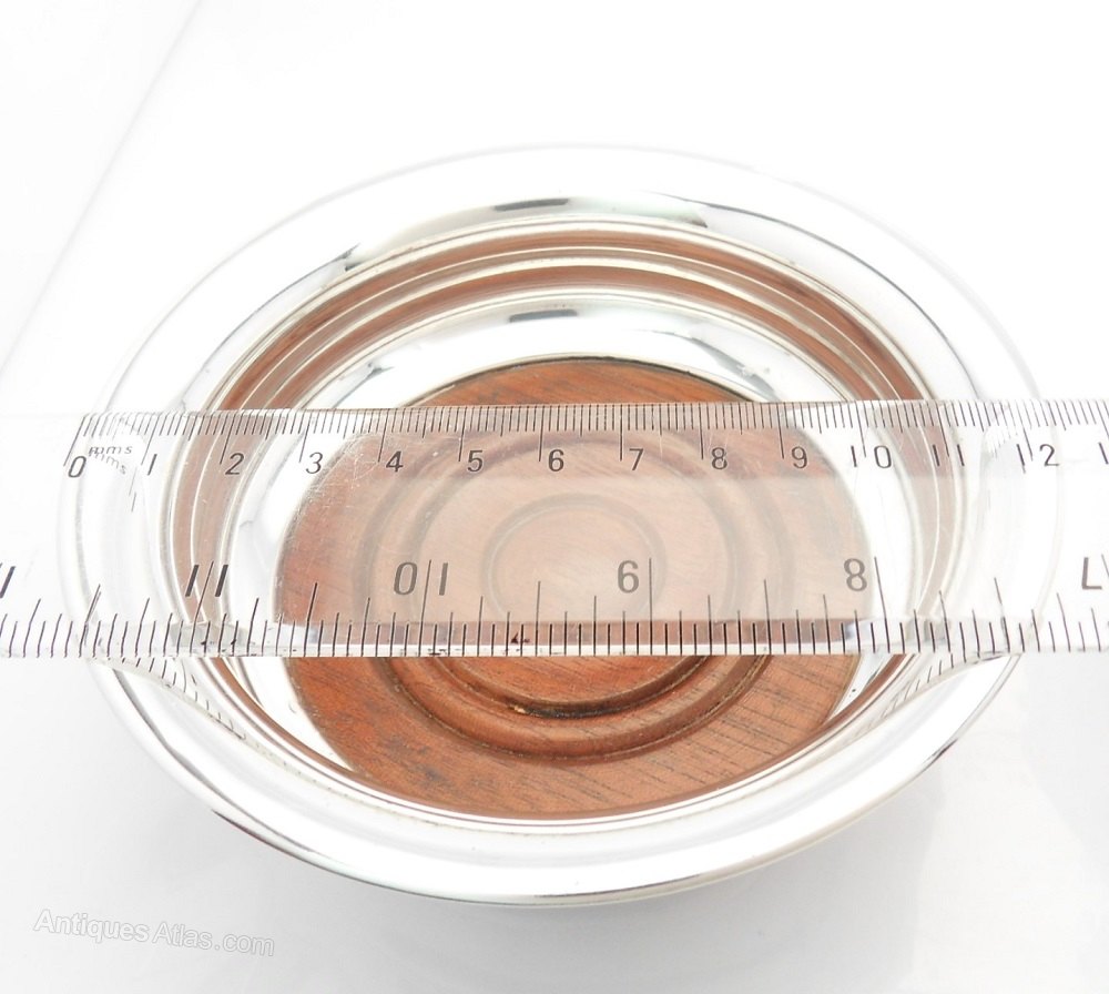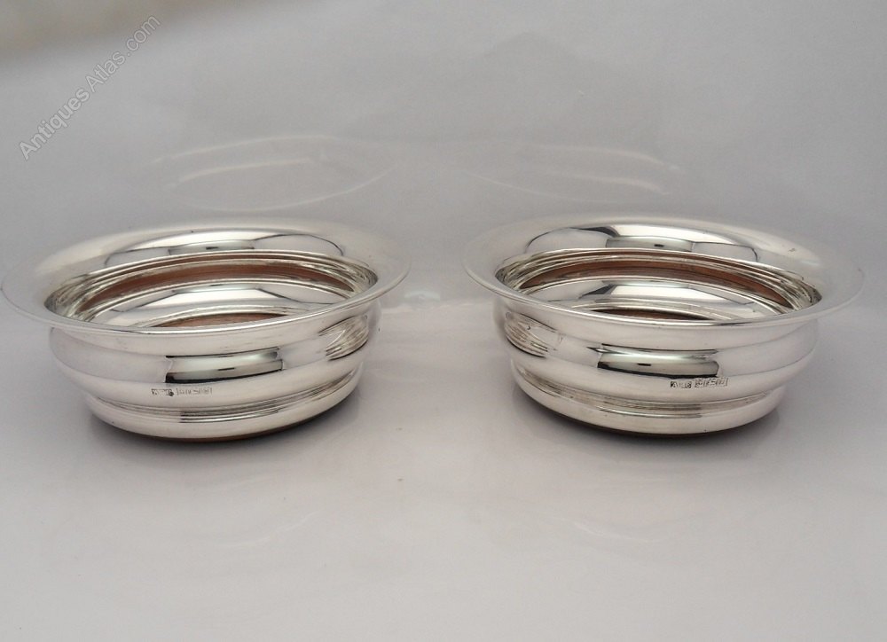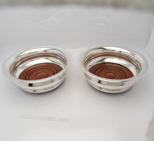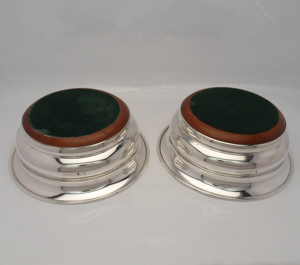 A very fine and stylish pair of silver wine bottle coasters. Lovely plain polished silver with no embossing or engraving apart from the clear hallmarks visible on both for the Birmingham Assay office with a date mark for 1969 and Lion Passant indicating sterling silver. The maker's mark is also clear: A T Cannon Ltd. The coasters have a nice wooden base which is covered with green baize to the underside.