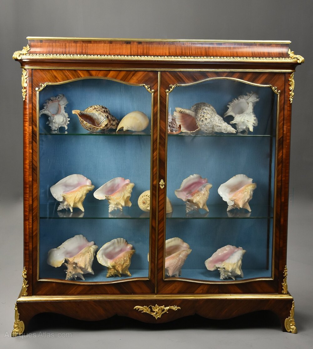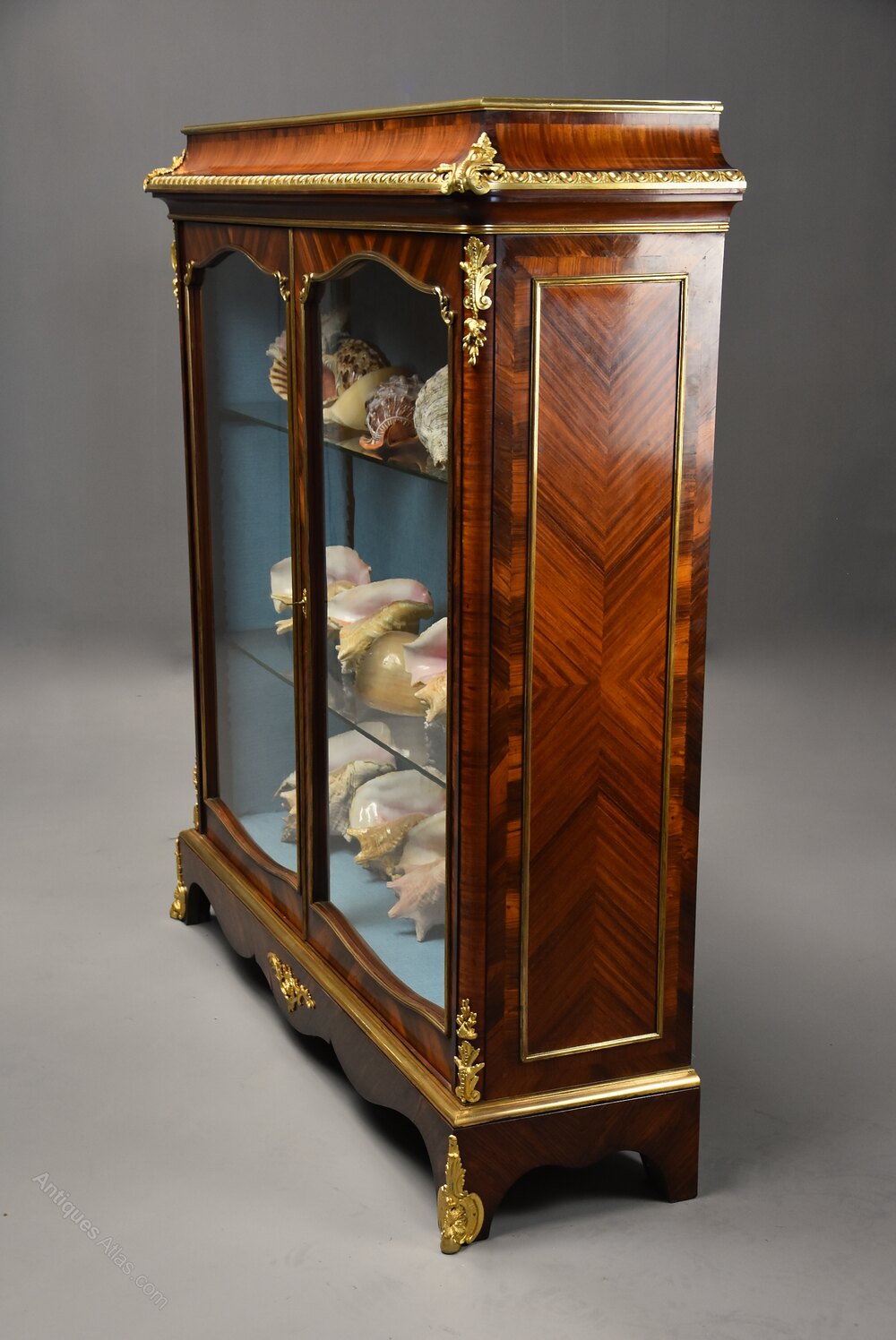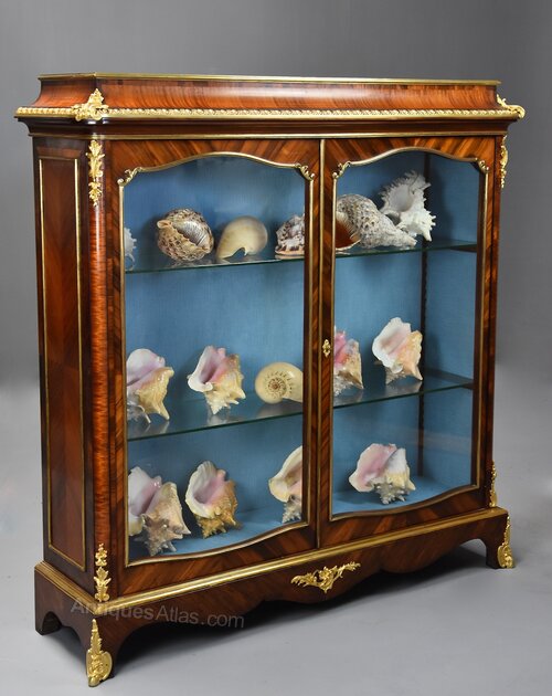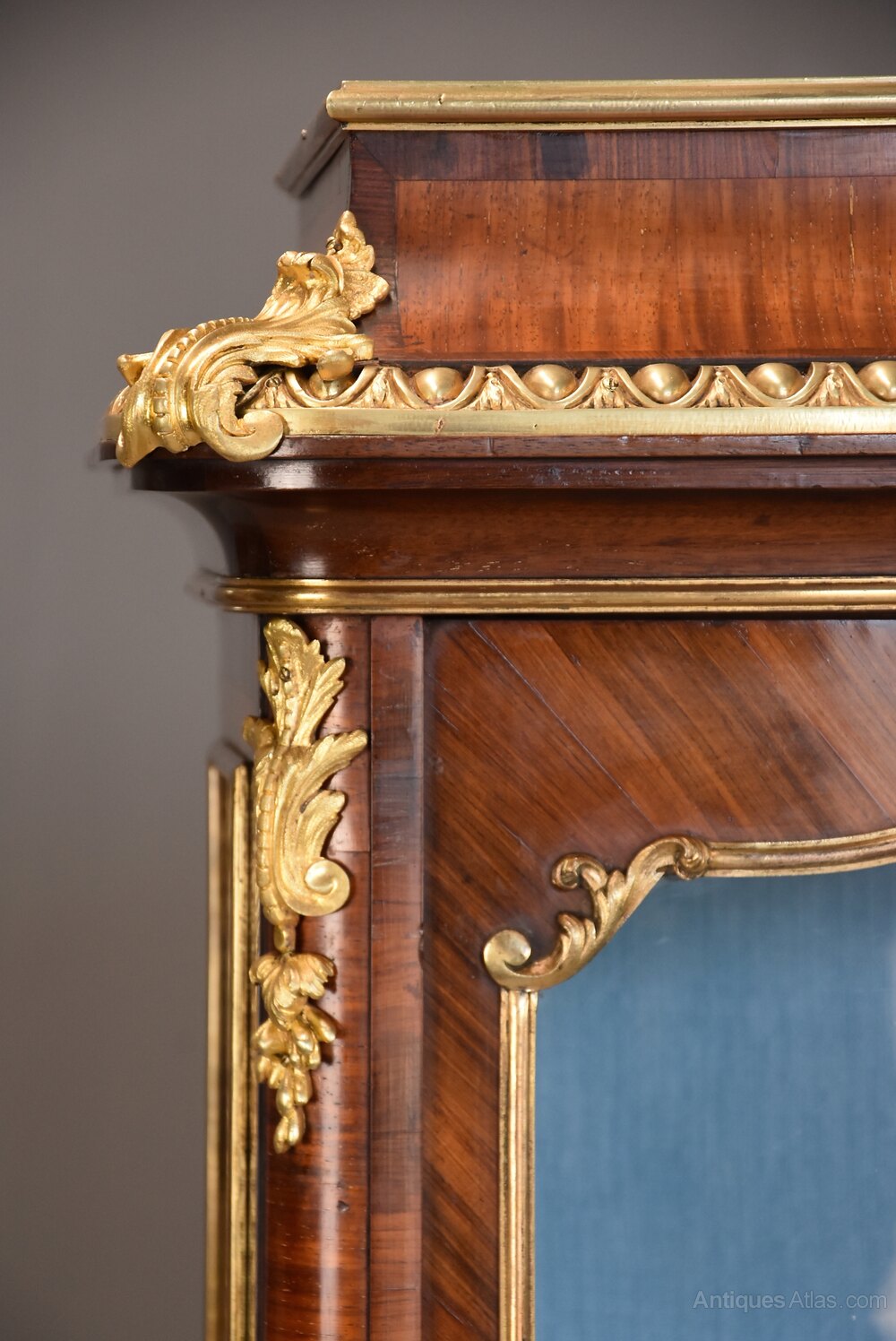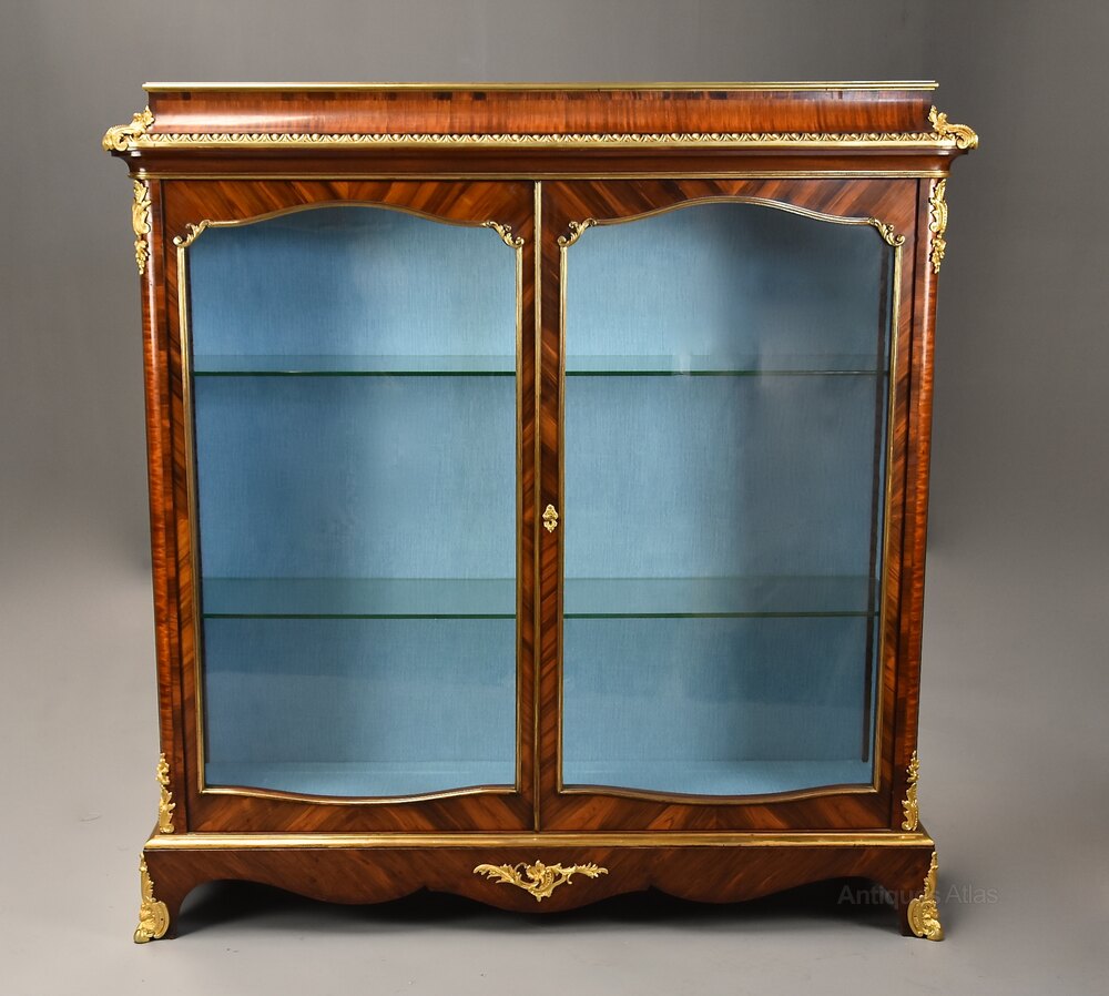 This display cabinet consists of a quarter Kingwood veneered top with ormolu moulding leading down to an inverted Kingwood cornice with egg and dart ormolu moulding below with foliate ormolu mounts to the front corners.