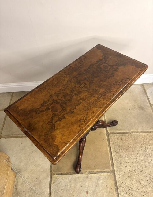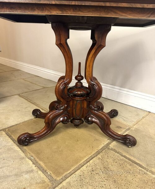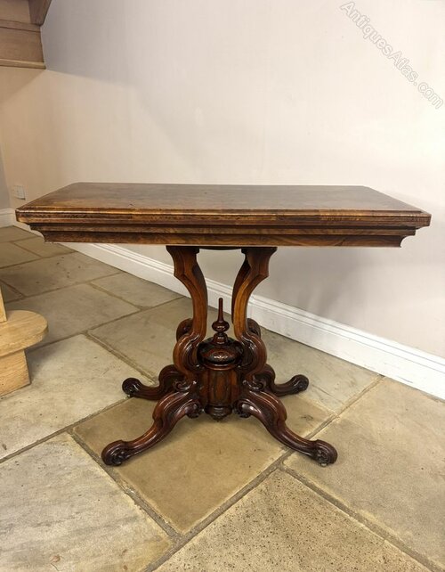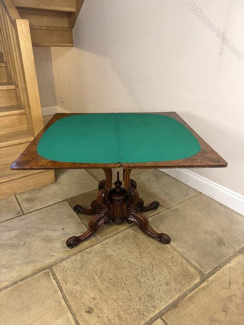 Fine quality antique Victorian walnut games table, having a quality walnut rectangular shaped top with rounded corners, having a swivel action opening to reveal a green lined playing surface, above a highly carved pedestal with scrollwork and a turned central finial terminating into four curved cabriole legs.