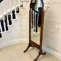 A stylish early 20th-century walnut cheval mirror. The mirror features an elegantly shaped rectangular plate set within a finely figured walnut frame supported between twin uprights with brass side adjusters and decorative finials allowing the mirror to tilt to the desired angle.