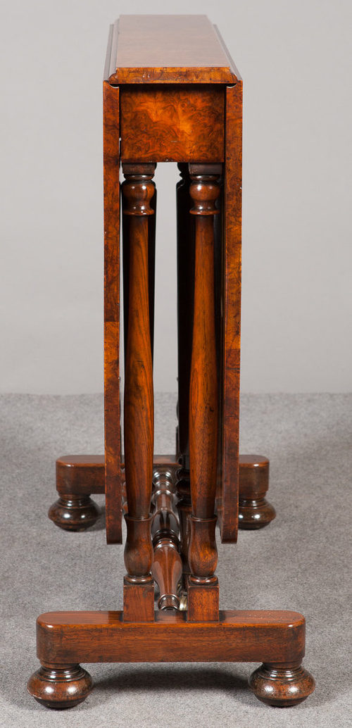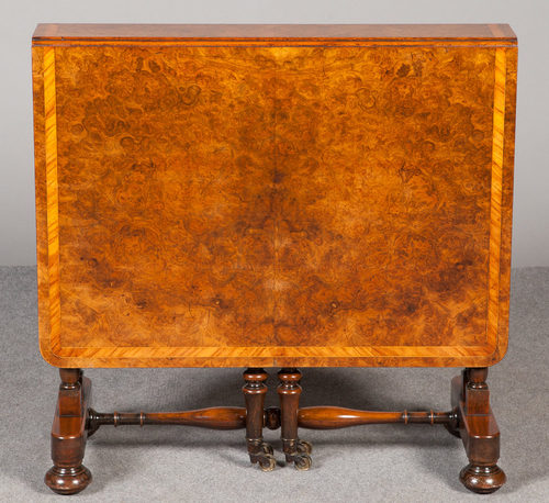 A superb Victorian burr walnut Sutherland table with full length leaves. The wonderful burr top with inset kingwood cross banding between lines of boxwood stringing. The base with dual end supports on a stretcher base with turned bun feet and original sunken castors. Unusually, with double gate leg supports to each leaf and brass cup castors. The slimline top of this table makes for easy storage and the underneath is almost as good as the top. Original patina, fully cleaned and waxed. Delivery to most of the U.K. £55. Sizes - Width..30''..76.5cm. Height..29.25''..74.25cm. Depth of Top..6''..15cm. Depth of Base..13''..33cm. Length Fully Open..46.5''..118cm.