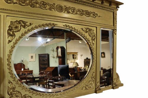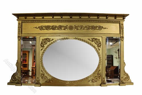 The original oval mirror plate is framed by an elegant laurel wreath surround, symbolising victory and refinement, with well-defined acanthus and floral spandrels to each corner. The central plate is complemented by narrow rectangular side plates, adding both depth and light while enhancing the symmetry and architectural balance of the design.