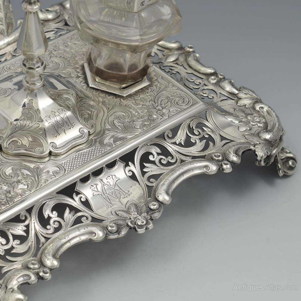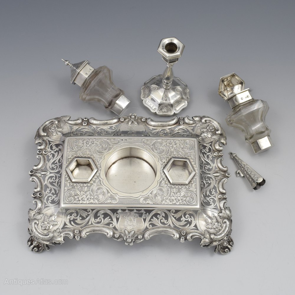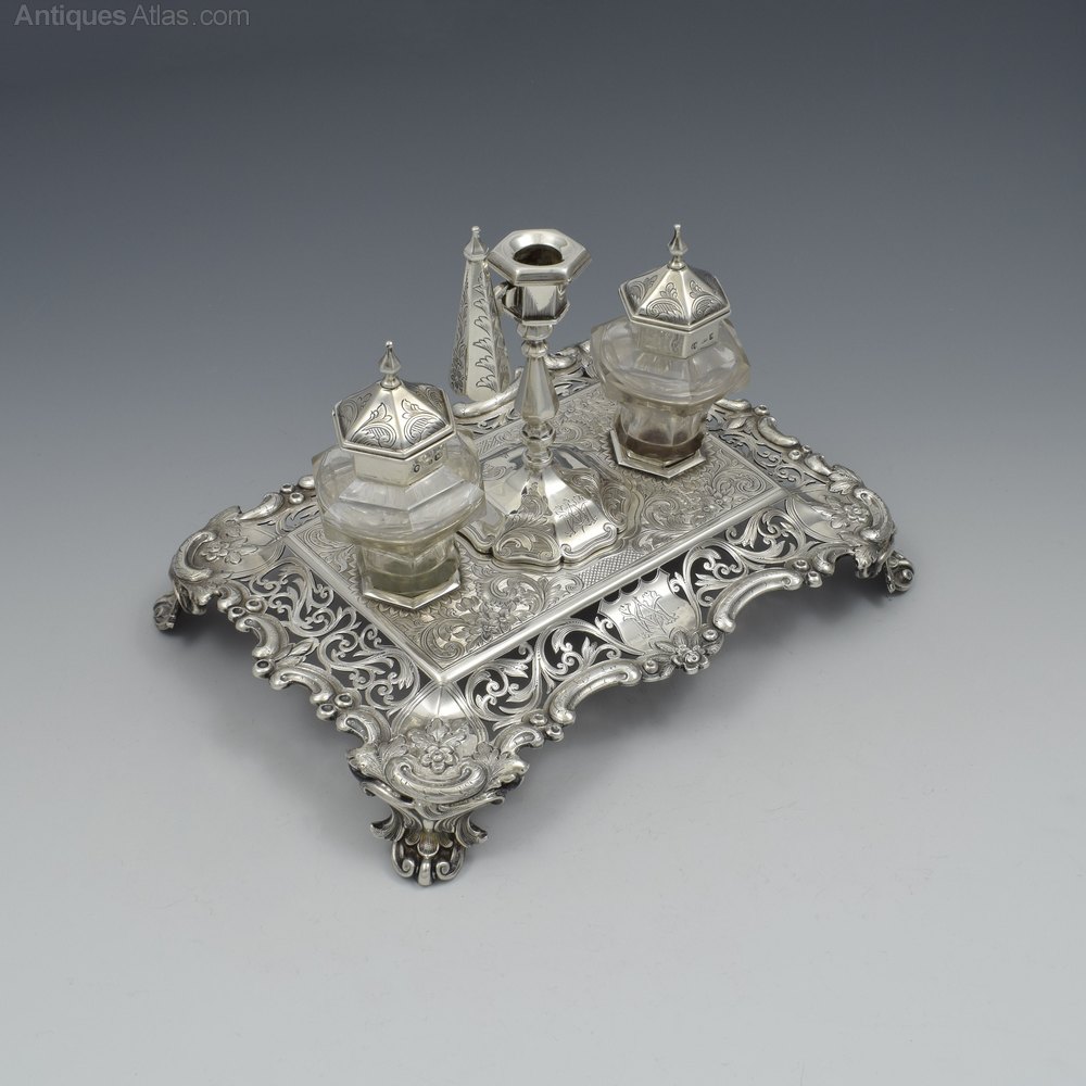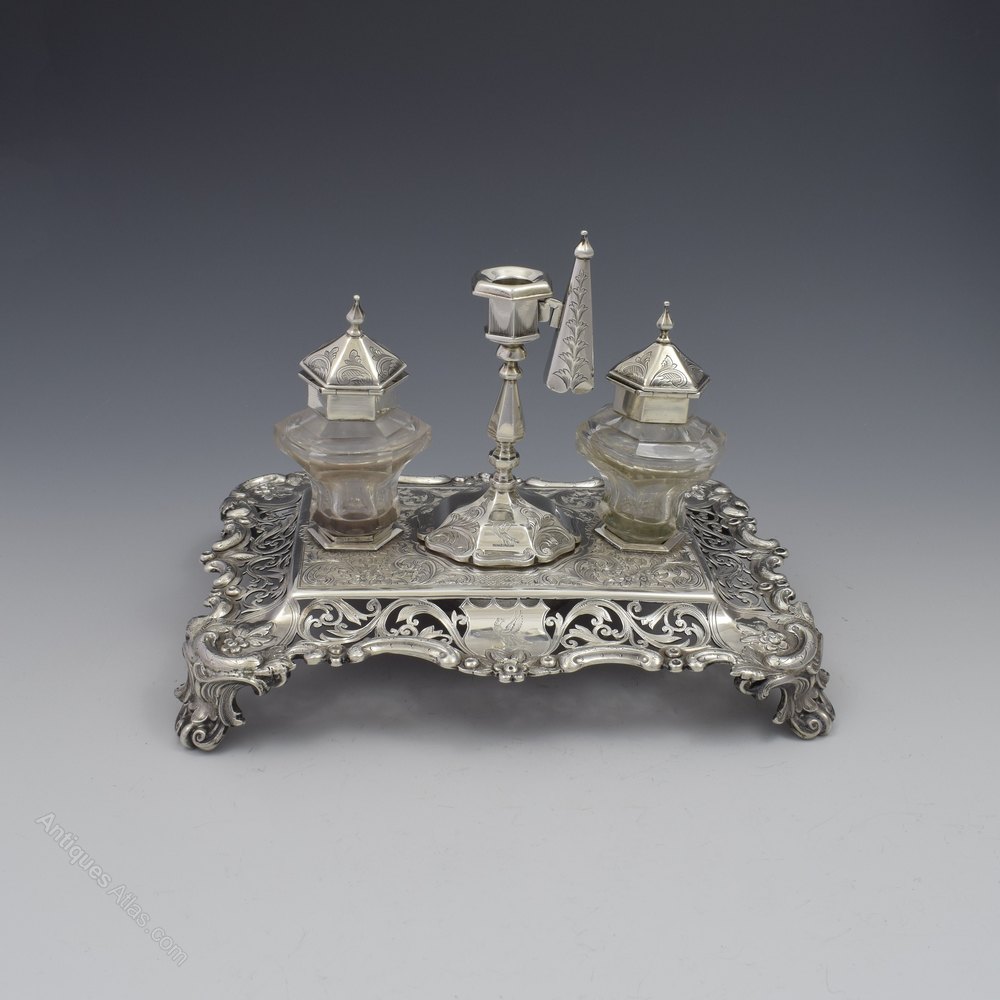 A lovely quality Victorian sterling silver double inkstand raised on ornate cast feet with curved walls with finely pierced decoration of scrolling vines reserving a shield shaped cartouche on either long side and shaped reserves in each corner decorated with embossed flowers and leaves with further textured detail. The shaped edge also decorated with embossed decoration of scrolls and flowers. The main plate is finely machine engraved with flowering vines against a hatched background. Set into the stand are the original cut glass inkwells, of curved hexagonal shape with silver collars and hinged covers. In between is a sunken circular box surmounted by a fitted taperstick with separate sconce and matching snuffer. The inkwells, taperstick and snuffer all have matching engraved decoration.