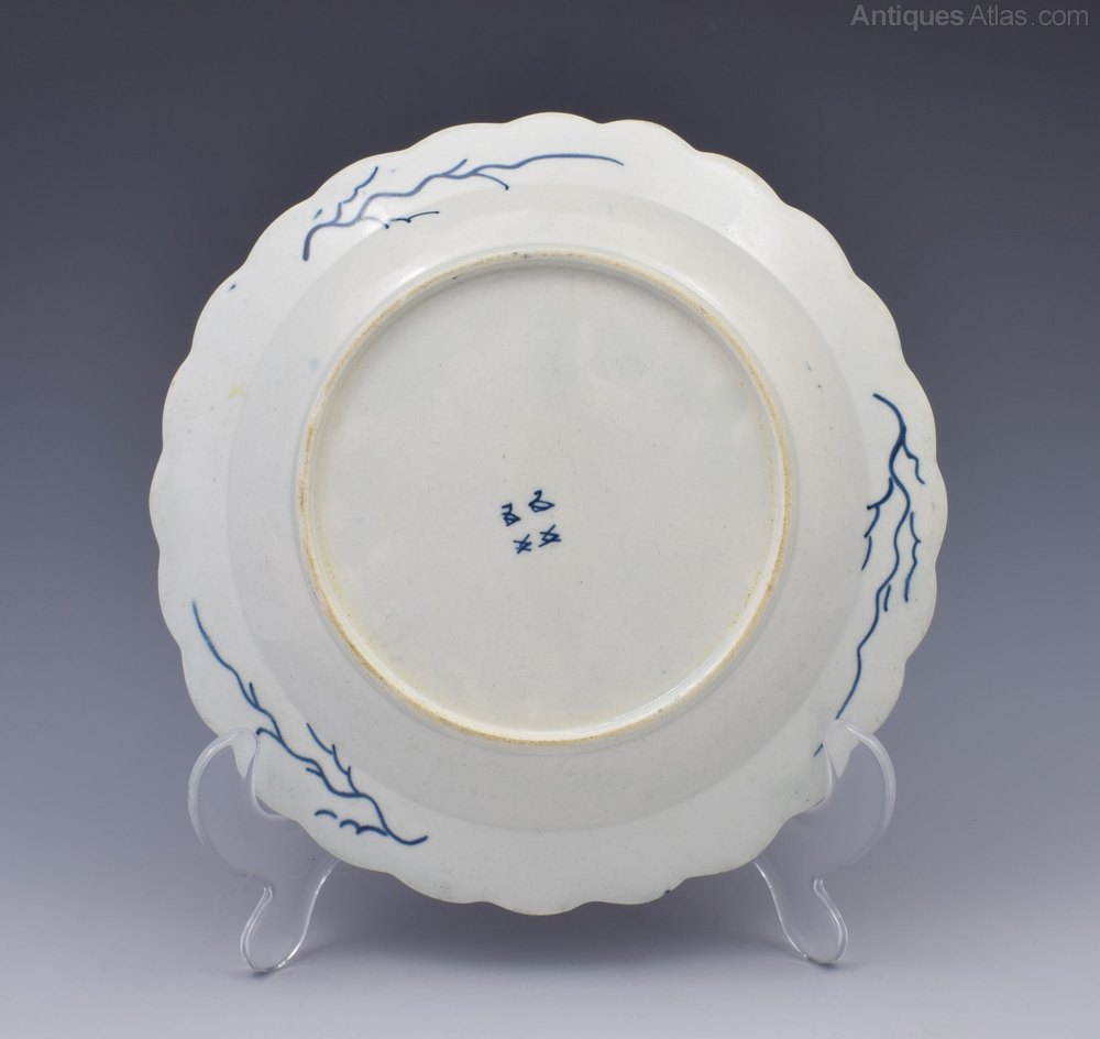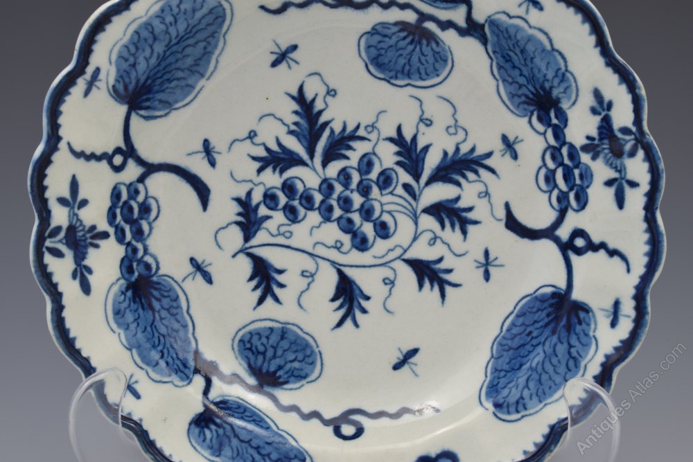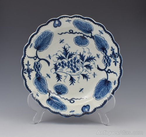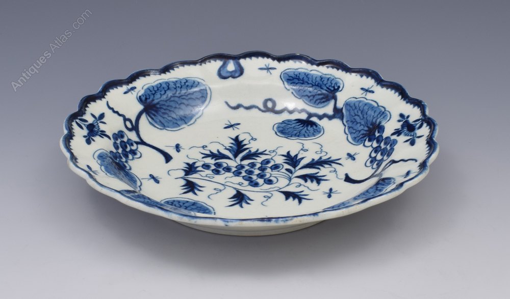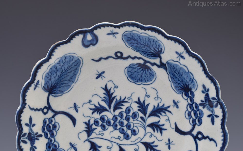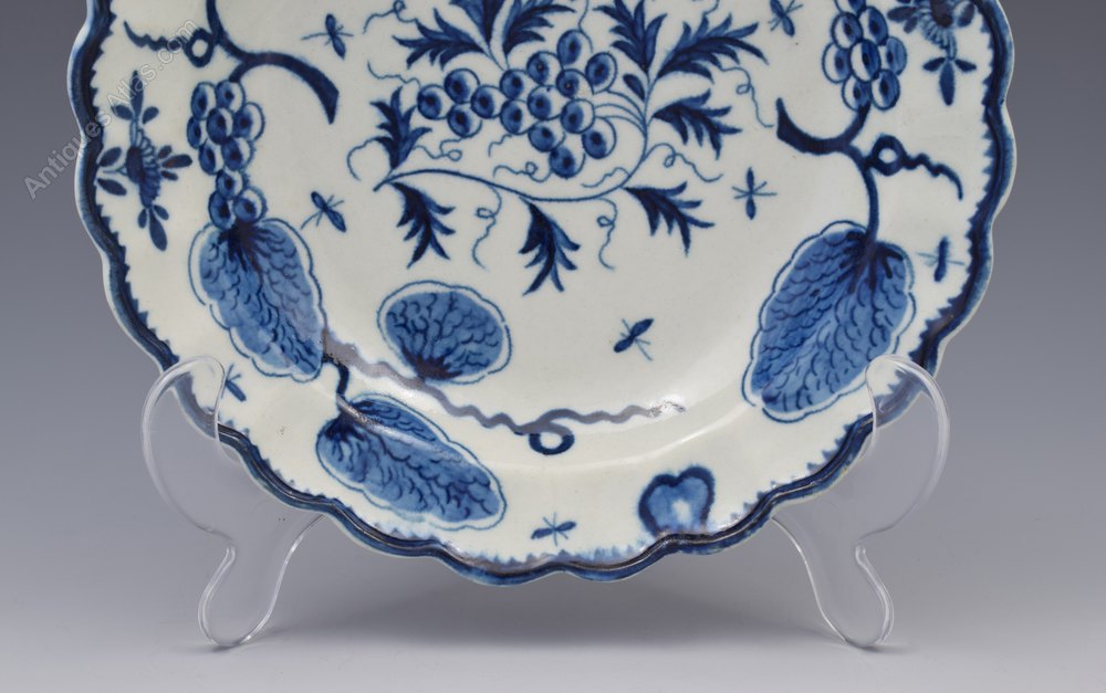 First Period Worcester lobed circular plate painted in underglaze blue with the Rubber Tree Plant pattern, c.1775. With decorative branches and pseudo Chinese marks to the reverse as is specific to this pattern. Referenced in Worcester Blue & White Porcelain 1751-1790, Branyan, French & Sandon, section I.E.47, classed as "uncommon".