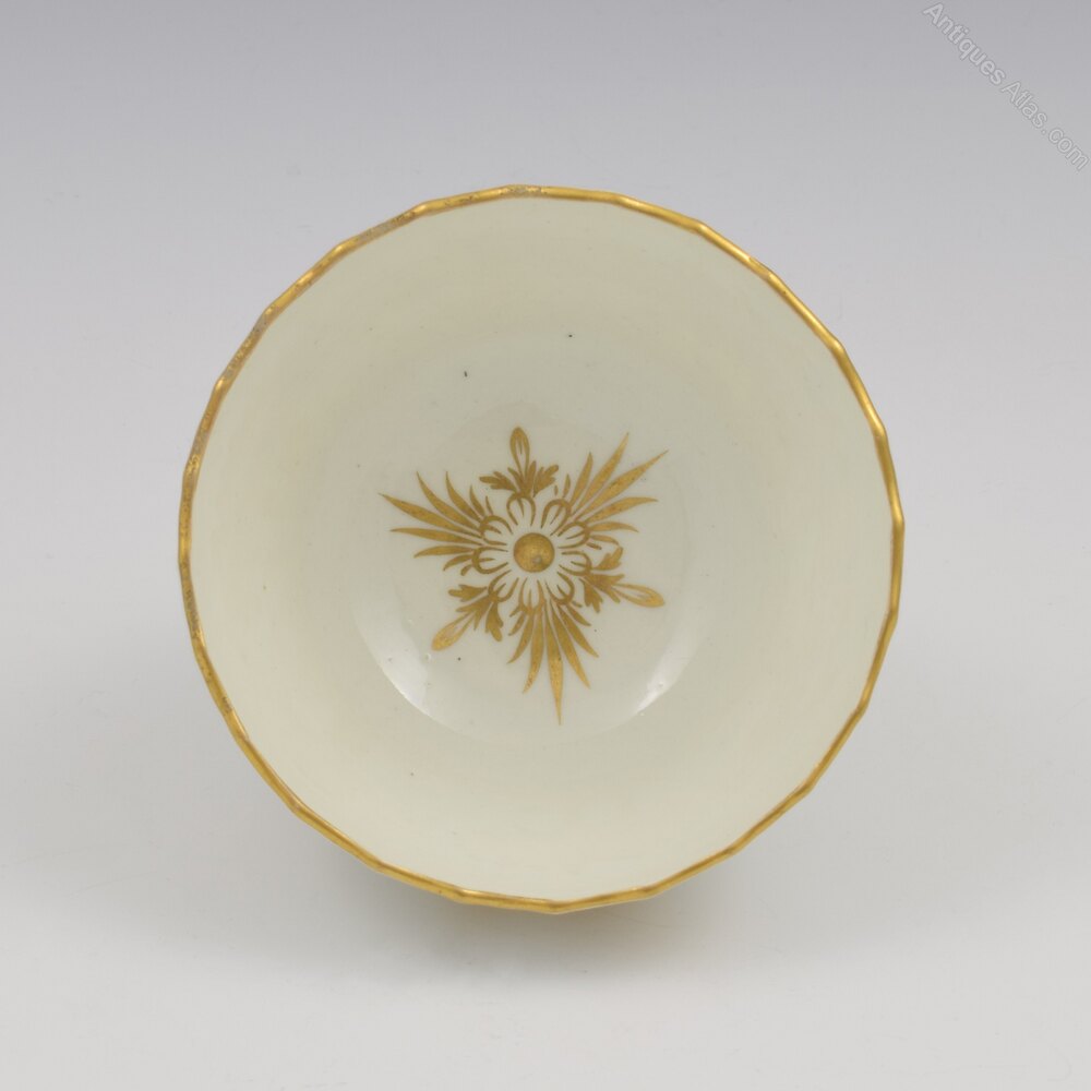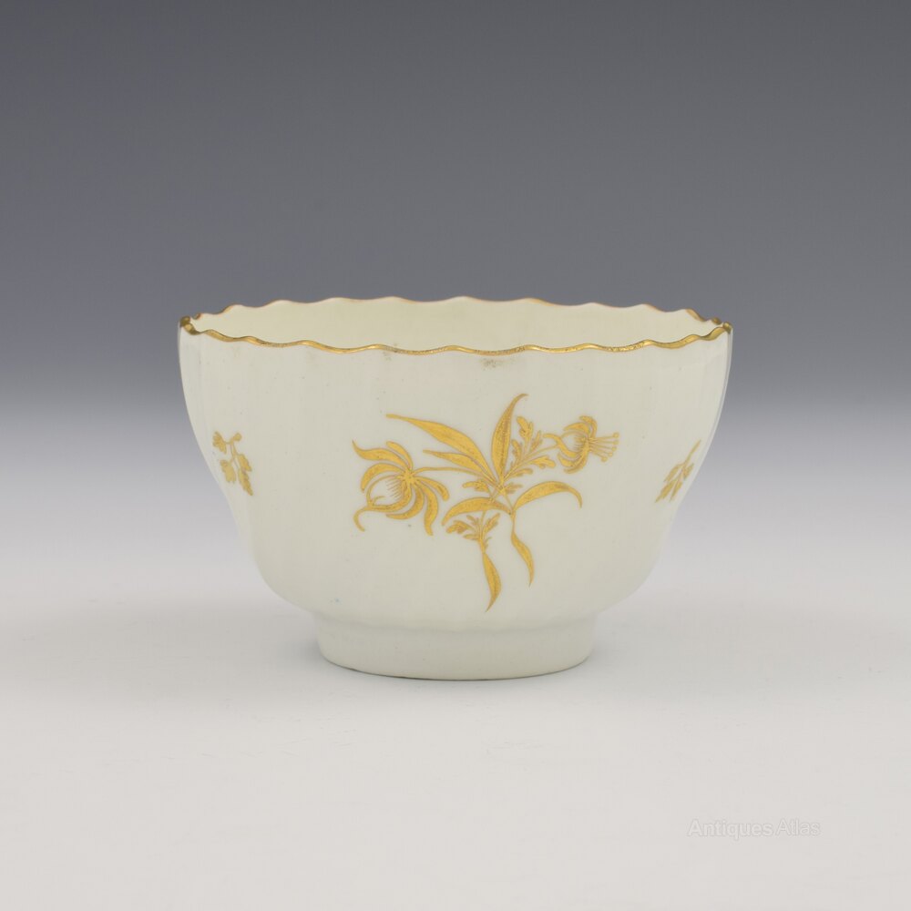 A very pretty Worcester spiral fluted porcelain tea bowl and saucer with beautiful gilded stylised flowers and sprigs and both pieces with an ornate starburst design to the centre and finished with gilded scalloped rims. c.1785.