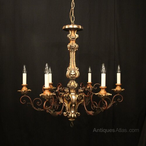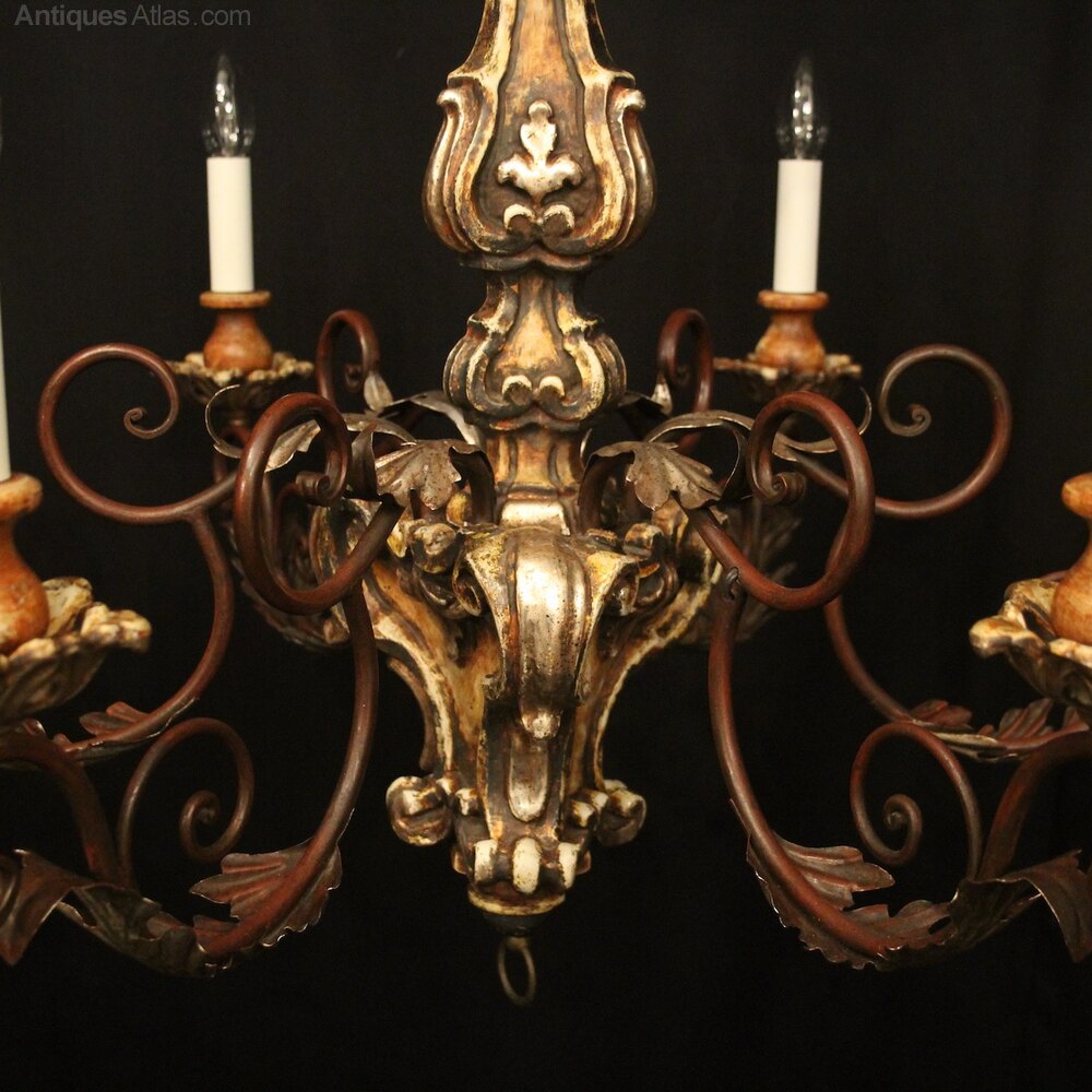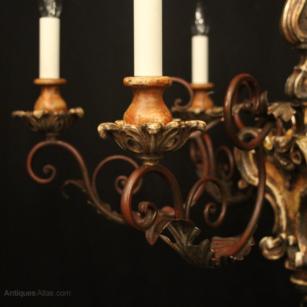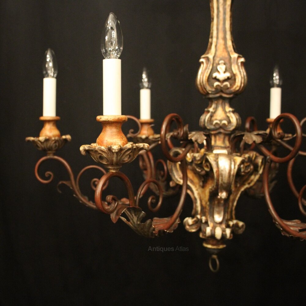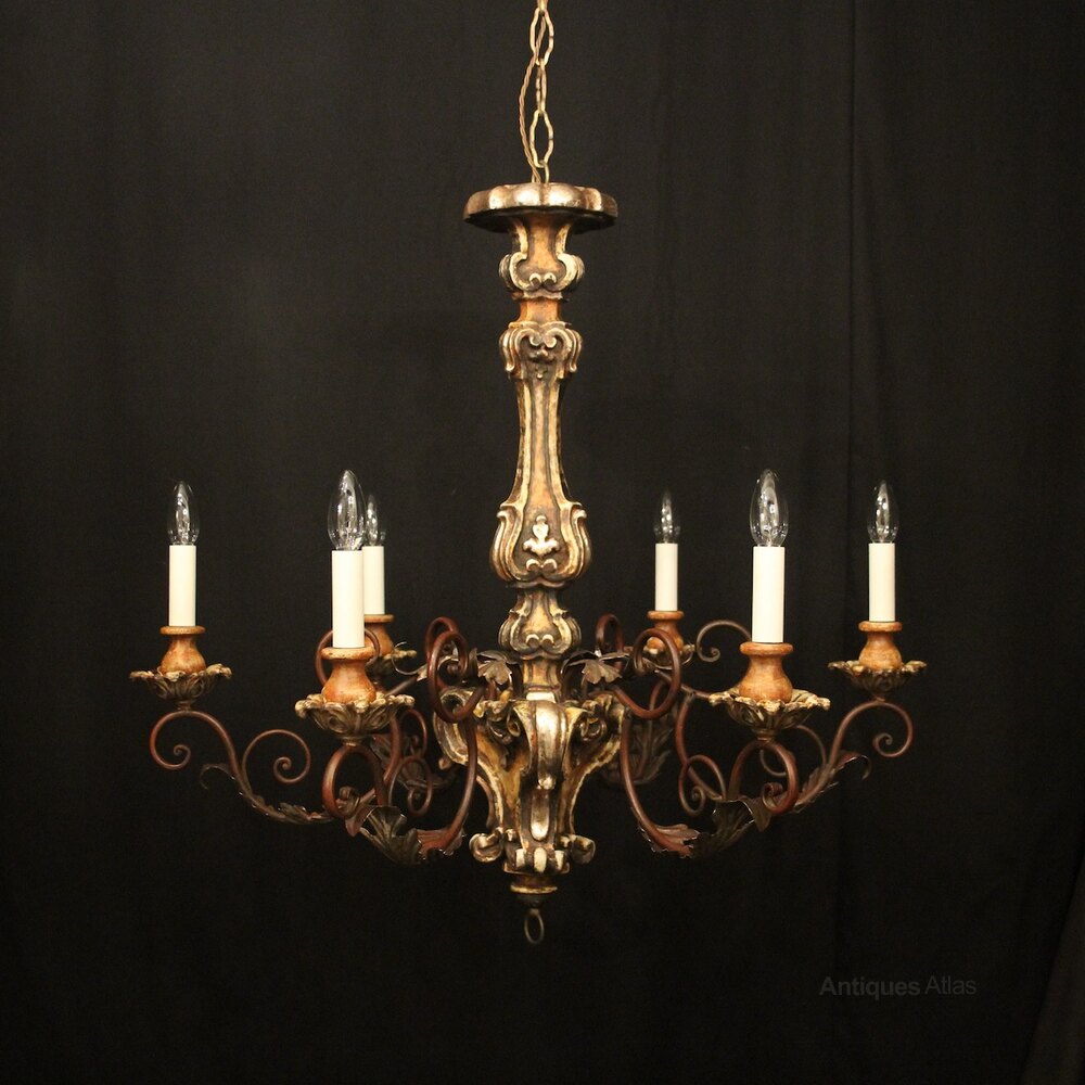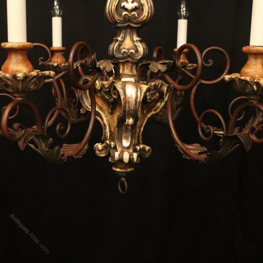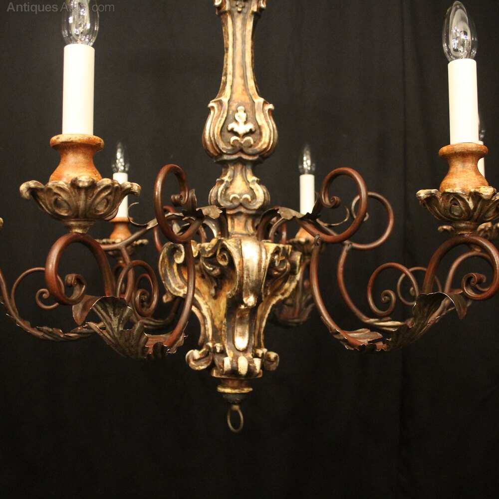 A lovely Italian Florentine carved wooden silver gilded polychrome 6 light antique chandelier, the Acanthus toleware leaf scrolling arms with carved pierced wooden bobeche drip pans and bulbous candle sconces, issuing from an elaborate baluster central column with leaf decorative embellishments, having the original chain and ceiling rose, nice patination with original colouration and good scale. Fully rewired and PAT tested. All our chandeliers come with ceiling fixings and spare bulbs.