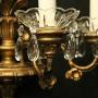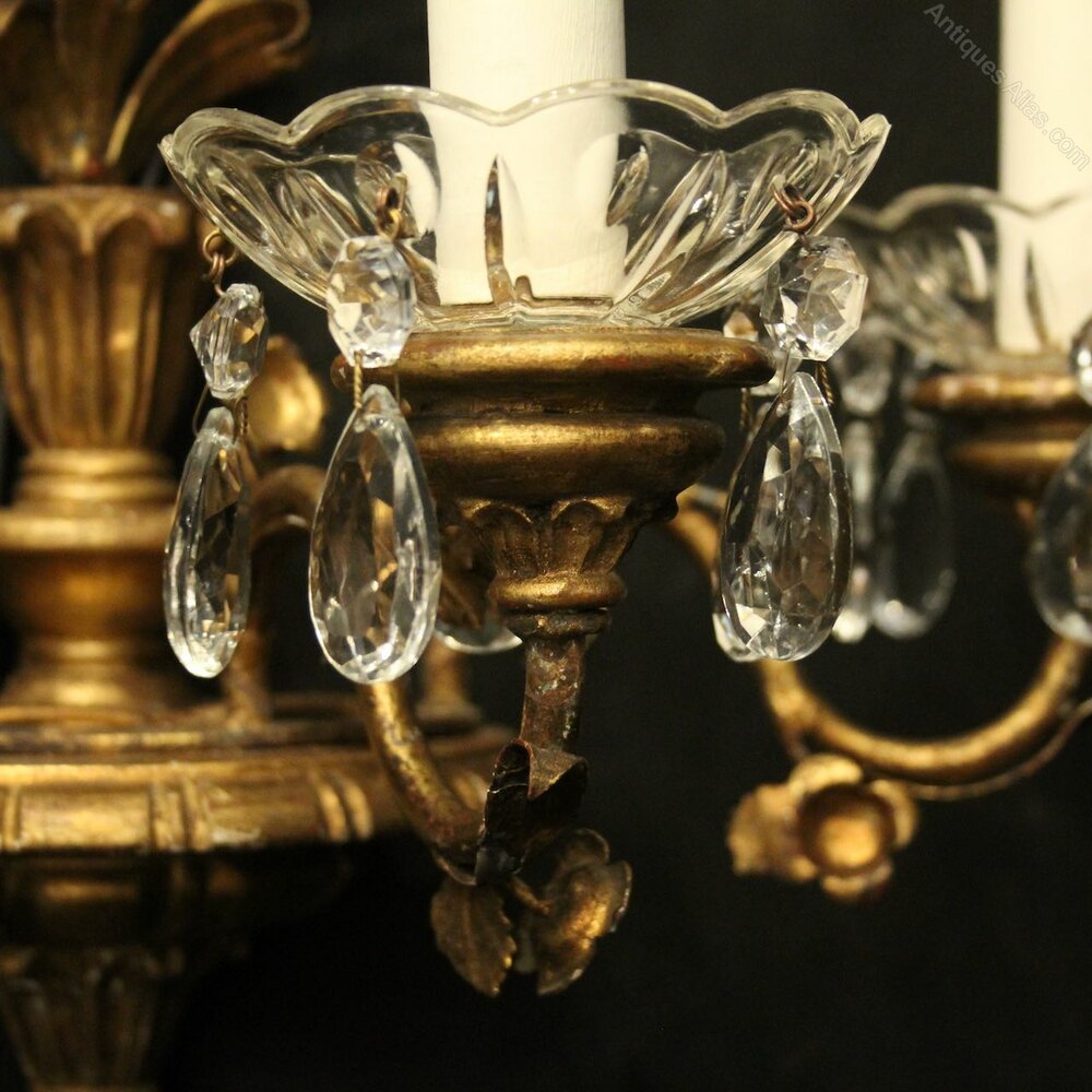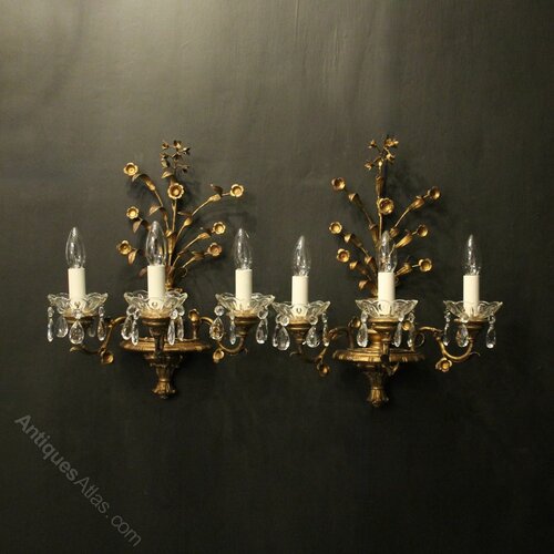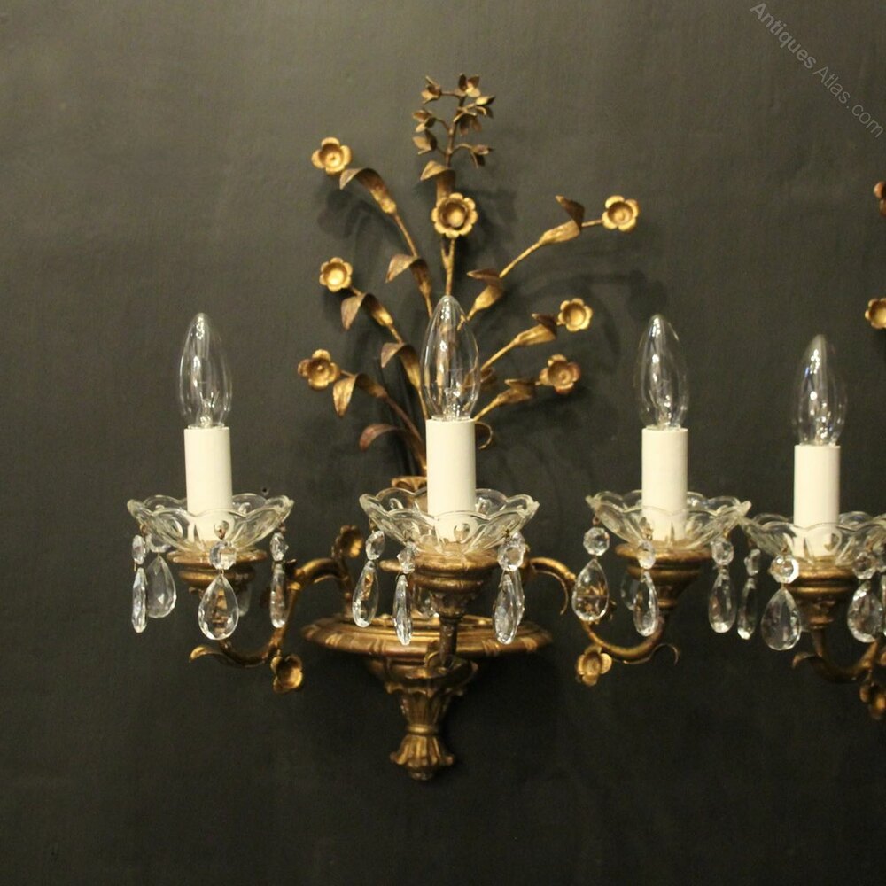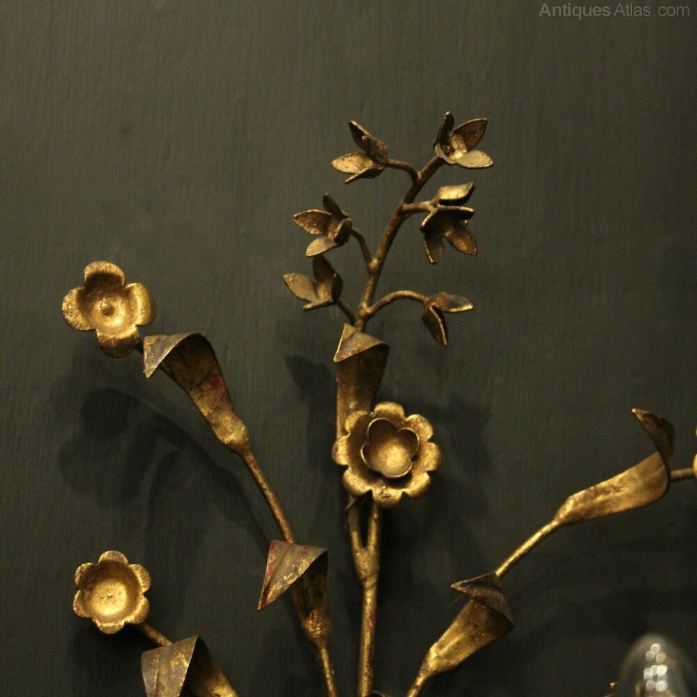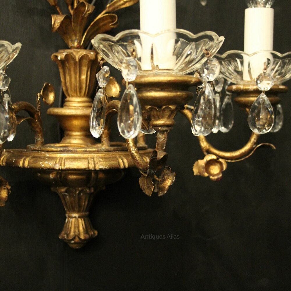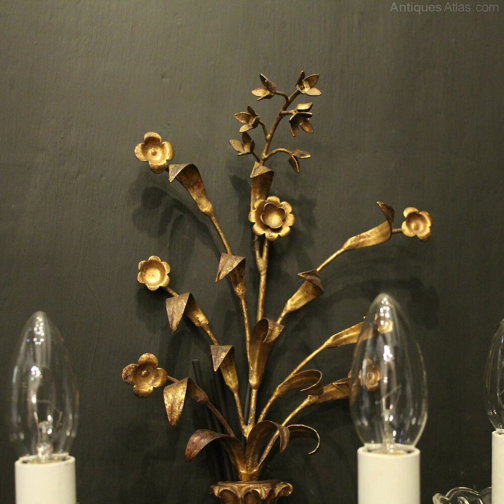 A decorative Italian Florentine carved giltwood and Toleware triple arm antique wall lights, the toleware leaf scrolling arms with giltwood base and glass bobeche drip pans, issuing from a pretty floral backplate, with carved giltwood base, nice original gilded patination. Fully rewired and PAT tested. All our wall lights come with aged brass screws or brackets for fixing and spare bulbs.