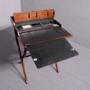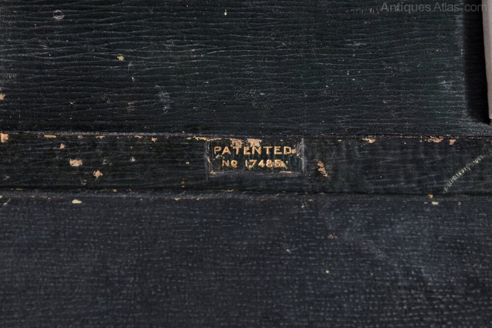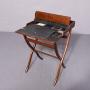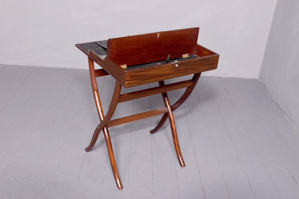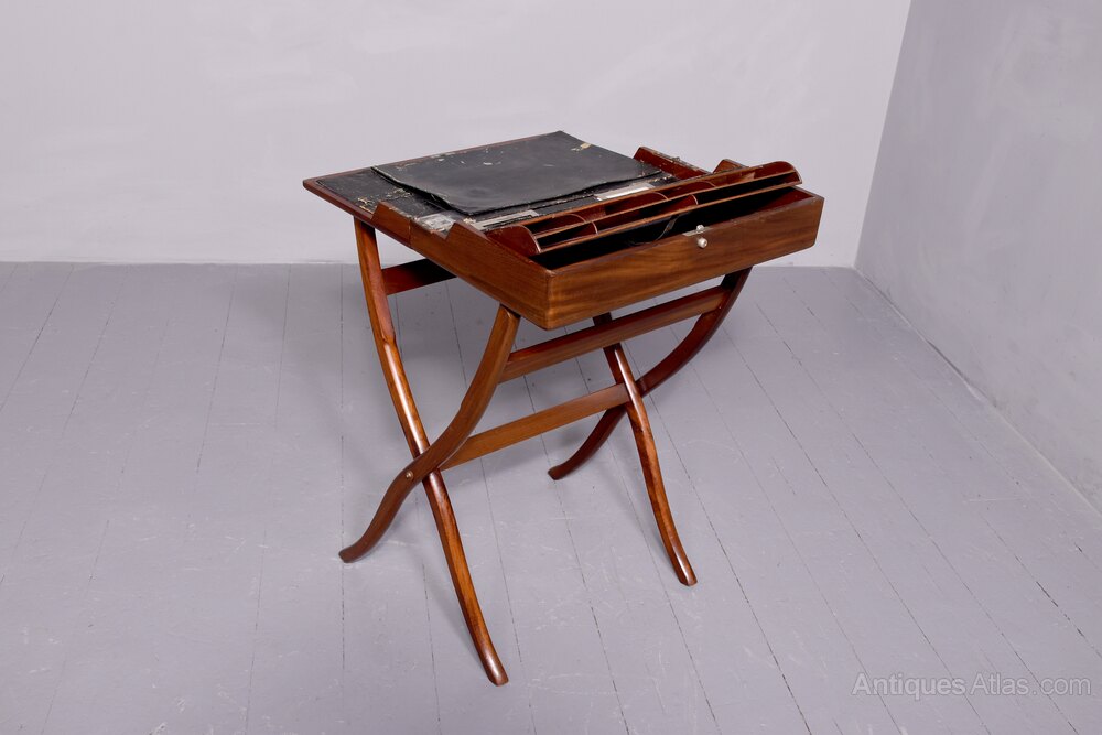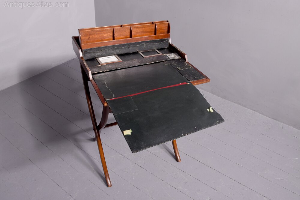 Circa 1900. A neat sized mahogany folding campaign desk, with rectangular body with panels front and back, with a small proud circular button on the top for releasing the locking mechanism, the underside with a polished steel clasp for locking it into the open position, all supported on a stylish X-shaped frame, inside with a spring- loaded bank of divisions in mahogany with small plaques for messages and a leather writing surface.