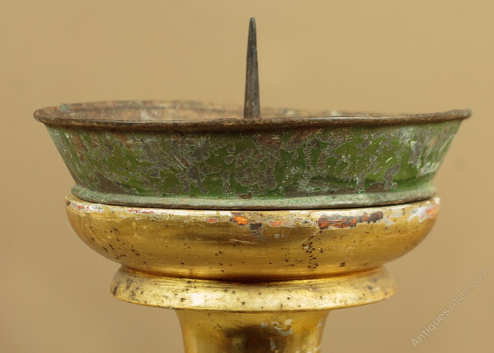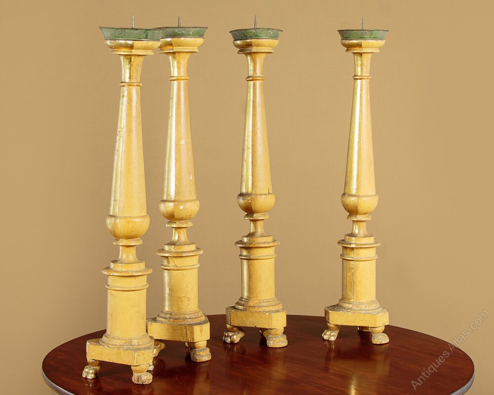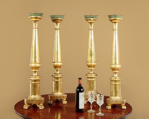 Set of four large early 19th.c. giltwood and toleware pique cierge candlesticks c.1810. Standing 36" tall with a spike on top to hold a large candle in place. Retaining the original green painted toleware dishes (5" diameter) to catch dripping wax, quite a rare feature. Turned baluster columns on triangular bases with carved claw feet. Retaining the original gilding to the front, note how the rear of each is left ungilded. Presented as found in very good original condition.