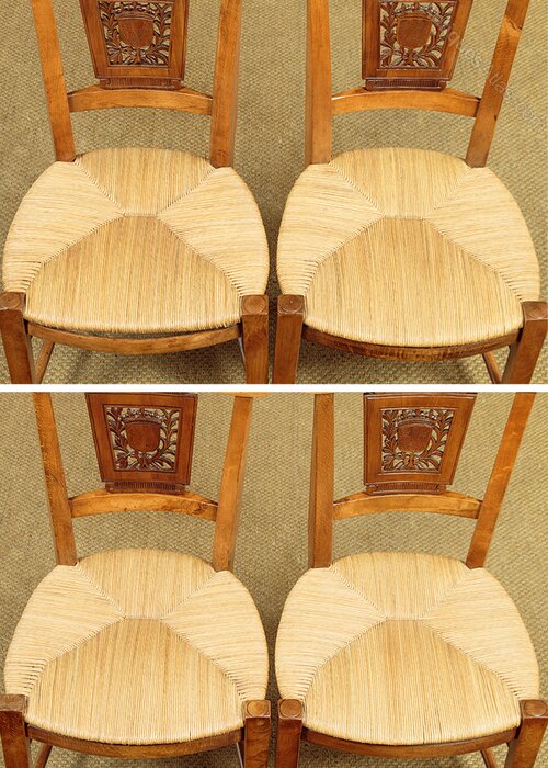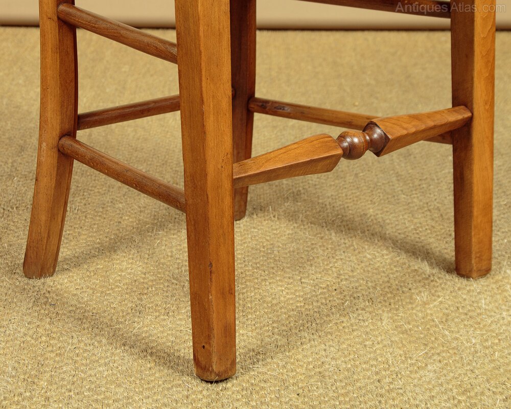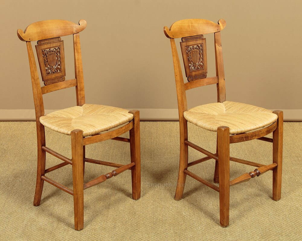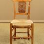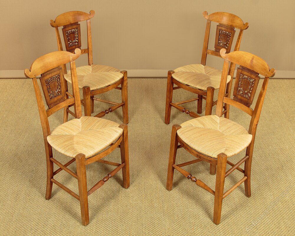 Charming set of four small rush seated dining chairs. Beechwood frames with unusual shaped top rails over cherrywood splats carved and pierced with a design featuring a shield topped with a coronet and surrounded with laurel or olive sprigs. Woven rush seats (height 17") raised on square tapering legs with turned stretchers to the sides and rear and a diamond shaped stretcher with turned centre at the front. Excellent condition, cleaned and waxed in our workshops.