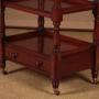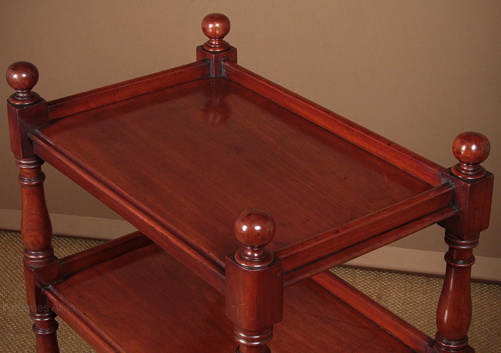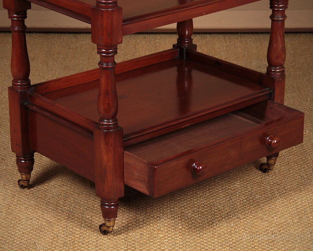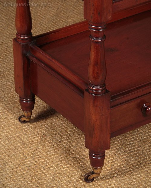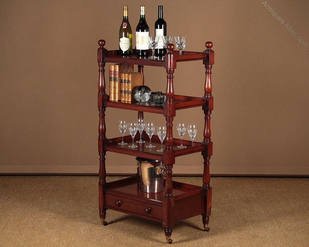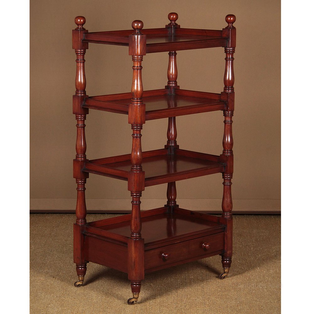 Useful mid 19th.c. mahogany four tier stand or dumb waiter c.1870. Just 24″ wide, ideal for drinks or as a side table. Four solid mahogany shelves with a raised edge to the sides and rear and a thumb moulded front, over a useful little drawer in the base. Good turned columns front and rear with ball finials. Raised on quality brass cup castors. Excellent colour and condition, cleaned and waxed in our workshops.