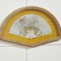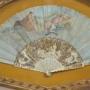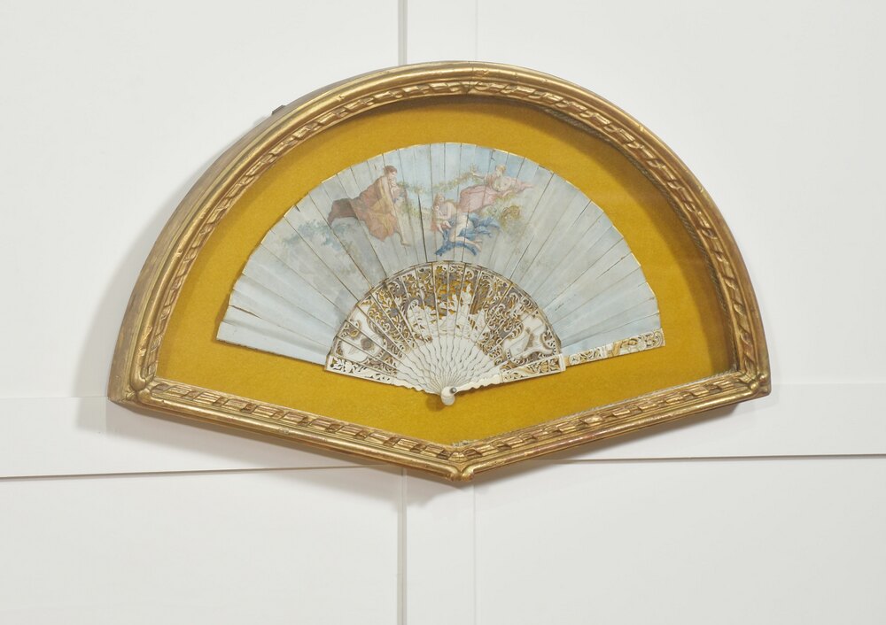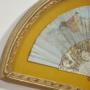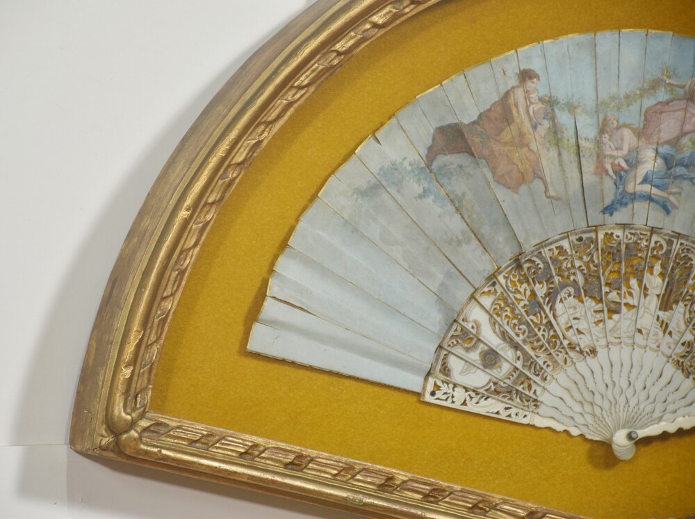 This decorative framed fan is an elegant example of nineteenth-century European craftsmanship, combining intricate carving with delicate painted decoration. The fan is mounted open within a gilt frame lined with gold fabric, allowing the full arc of the design to be displayed as a wall piece. The sticks and guards are finely pierced and carved, forming an ornate pattern of scrolling foliage and decorative motifs radiating from the central rivet.