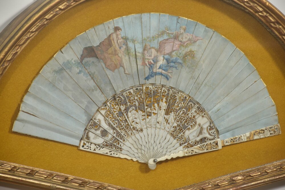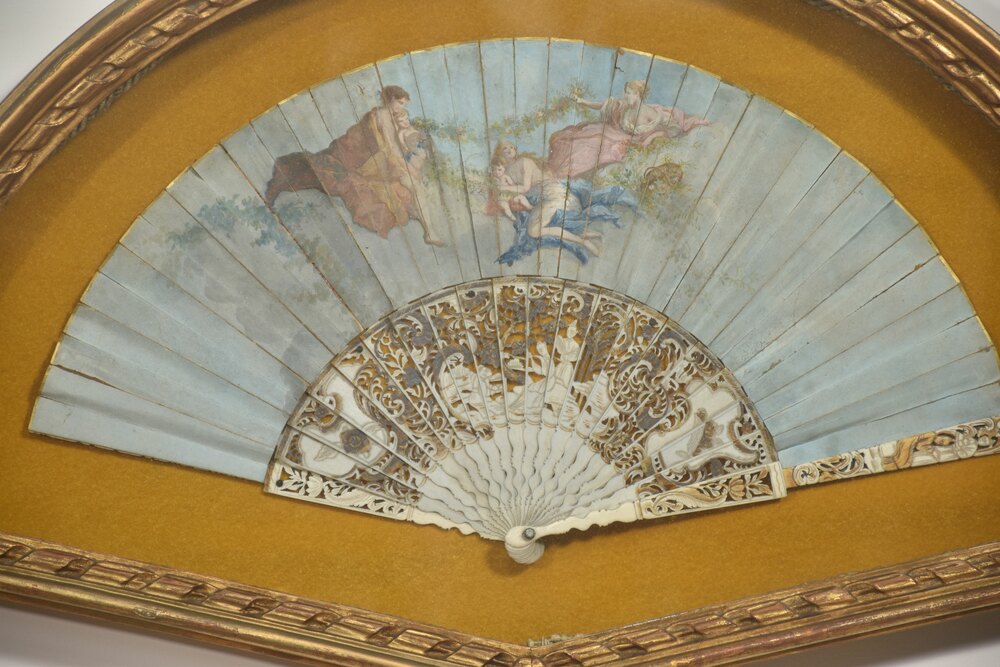 The pale blue leaf is hand-painted with a pastoral scene depicting classical figures in flowing drapery gathered within a soft landscape. Two figures extend floral garlands toward a seated female figure and child, creating a gentle allegorical composition typical of Rococo-inspired decorative themes. Presented within its shaped gilt frame, the piece functions as both a historical accessory and a decorative artwork, highlighting the refined artistry associated with fashionable fans of the period.