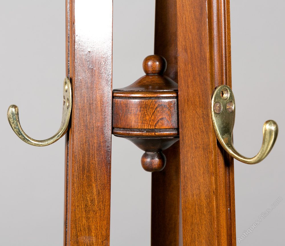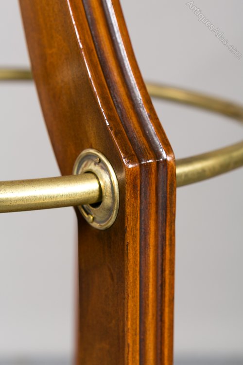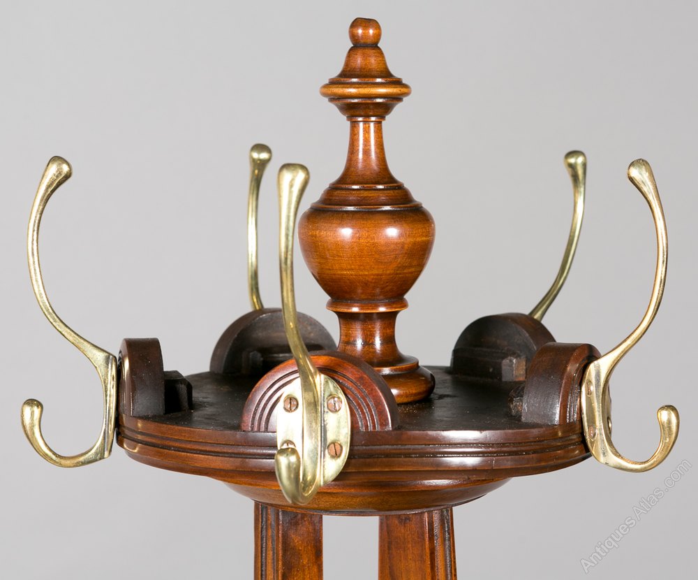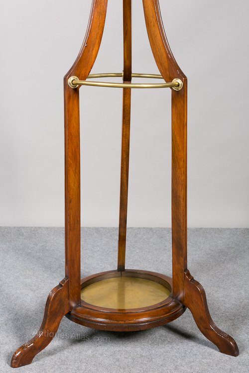 A circular mahogany stained hallstand. The top having a turned finial with a revolving platform which houses the 5 brass coat hooks. The 3 shaped supports with 3 further hooks and a brass rail to hold walking sticks and umbrellas. The base with a sunken brass liner and standing on 3 shaped and outswept feet. In very good condition- re-polished and cleaned in our own workshops. Sizes- Height...81''/ 206cm. Max.Diameter (at the base)...26''/ 66cm. Delivery to most of U.K. mainland £55.