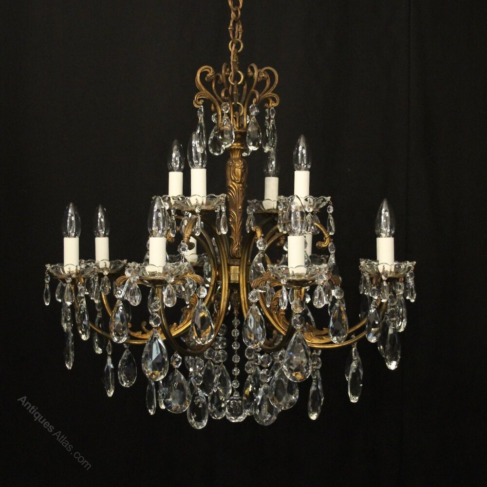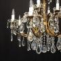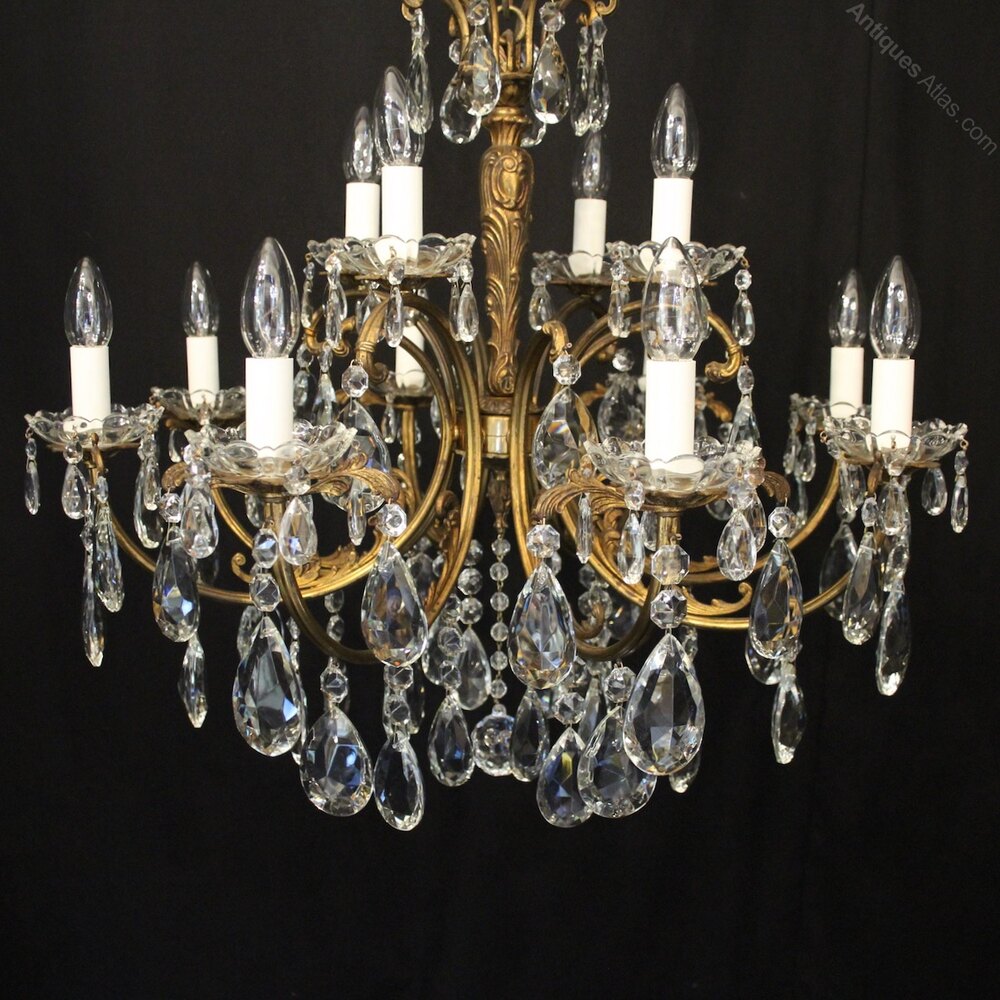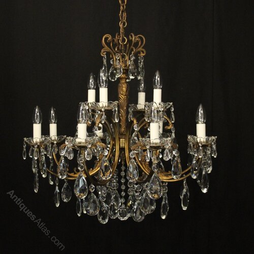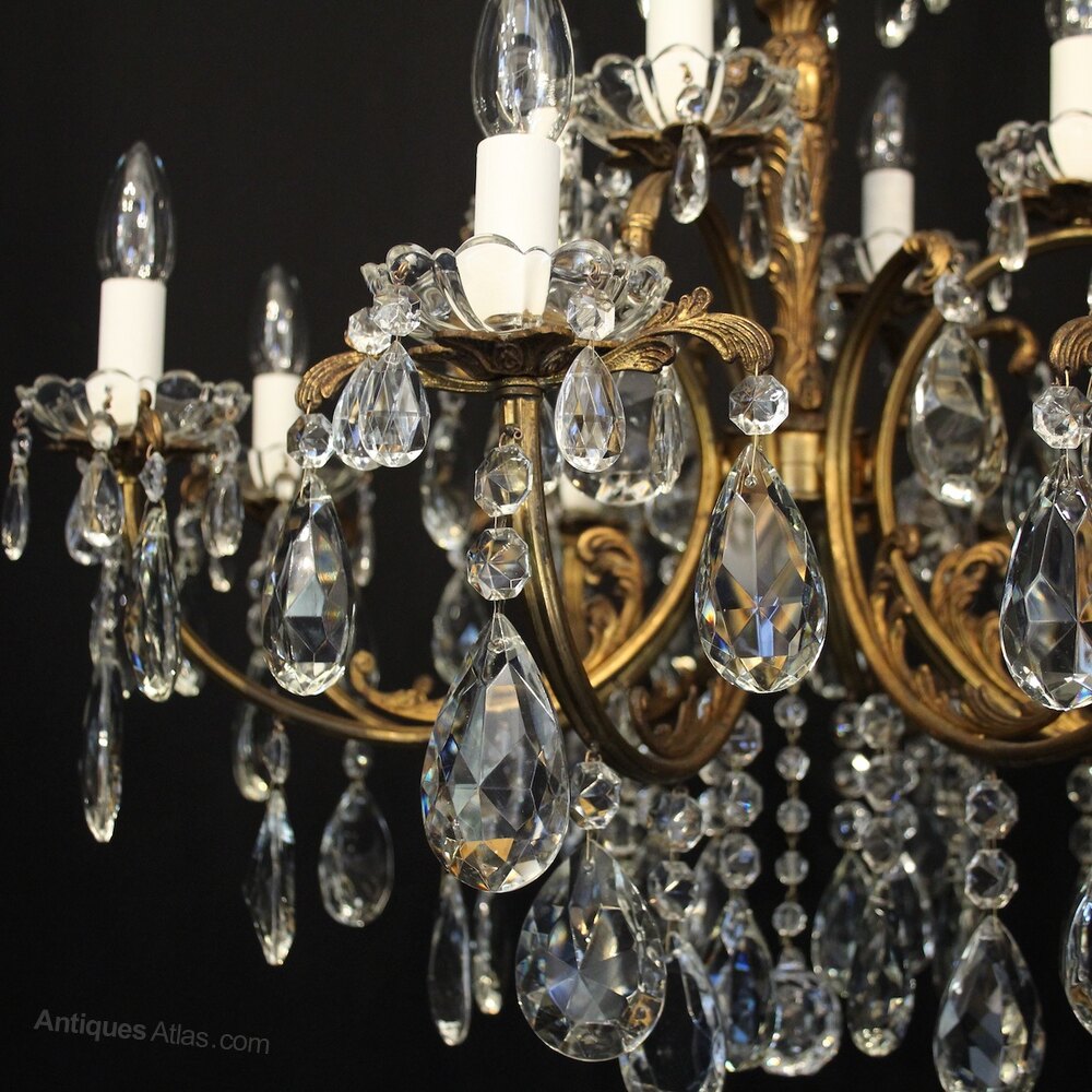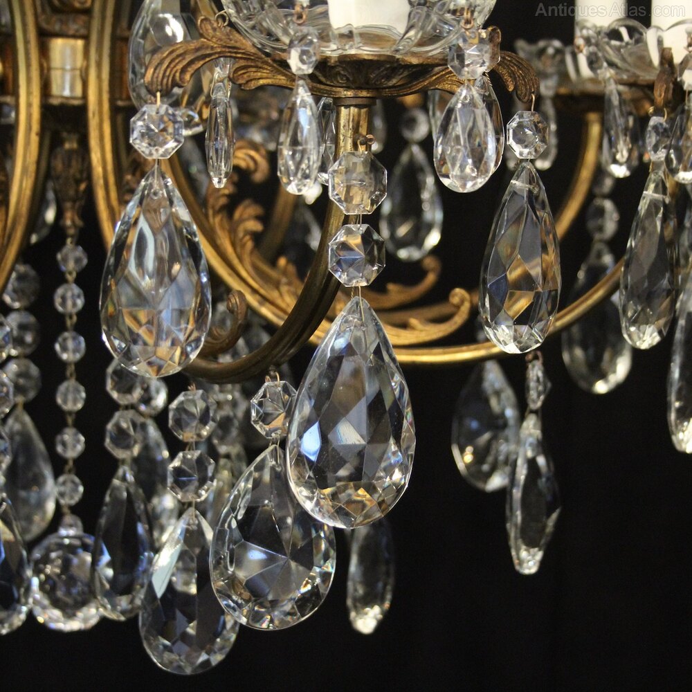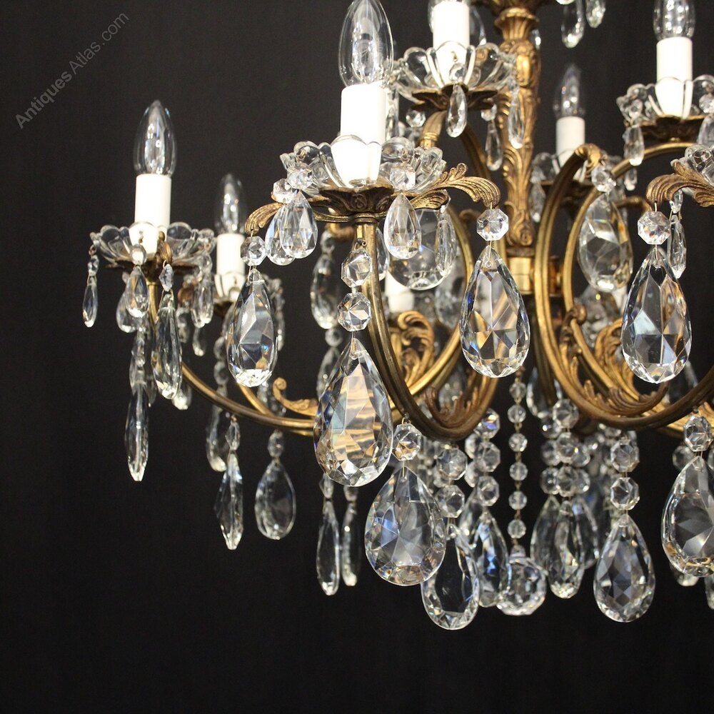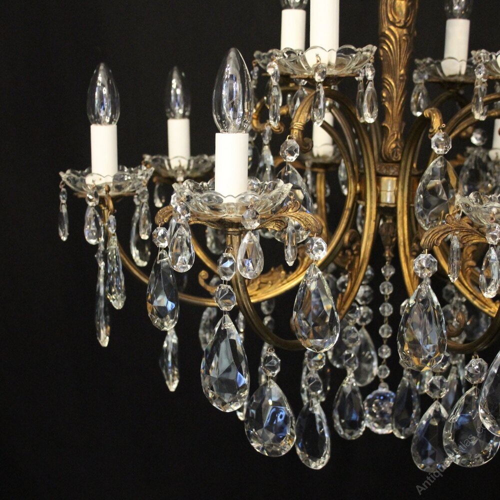 A French gilded bronze and crystal 12 light double tiered antique chandelier, the 8 and 4 leaf clad scrolling arms with glass bobeche drip pans, issuing from a tapering foliated central column with scrolling leaf canopy, decorated overall in faceted crystal pendants and having the original chain and ceiling rose. Fully rewired and PAT tested. All our chandeliers come with ceiling fixings and spare bulbs.