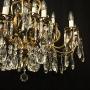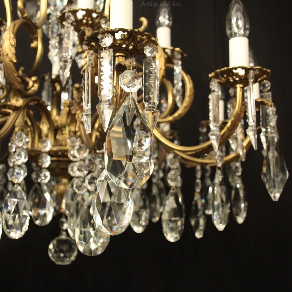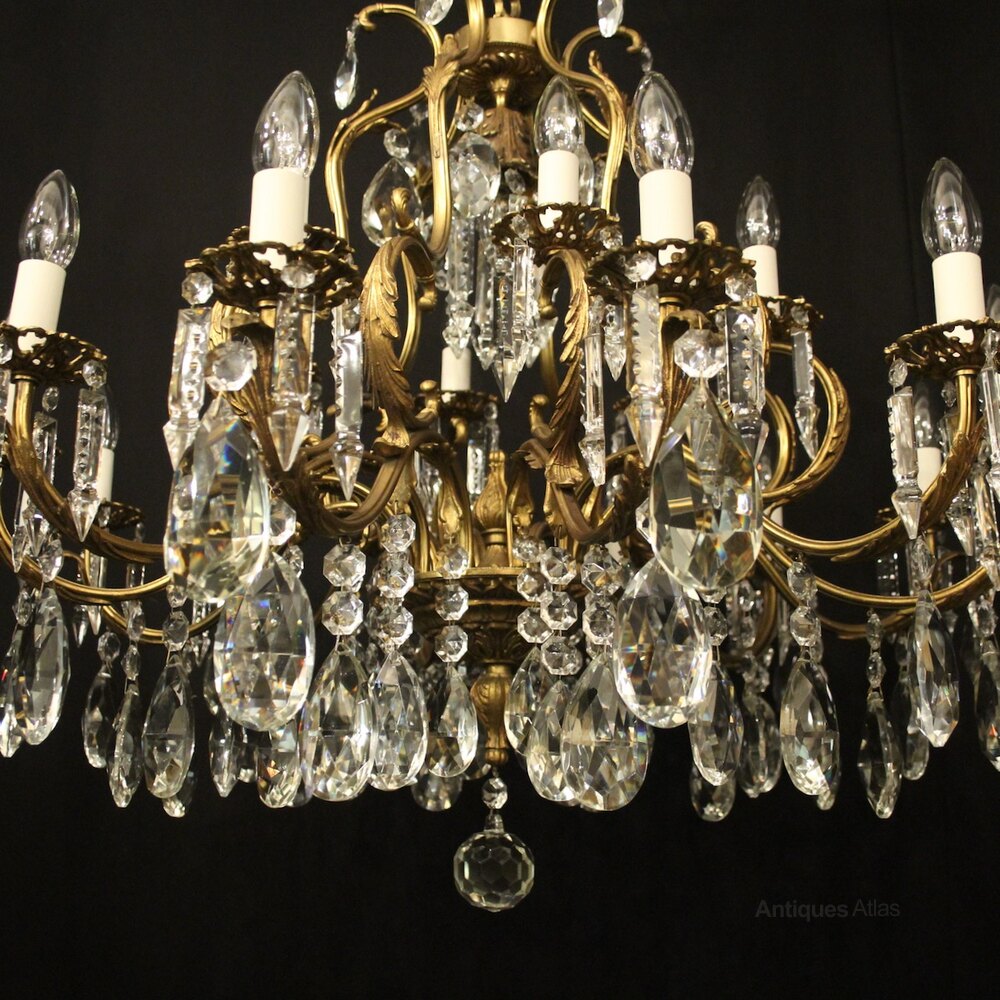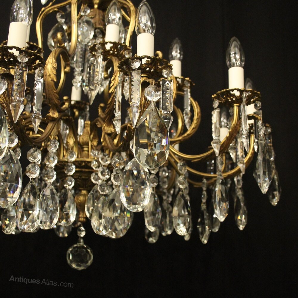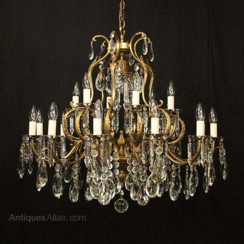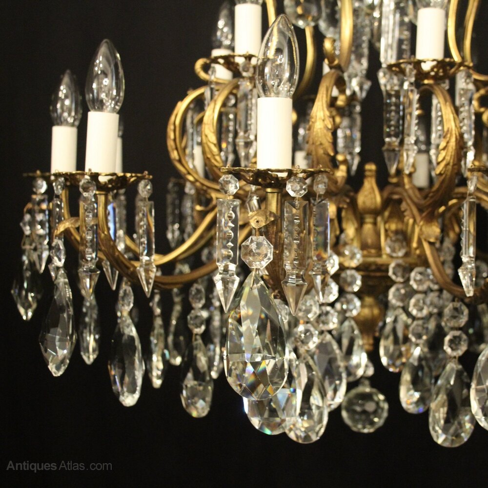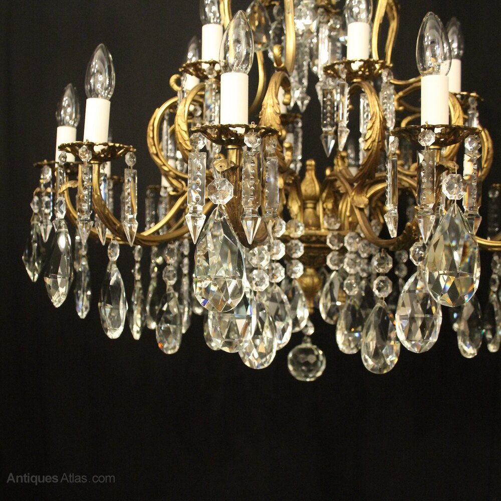 A French gilded brass and crystal 19 light double tiered antique chandelier, the 12 and 6 tiered leaf clad scrolling arms with pierced circular leaf bobeche drip pans, issuing from a issuing from a cage form interior with a single inverted light fitting, decorated with faceted crystal pendants and having the original chain and ceiling rose. Fully rewired and PAT tested. All our chandeliers come with ceiling fixings and spare bulbs.